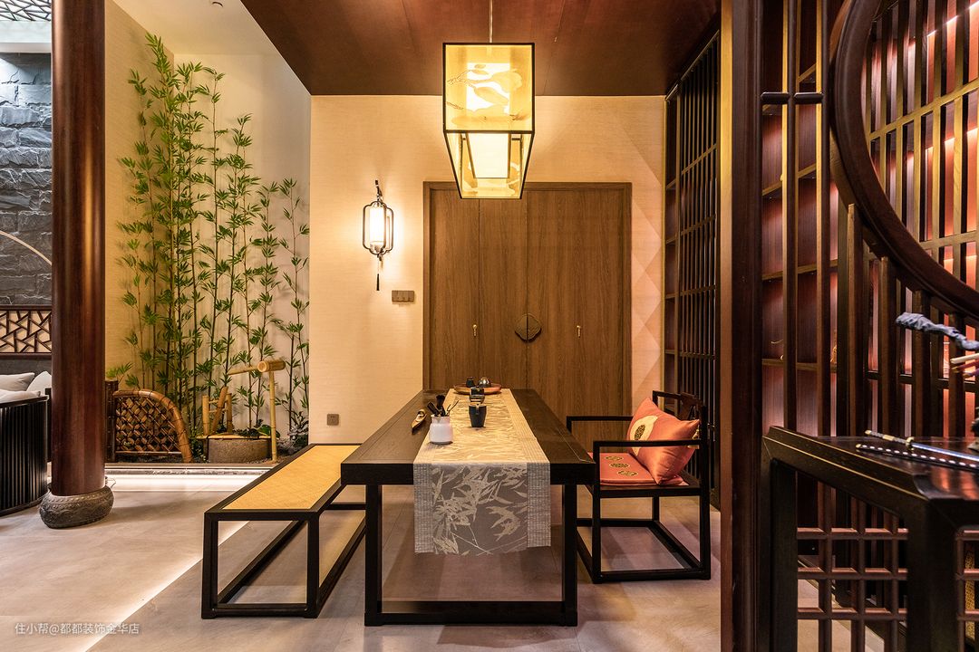 负一楼的禅茶室与会客厅,隔而不断,气韵相通,微弱的地台高低差自然的将屋主的专属品茶空间和会客厅两个区域稍作区隔,让空间看起来更宽敞。 暖红调的灯光布局,让人由内而外的感受到茶室的静谧安宁,胡桃木色定制柜体搭配黑檀木茶桌茶椅,实木自然的纹理搭配黄色薄纱吊灯,空间立显高级奢华,鲜明的层次,带来视觉的舒适,仿佛来到了茶具展览馆。 茶室还运用了细高的绿植作为点缀,给室内空间带来自然气息,元气满满的绿色,能够打破茶空间厚厚的沉闷,空间更显灵动。 方中带圆的中式屏风,链接玄关空间的同时又保证了私密性,闲暇时,闭门可独饮成欢,一桌数椅,足以容纳各方好友,沏上一壶茶,谈天说地,畅意自在。