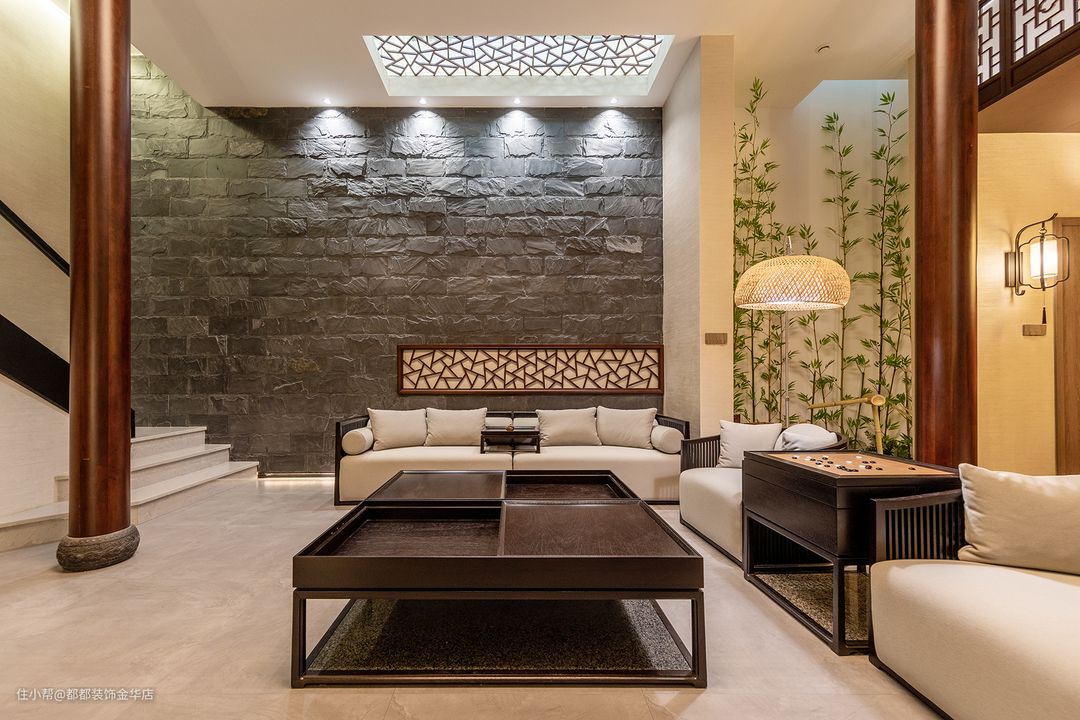 设计师借用中国园林的移步换景手法,每一处目光着落点都可以是一幅充满中式韵味的画面,给人一步一景的惊喜。 灰色大理石地板与清一色古典木质家具,取材于自然呈现清新纯粹的空间质感,中式石砌背景墙体现了传统与现代的有机结合,呼应了整体风格,又满足了现代居住的需求。 电视墙面以山水国画为主,丹青妙笔描绘出的高山湖泊,清波万顷,当一袭碧色于水中渲染,姿态变幻,勾勒出生活的惬意纯净,禅意花瓶搭配黑胡桃木电视柜给人—种贵气、雅致的感觉。 业主希望回到家是放松安静的一个状态,空间多以自然材料,绿植妆扮,给人以自然零距离感,软装上除了实木家具,加入一些中国画、瓷器、盆栽、石墙等一些中式元素进行装饰,在点线、面的设计法则下整体空间既和谐统一,又不失趣味。 精雕细琢的镂空压花,严谨的构图和线条,以大气的棕红色家具为主体,搭配米色沙发垫,让整个空间大气与灵动兼具,身处其间仿佛置身于古代的大户人家。 我们生活在这一片灯红酒绿中,繁华,热闹,容易迷失心的方向、忘记初心;回到家中与家人来上一盘围棋,片刻的归与居是一种慰寄… 春生夏长,寒木春华,四季在窗外交替轮换,别墅装修在设计师的精心布局下将空间放大,一张多人沙发,几束绿植,一个下午,享受简单却久违的幸福。 地下室客厅的光源主要来自于屋顶的采光井,院子里的光影惊艳了时光,屋顶上规整的瓦片,其简单的造型在微妙的变化中流露出清雅的魅力,美得那么低调,在不经意间吸引着目光。 天井旁的假窗让人的联想到外面不同的世界,古典的中式镂空窗在视觉上制造空间的延伸感,温润的实木雕刻承载着飘逸酣畅的精细纹理,韵味悠长。