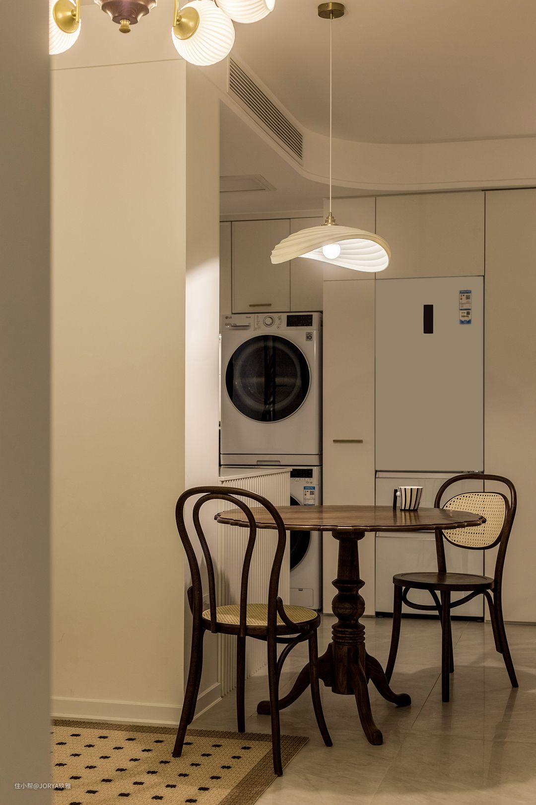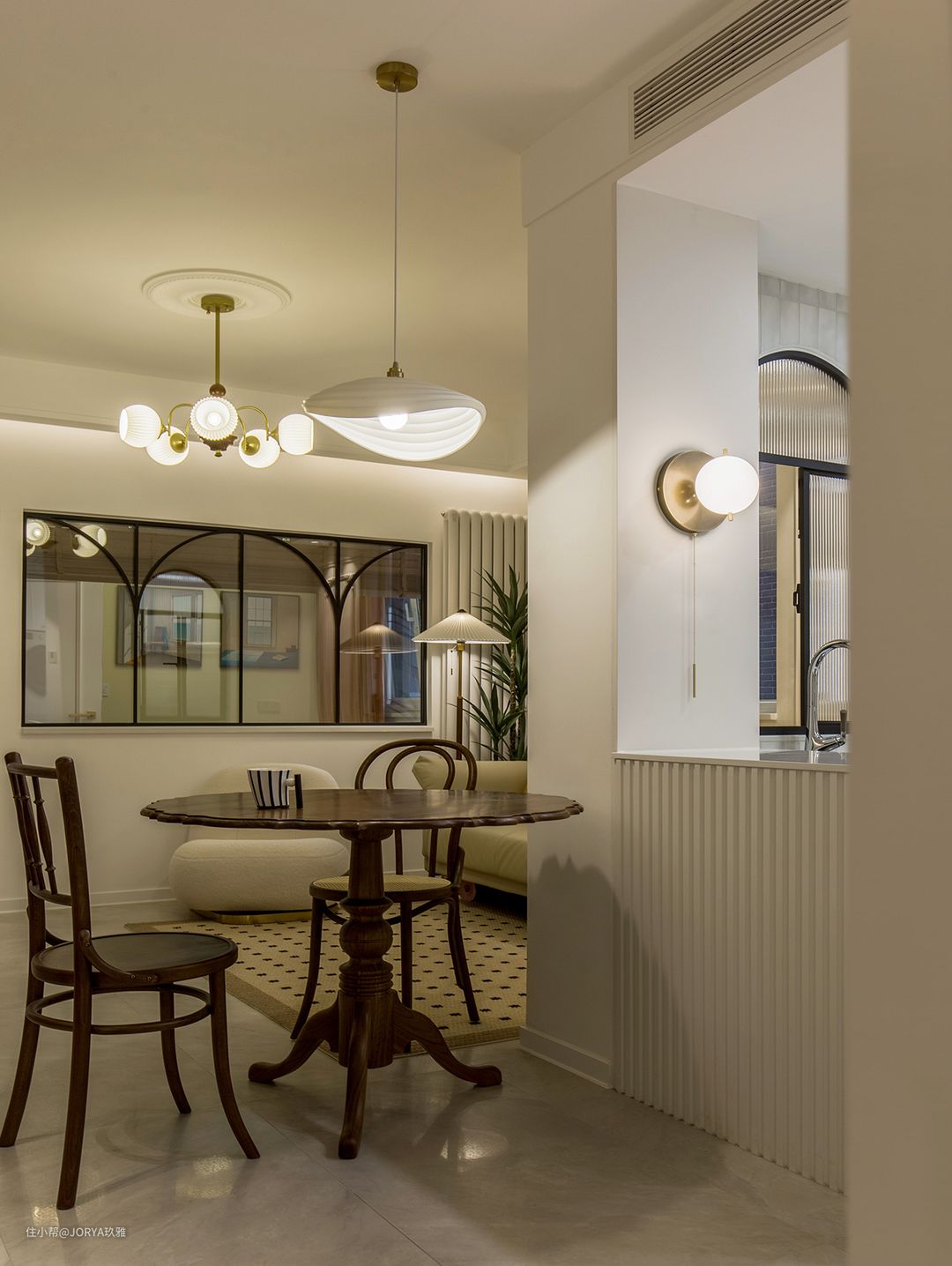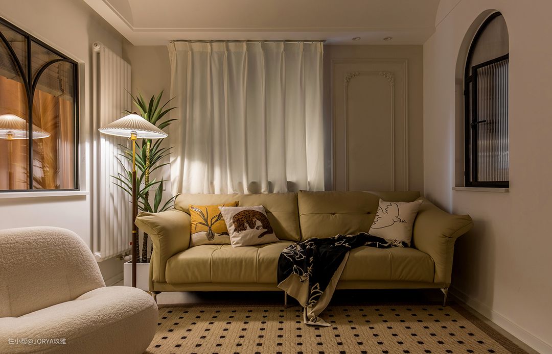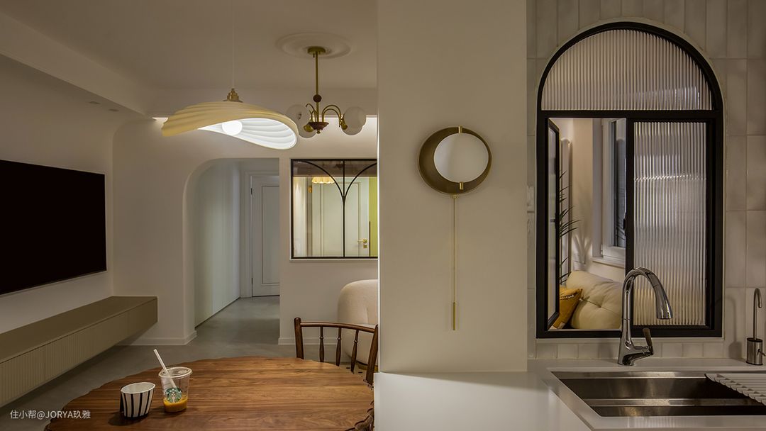 法式元素:厨房和次卧开窗,都用了半圆造型;中岛台上方的壁灯,餐厅和客厅吊灯;石膏灯盘,这些都是法式元素的点缀。
