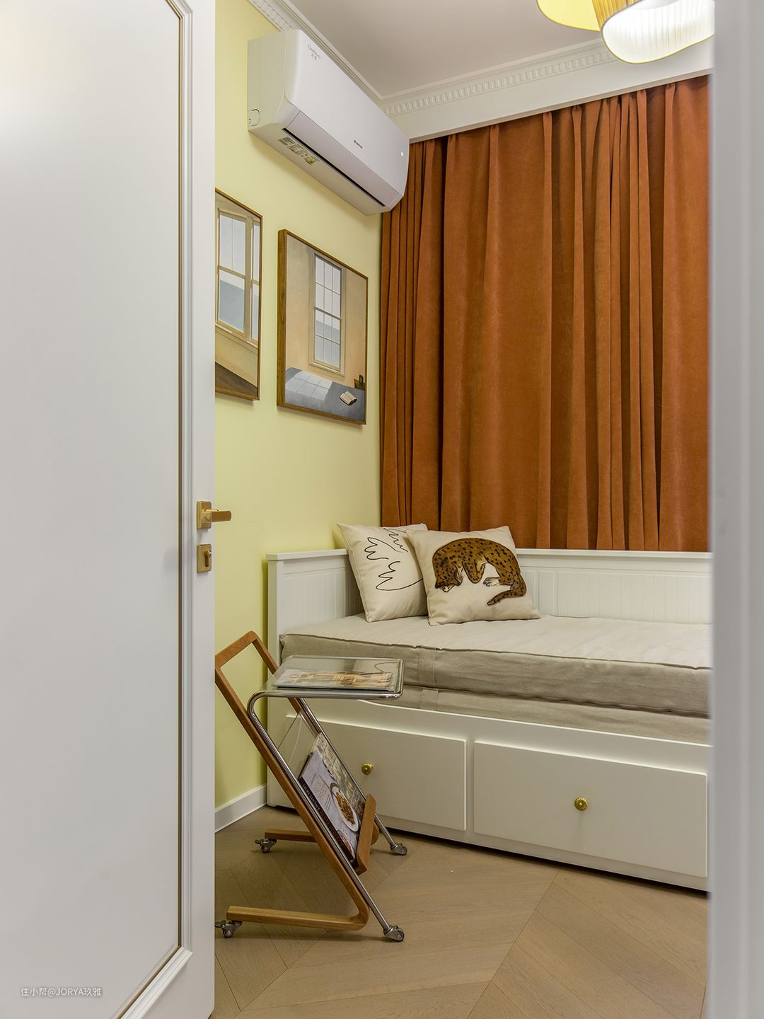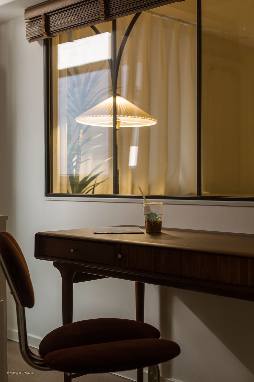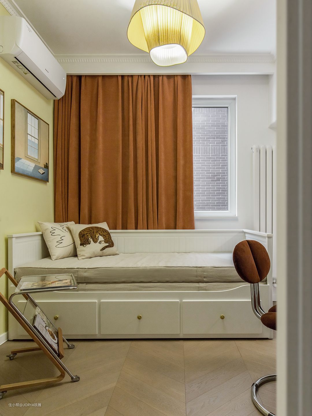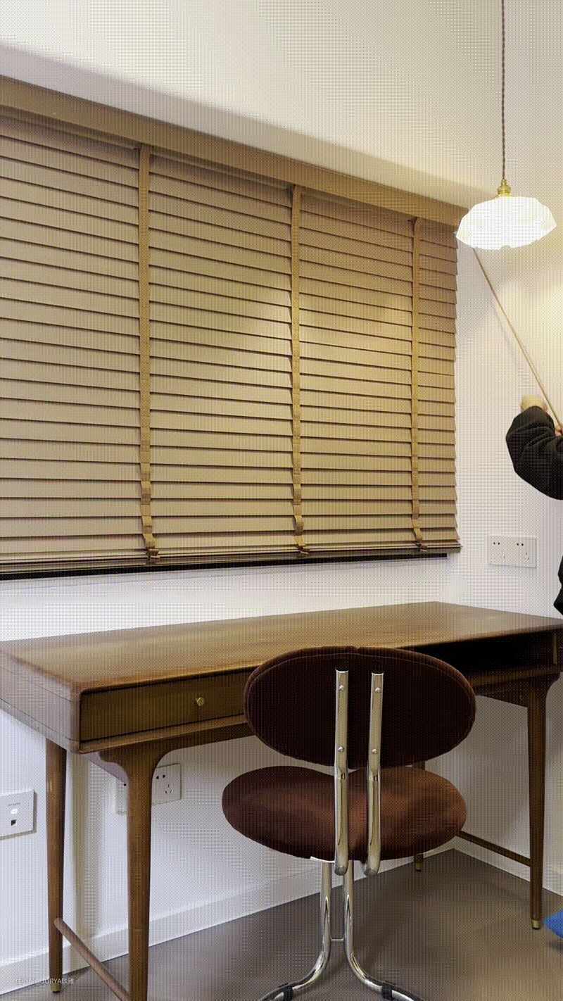 次卧为多功能,平时做书房,父母来了变卧室,所以配了推拉床。 次卧的隔窗,是不能打开的,只能透光,配了实木百叶帘,有人临时居住时,放下来增加私密性。