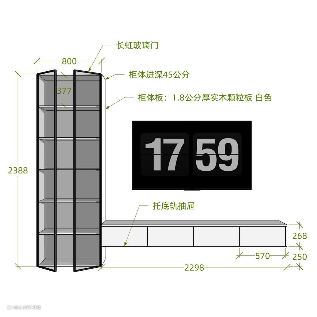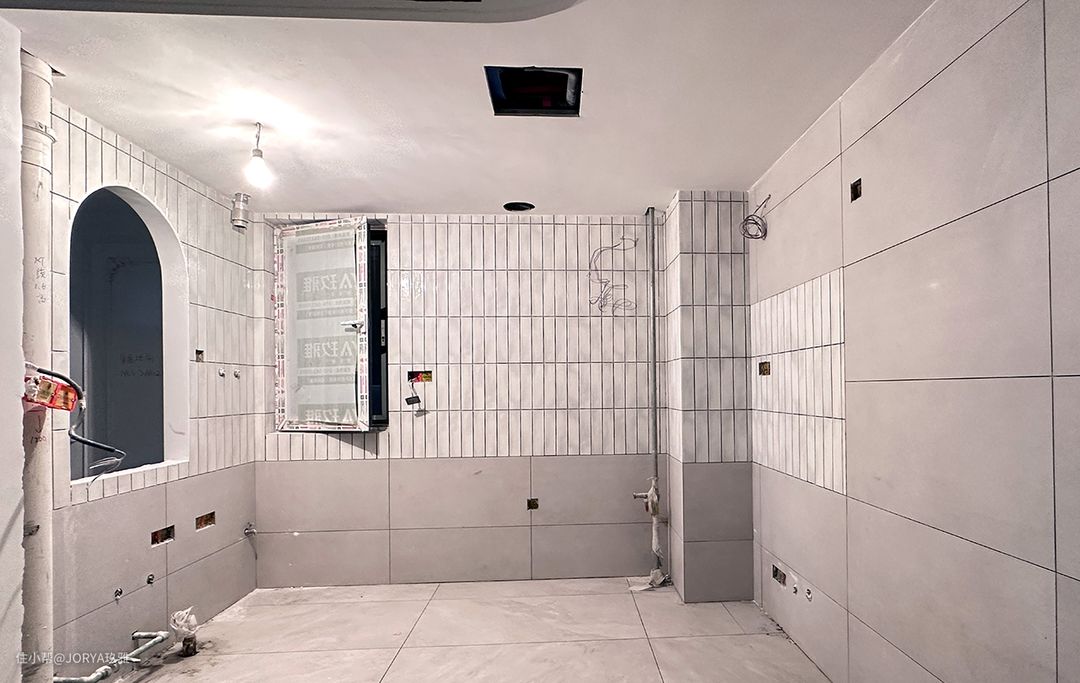 次卧的黑框玻璃,用的铁艺方管(2.5*5cm)做外框,夹长虹玻璃(5+5毫米双层夹胶玻璃),在玻璃上贴半圆造型(1.5*1.5cm)。开窗尺寸:长2米,高1米。 厨房的窗户,用铁艺方管(2*4cm)做外框,顶部做半圆造型。两扇平开窗,打开可以与客厅的家人交流,同时也能通风换气。 新建弧形墙洞,兜住走廊储物柜。柜子宽度2.3米,进深60公分,储物量为3.54立方。