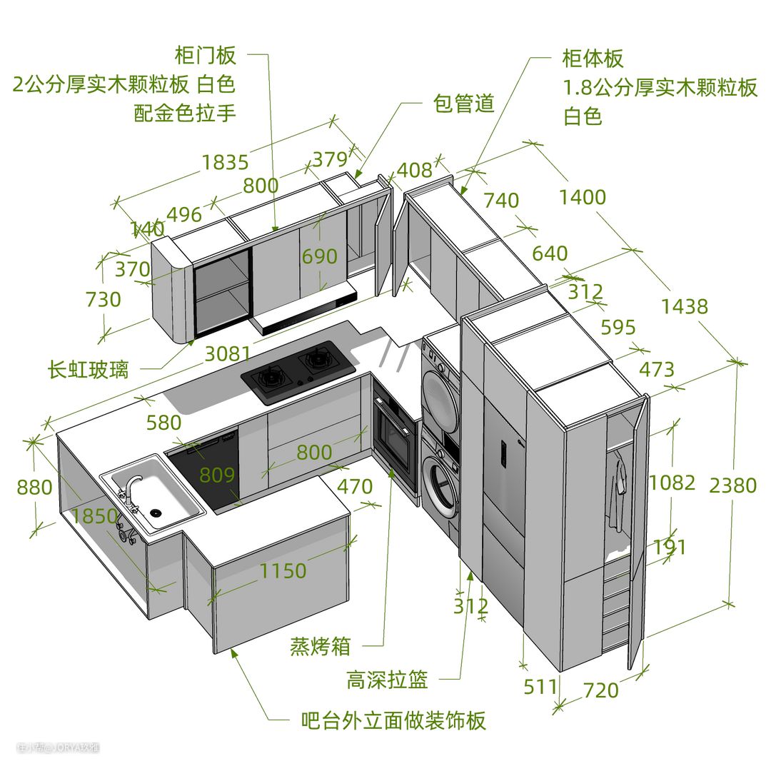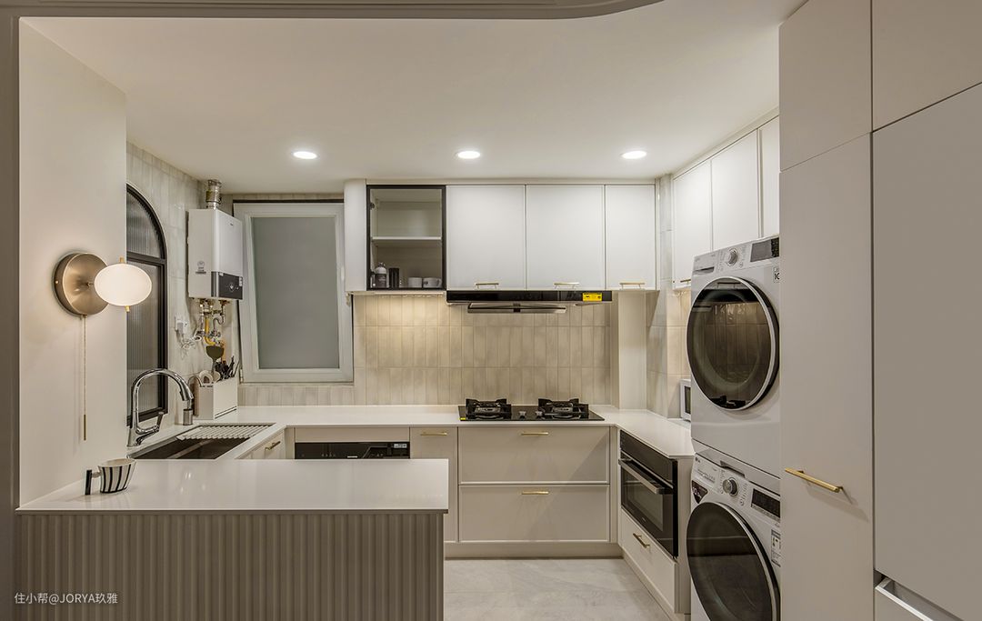 厨房整体也是浅色调。橱柜柜门选用了奶白色,四周凹边款,配金色的拉手,稍显奢华。相较于反弹器柜门,这种拉手款更可靠。墙砖选用了订制出口系的暖灰色小条砖,尺寸为7.3*30公分,每一片花色都不一样,很有质感。 贴砖省钱法。在厨房,能看到的地方贴好一些的砖,被橱柜遮挡住的地方,用一般的砖(商家也给起了个好听的名字,叫隐蔽砖。),这是通用的厨房贴砖法。 可不能小看这个差价,以这个厨房为例,铺贴面积是20平米,如果全用小条砖(每平160元),那砖就是3200元,这还没算贴小砖瓦工师傅收费也高,但如果只在裸露的地方贴这款小砖,那就是6平米,砖钱948元+隐蔽砖840元(60元一平,30*60公分的规格)=1788元,能省接近一半呢。 中岛台。厨房增加了中岛台,长度1.1米,宽度44公分,内部是方正的箱体,可以放锅一类的大件。岛台高度与其他柜体一致,都是88公分。2公分厚的台面连通起来,覆盖所有地柜,看起来很整体。 家政区。高柜区域,嵌入两台洗衣机作为家政区,这样下班回家做饭时也能把衣服洗了,家务动线最为节省。