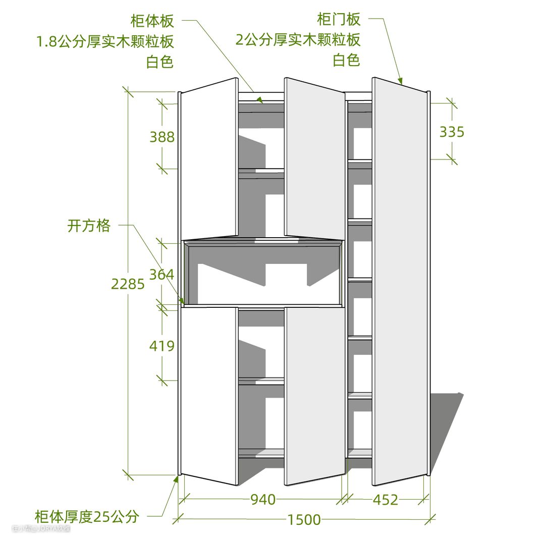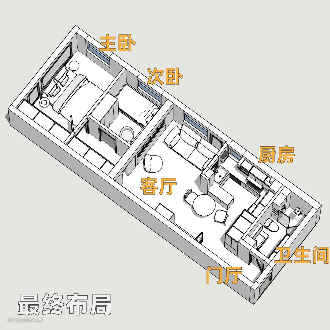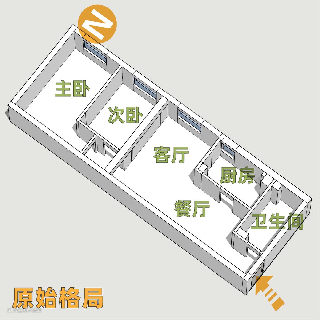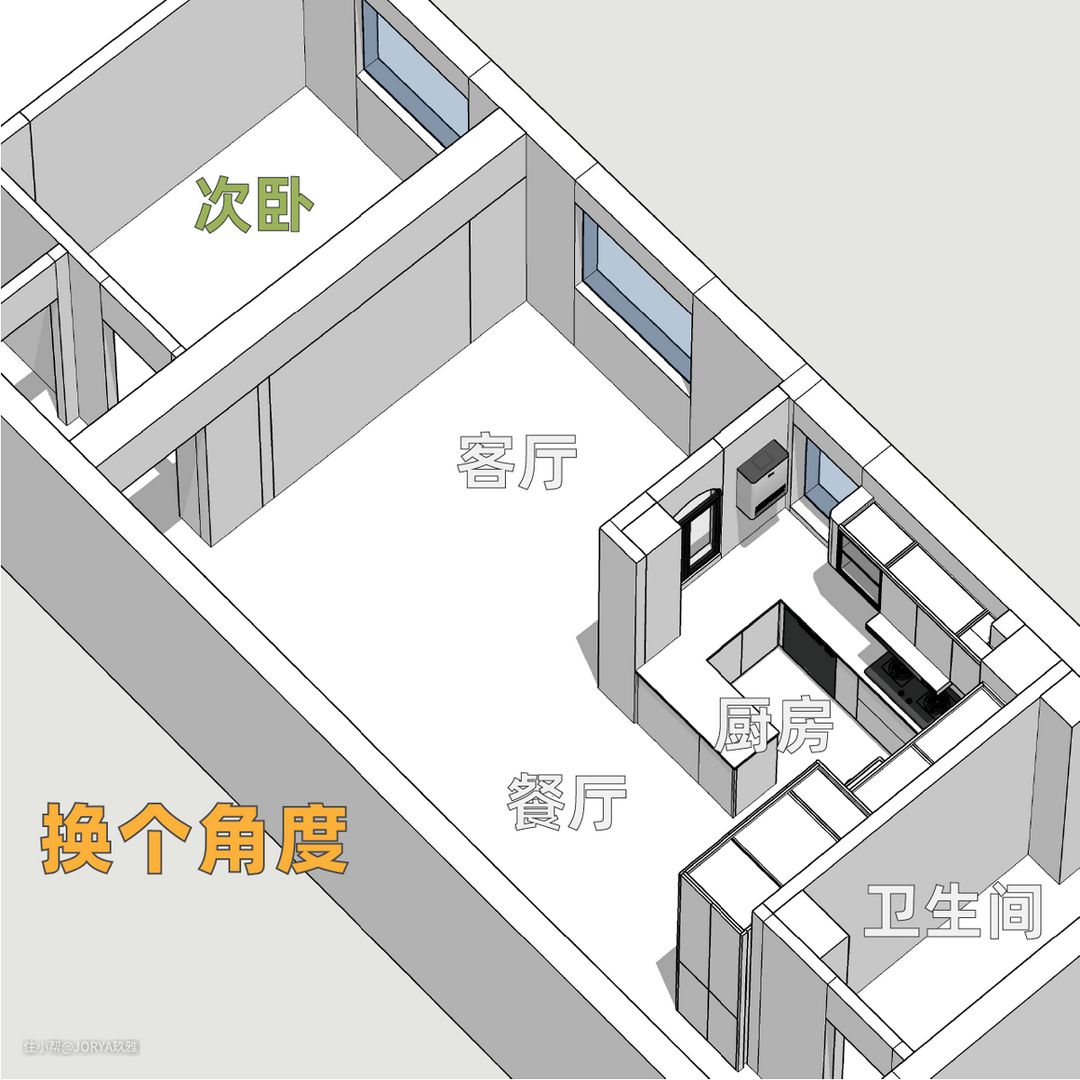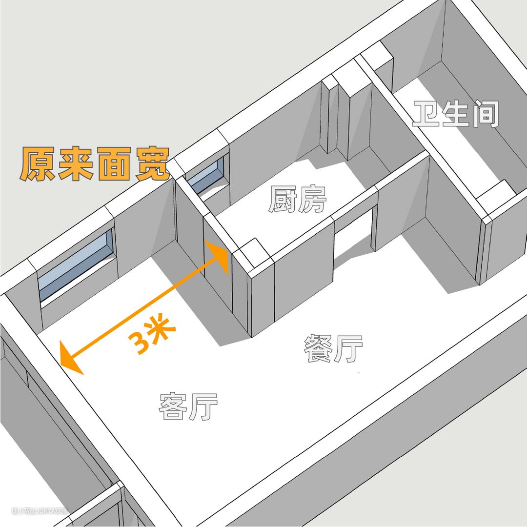 原始户型最大的问题是采光不理想。虽然有东向的4个窗户,但都有1米高的窗台,进光量不足。此外,屋主对储物也有很高的需求。看设计师如何施法。 1、增大面宽,相互借光。 A、开放式厨房。厨房变为开放式,客厅与厨房打通,面宽从3米变为6.2米。 B、厨房开窗。这面墙靠着主下水管道,不能移动,而且还要挂燃气炉(需要靠窗),所以得以保留。设计师给这面墙开窗,这样不但能借光,还能在备餐时与家人交流。 C、次卧开窗。次卧给偶尔来的客人住,平时做书房,所以也开了一面2.1米宽的窗户,与客厅和厨房相互借光,将面宽进一步加大到8.9米。这个宽度足能放一辆厢式载货车。 2、门让一让,柜子更好放 A、卫生间门让一让,后面放薄柜。 原始卫生间门往中间移动,把门后到墙的距离从原来的13公分,变成25公分,这样就能放下一组 1.5米长,25公分进深 的薄柜,打造女屋主的面膜专属囤货区。门也换成了长虹玻璃金属门,相较于传统木门,没有门套,不会再吃门后的靠墙距离。 B、主卧门让一让,后面放两组衣柜。 (1)主卧变方正。主卧门移到与次卧隔墙平齐,将原来的“刀把形”房间,变成方形。 (2)压缩次卧,走廊加宽。原来走廊1.1米宽,仅做过道很浪费,加宽到1.65米,这样能放下门和一组标准深度的衣柜。 (3)主卧门后放衣柜。主卧门位移,在门后,走廊和主卧内,分别布置两组标准衣柜(进深60公分)。 C、次卧门让一让,两边好布置。 次卧门移到中间,这样门后一边放书桌(1.5米宽,60公分宽),一边放衣柜(1.4米长,55公分进深),布局更合理。