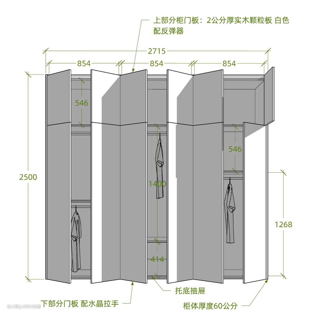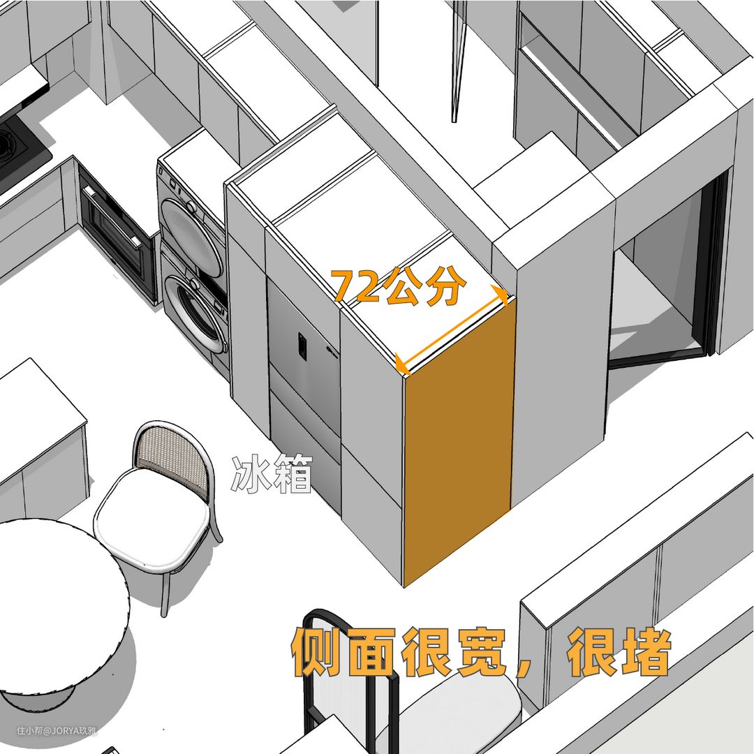 玄关看似简单,但功能完备。 存鞋:进门左手边,一个1.5米宽的成品鞋柜,4层,足够收纳2人平时穿的鞋。 换鞋:鞋柜旁边是一个小巧的换鞋凳。 挂衣:与鞋柜对着的就是衣柜,高2.4米,宽70公分,分为上下两层,上面挂衣,下面放穿不到的鞋子。 这个玄关衣柜其实是橱柜的一部分。 高柜要嵌入冰箱,进深达到72公分,如果按照常规布置,橱柜侧面看起来会很堵。但如果将最把头的高柜,从侧面使用,面向门厅,当作衣柜,这样不但补全了门厅的功能,而且从各个方向看,都很美观。 从里面看向玄关,这个衣柜侧面也很nice。