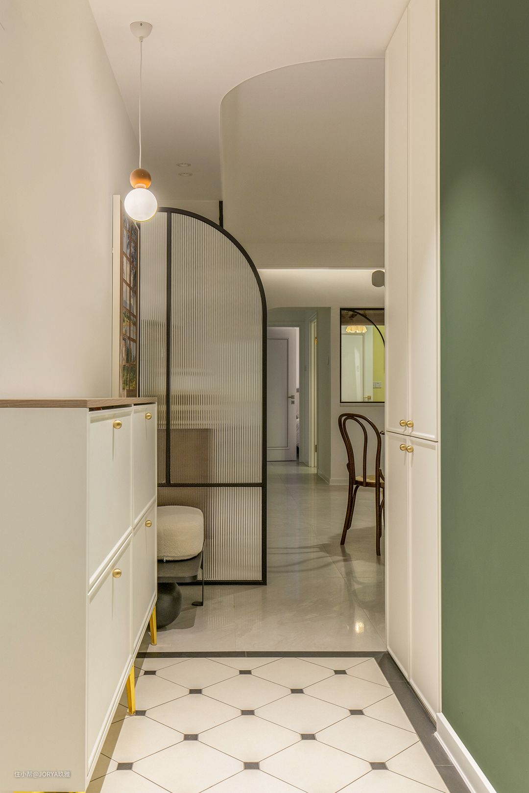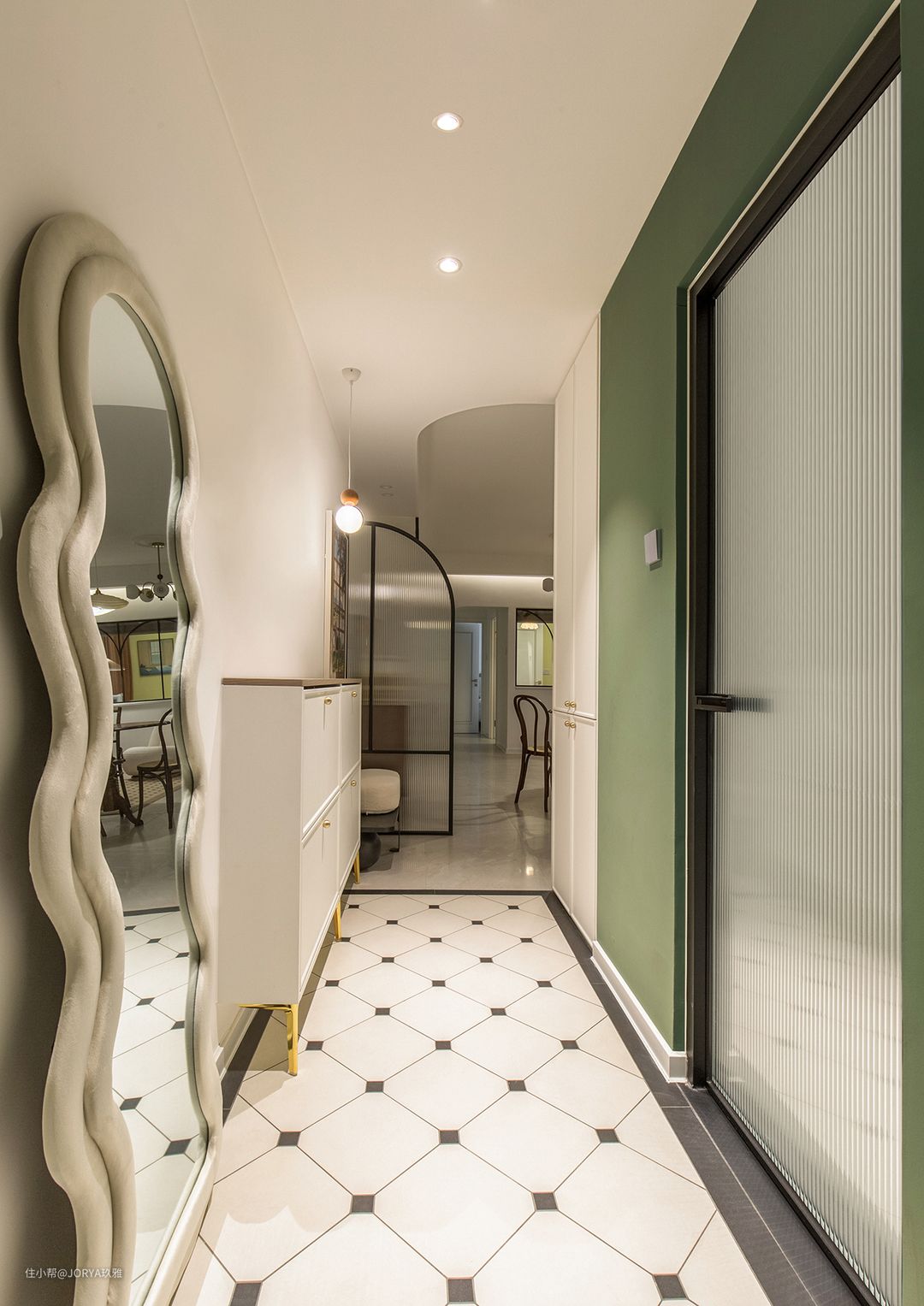 法式元素点缀。门厅远离光源,因此采用浅色调。屋主喜欢法式,从进门就能感受到它的存在:换衣镜,墨绿色墙漆、长虹玻璃屏风和地面方格砖。 菱形方格砖有一种复古的美感,配合一圈波打线,标识这是门厅区域。墨绿色墙漆用来平衡个性的穿衣镜带来的视觉不均衡感。玻璃屏风透光而不透视,避免进门一览无余。