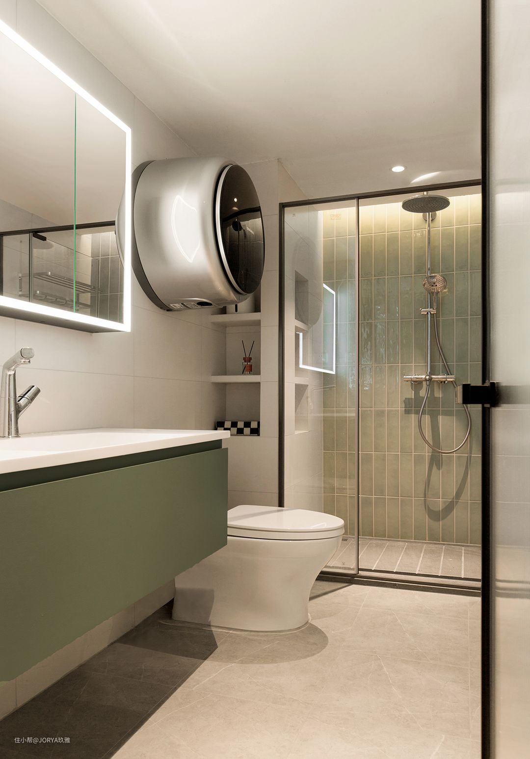 卫生间色调主打温馨,融入墨绿色来形成对比。壁龛是双向使用的,两面开洞,一面朝向淋浴区,另一面朝向马桶。 卫生间门后,屋主的专属面膜存储柜。 淋浴区地面,留了一圈4公分宽排水槽。洗澡的时候,大量水会先流到四周的槽里,再奔向地漏,而不会聚集在脚下,很干净。这样的地面需要由石材厂家去加工成成品,再运到现场安装。这样1平米见方的地面,3000元以内能搞定。 卫生间选了一面主题墙,铺贴了7.3*30公分的绿色手工小砖,是进门的第一视觉焦点,配合顶部预留的暗藏灯带,黄色的光撒在砖上,颜色会发生变化:由绿色变为黄绿,很漂亮。 -end- 案例介绍完毕