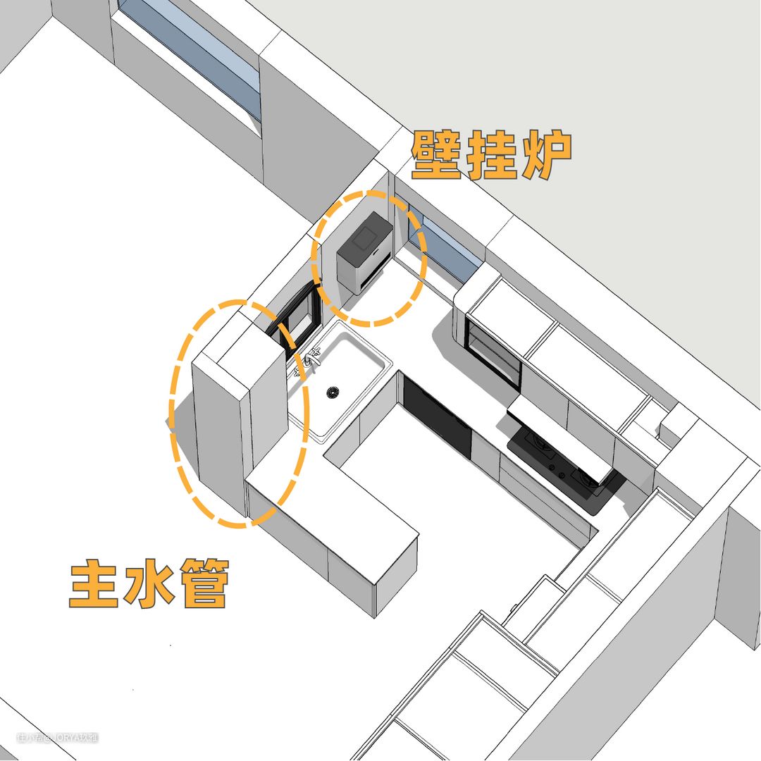 空调内机放厨房。得益于开放式厨房,中央空调的内机可以放在厨房顶部,不会影响客餐厅的高度。 房子的层高是2.67米。市面上最小的空调内机,长70公分,宽45公分,厚度是20公分,那么吊顶的高度最少也要做25公分(留5公分给安装空间和吊顶龙骨)。 本身厨房也必须要吊顶,藏油烟机的管道,也需要至少25公分的厚度,把中央空调内机放进去,一举两得。