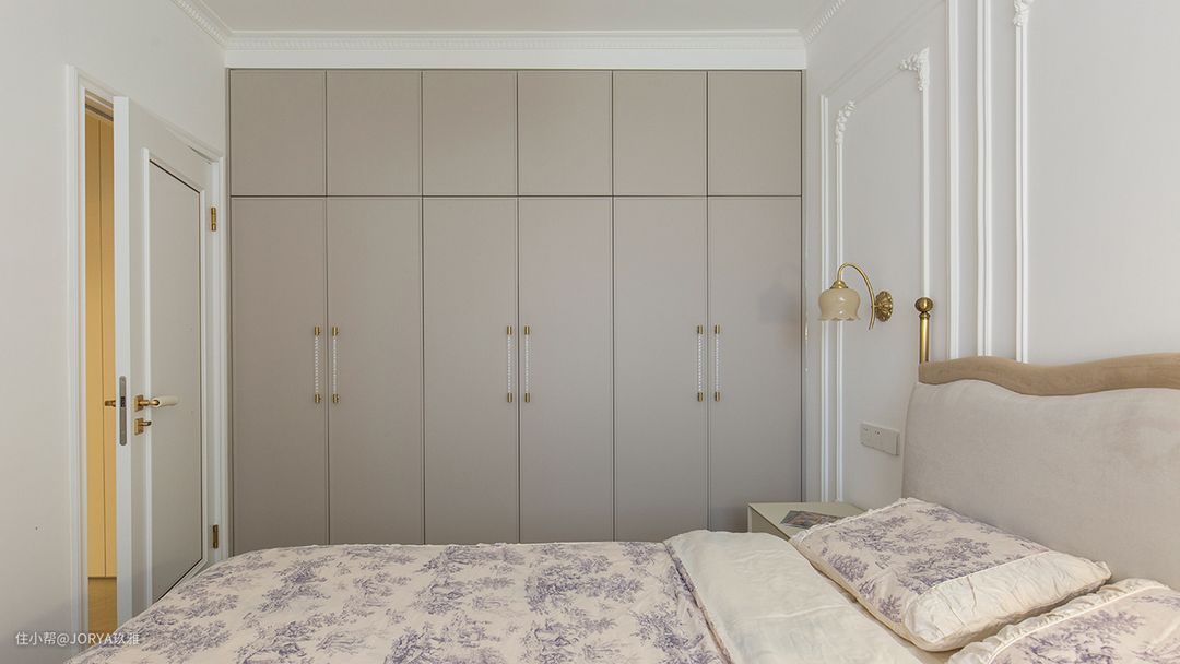 主卧的法式味道更浓一些,体现在墙上的石膏线条,衣柜门把手、壁灯和床头造型。 主卧和次卧,都铺贴了实木复合地板,人字形铺,单片尺寸:50.8*127*1.5cm。 主卧衣柜,宽度2.7米,高度2.5米,储物容积:4.4立方米。分为上下两部分,下部分柜门高频开合,配拉手;上部分低频,配反弹器。