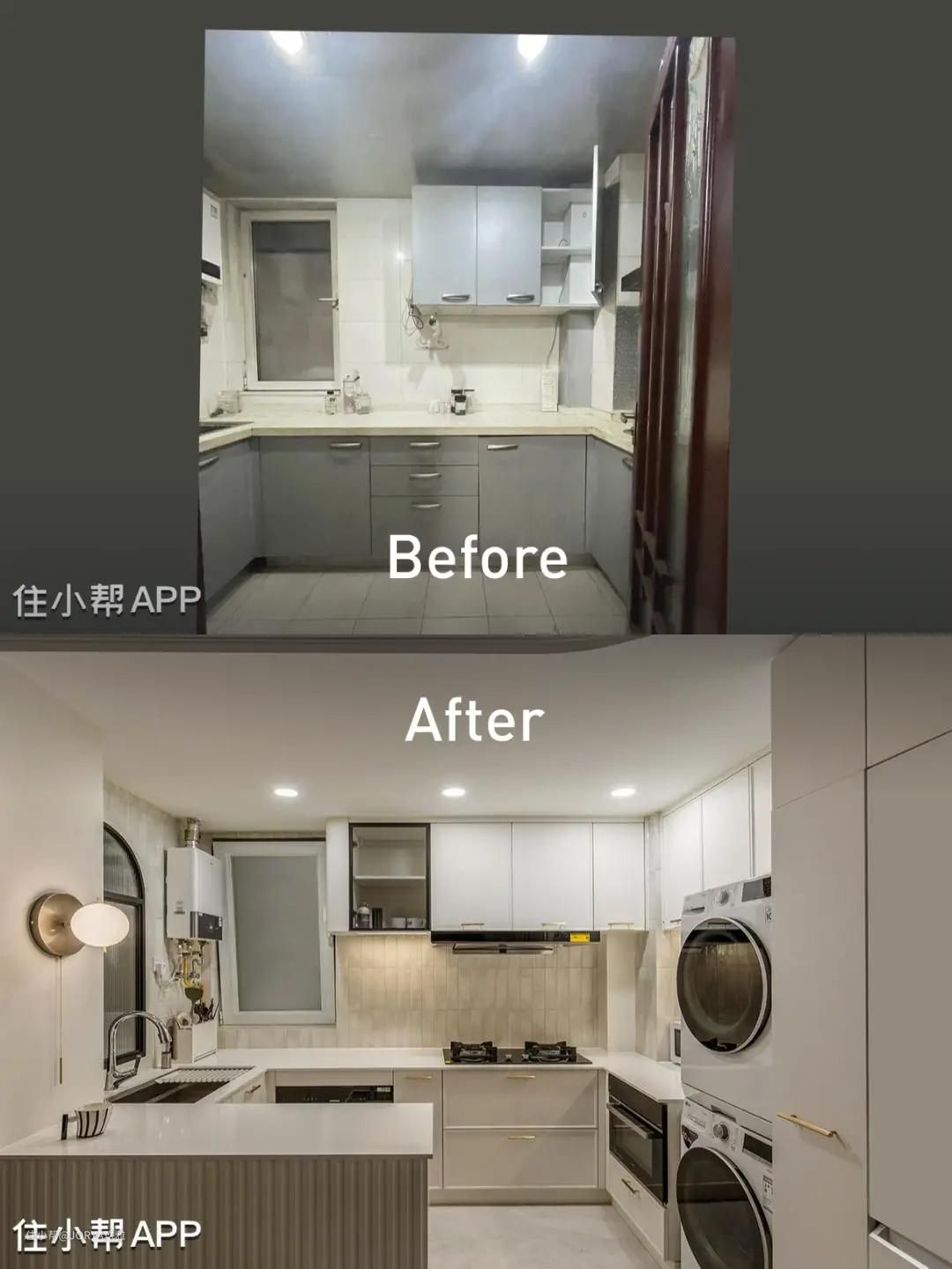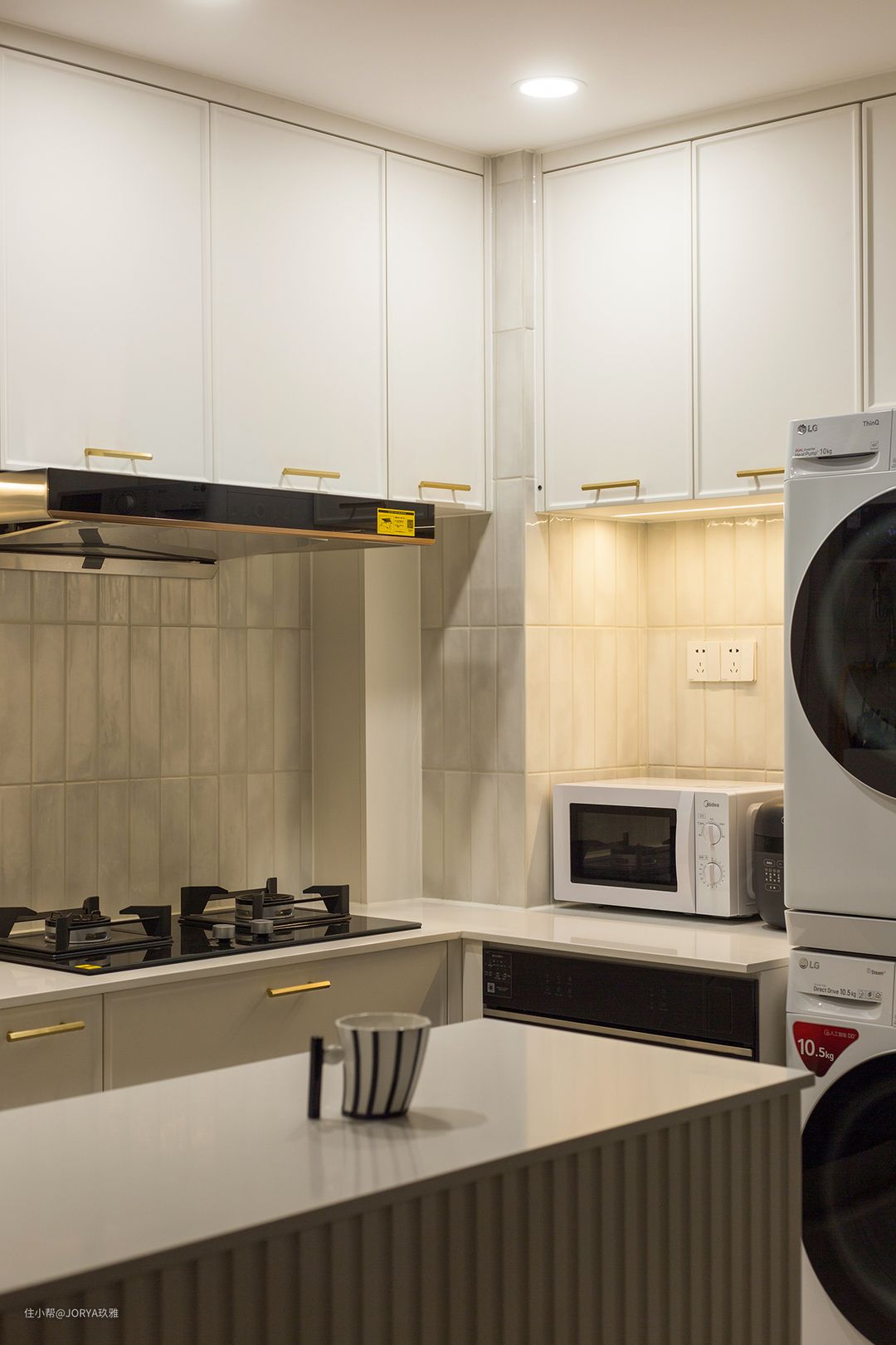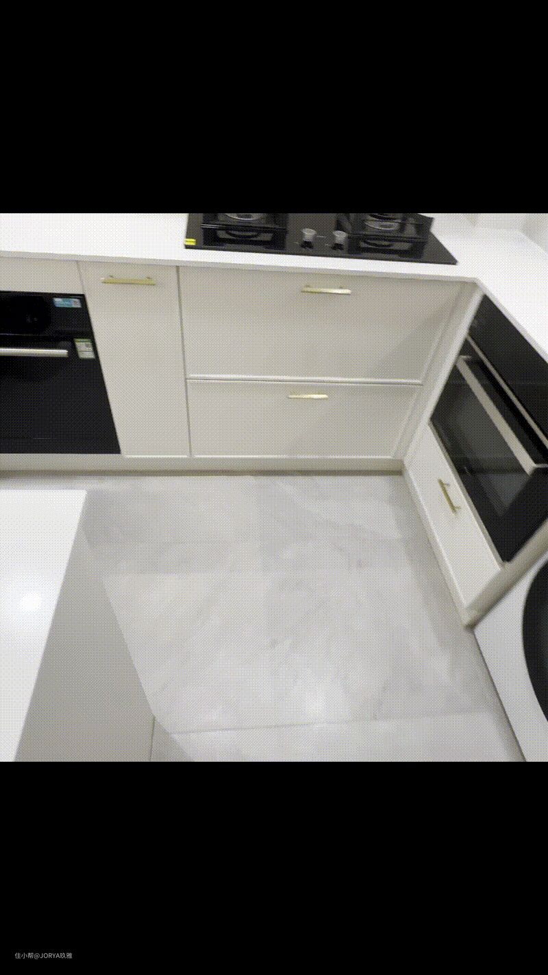 厨房整体也是浅色调。橱柜柜门选用了奶白色,四周凹边款,配金色的拉手,稍显奢华。相较于反弹器柜门,这种拉手款更可靠。墙砖选用了订制出口系的暖灰色小条砖,尺寸为7.3*30公分,每一片花色都不一样,很有质感。 贴砖省钱法。在厨房,能看到的地方贴好一些的砖,被橱柜遮挡住的地方,用一般的砖(商家也给起了个好听的名字,叫隐蔽砖。),这是通用的厨房贴砖法。 可不能小看这个差价,以这个厨房为例,铺贴面积是20平米,如果全用小条砖(每平160元),那砖就是3200元,这还没算贴小砖瓦工师傅收费也高,但如果只在裸露的地方贴这款小砖,那就是6平米,砖钱948元+隐蔽砖840元(60元一平,30*60公分的规格)=1788元,能省接近一半呢。 中岛台。厨房增加了中岛台,长度1.1米,宽度44公分,内部是方正的箱体,可以放锅一类的大件。岛台高度与其他柜体一致,都是88公分。2公分厚的台面连通起来,覆盖所有地柜,看起来很整体。 家政区。高柜区域,嵌入两台洗衣机作为家政区,这样下班回家做饭时也能把衣服洗了,家务动线最为节省。