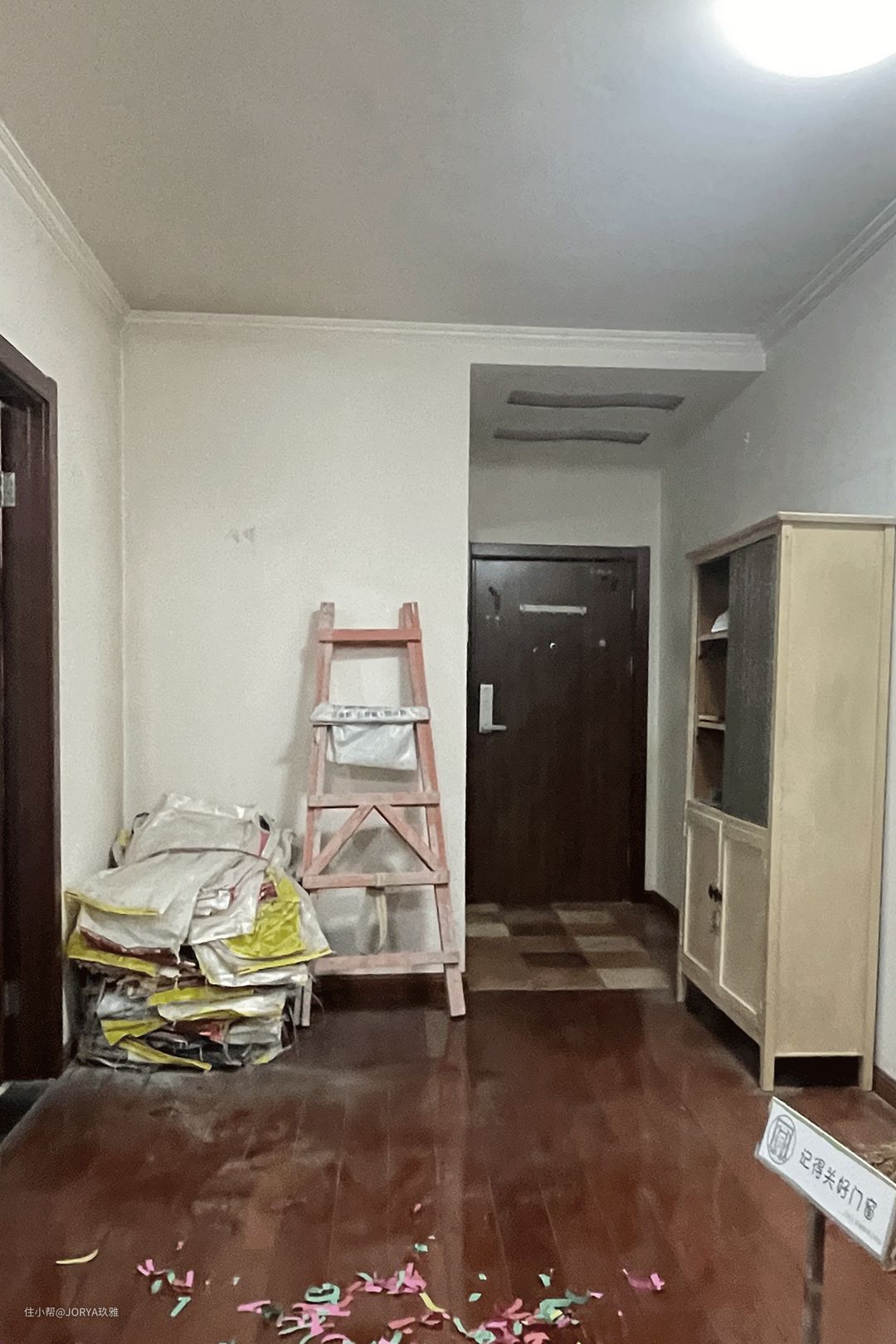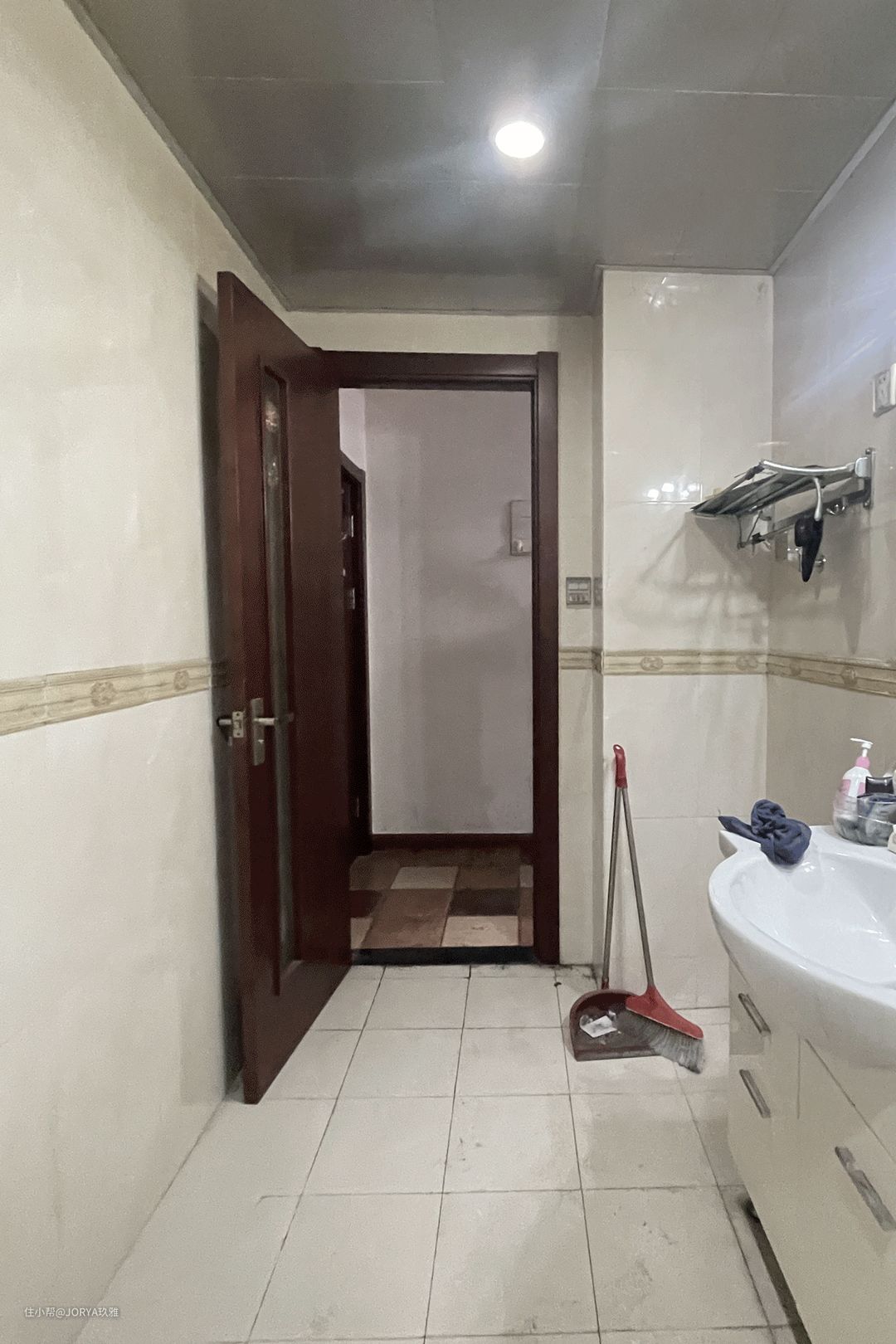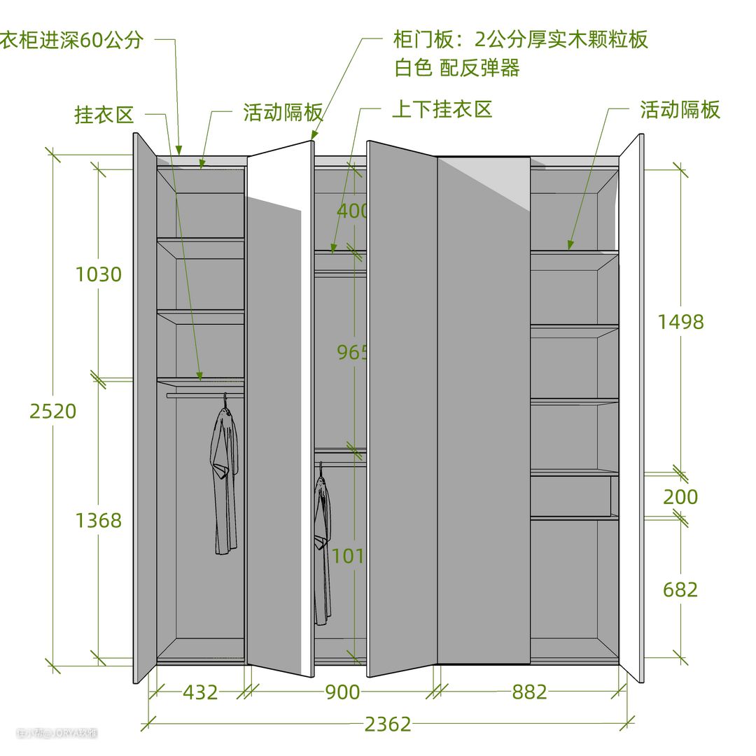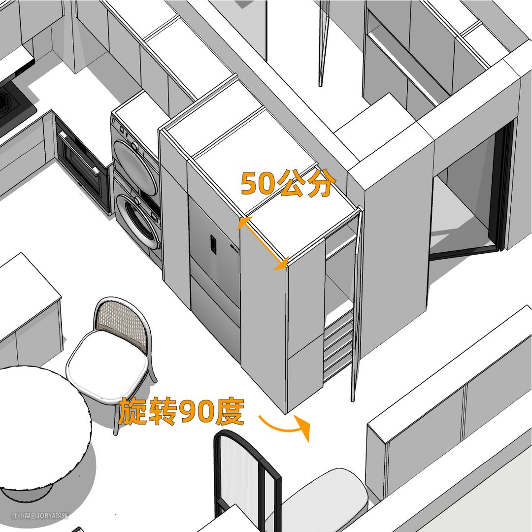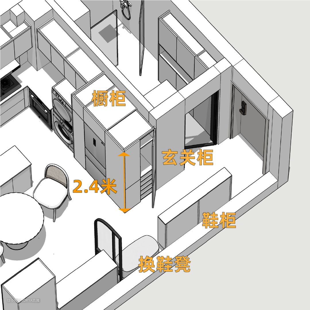 玄关看似简单,但功能完备。 存鞋:进门左手边,一个1.5米宽的成品鞋柜,4层,足够收纳2人平时穿的鞋。 换鞋:鞋柜旁边是一个小巧的换鞋凳。 挂衣:与鞋柜对着的就是衣柜,高2.4米,宽70公分,分为上下两层,上面挂衣,下面放穿不到的鞋子。 这个玄关衣柜其实是橱柜的一部分。 高柜要嵌入冰箱,进深达到72公分,如果按照常规布置,橱柜侧面看起来会很堵。但如果将最把头的高柜,从侧面使用,面向门厅,当作衣柜,这样不但补全了门厅的功能,而且从各个方向看,都很美观。 从里面看向玄关,这个衣柜侧面也很nice。