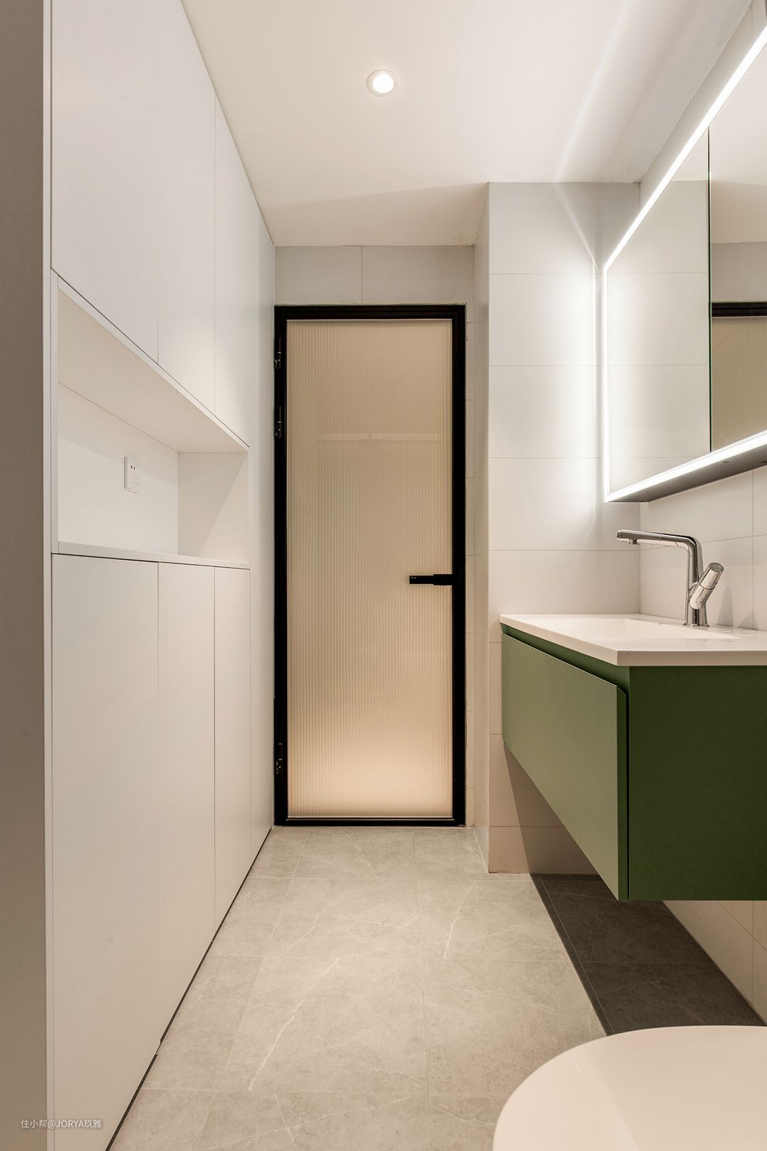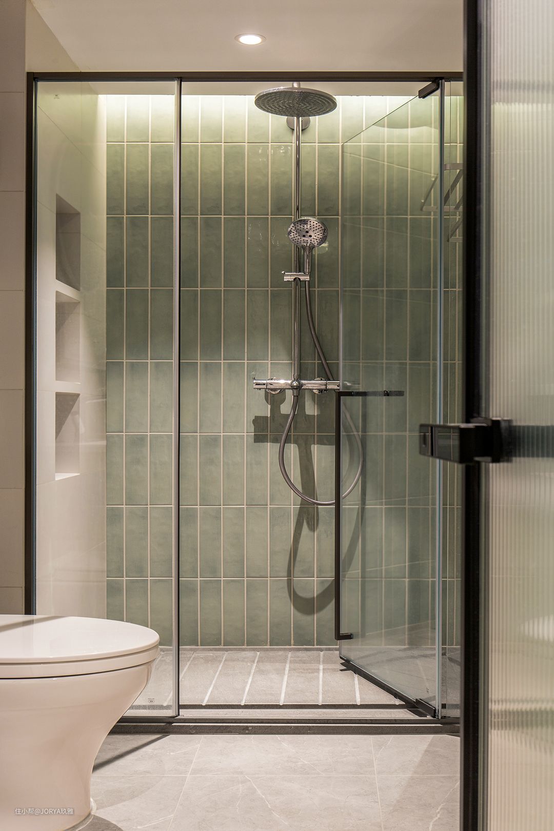 卫生间色调主打温馨,融入墨绿色来形成对比。壁龛是双向使用的,两面开洞,一面朝向淋浴区,另一面朝向马桶。 卫生间门后,屋主的专属面膜存储柜。 淋浴区地面,留了一圈4公分宽排水槽。洗澡的时候,大量水会先流到四周的槽里,再奔向地漏,而不会聚集在脚下,很干净。这样的地面需要由石材厂家去加工成成品,再运到现场安装。这样1平米见方的地面,3000元以内能搞定。 卫生间选了一面主题墙,铺贴了7.3*30公分的绿色手工小砖,是进门的第一视觉焦点,配合顶部预留的暗藏灯带,黄色的光撒在砖上,颜色会发生变化:由绿色变为黄绿,很漂亮。 -end- 案例介绍完毕