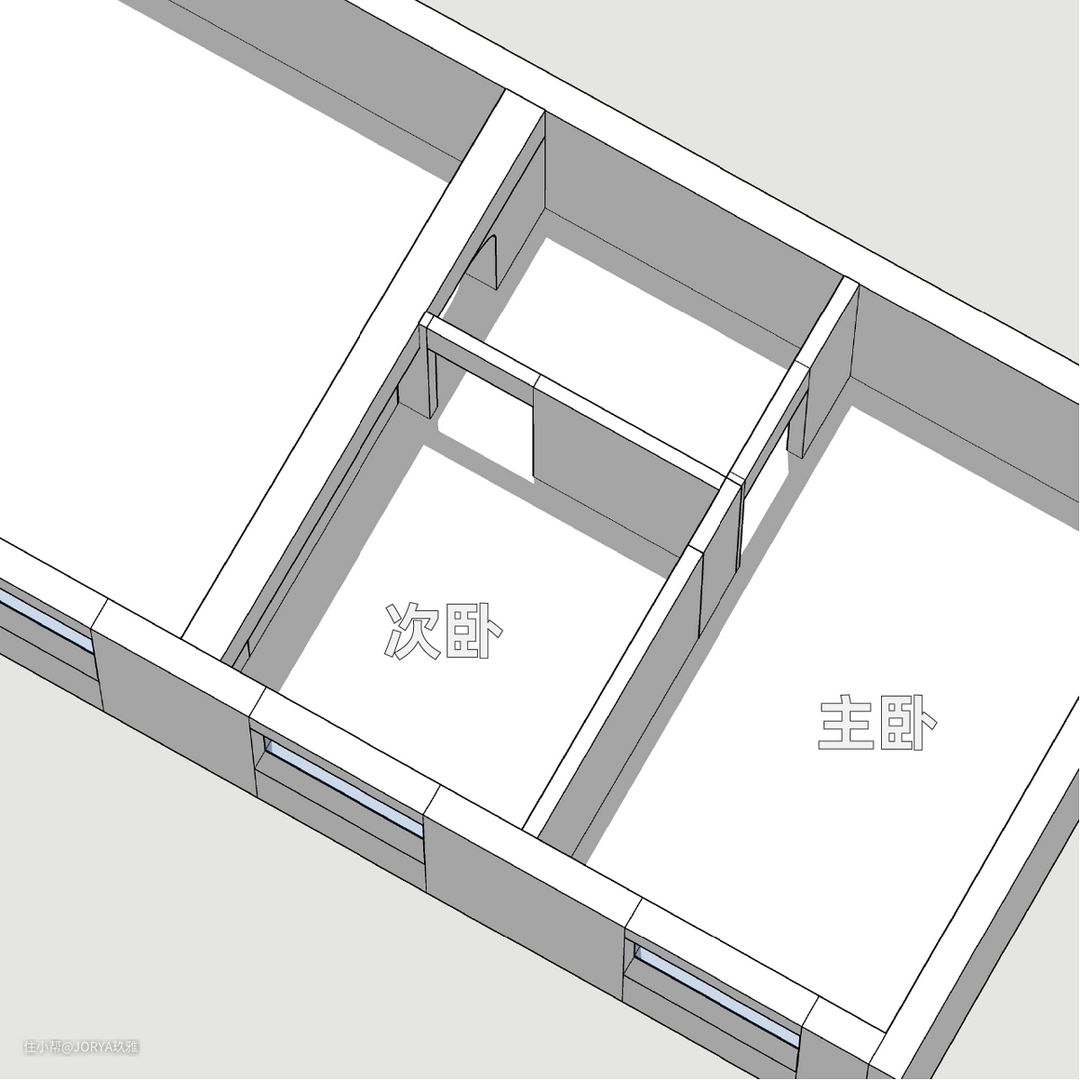 原始户型最大的问题是采光不理想。虽然有东向的4个窗户,但都有1米高的窗台,进光量不足。此外,屋主对储物也有很高的需求。看设计师如何施法。 1、增大面宽,相互借光。 A、开放式厨房。厨房变为开放式,客厅与厨房打通,面宽从3米变为6.2米。 B、厨房开窗。这面墙靠着主下水管道,不能移动,而且还要挂燃气炉(需要靠窗),所以得以保留。设计师给这面墙开窗,这样不但能借光,还能在备餐时与家人交流。 C、次卧开窗。次卧给偶尔来的客人住,平时做书房,所以也开了一面2.1米宽的窗户,与客厅和厨房相互借光,将面宽进一步加大到8.9米。这个宽度足能放一辆厢式载货车。 2、门让一让,柜子更好放 A、卫生间门让一让,后面放薄柜。 原始卫生间门往中间移动,把门后到墙的距离从原来的13公分,变成25公分,这样就能放下一组 1.5米长,25公分进深 的薄柜,打造女屋主的面膜专属囤货区。门也换成了长虹玻璃金属门,相较于传统木门,没有门套,不会再吃门后的靠墙距离。 B、主卧门让一让,后面放两组衣柜。 (1)主卧变方正。主卧门移到与次卧隔墙平齐,将原来的“刀把形”房间,变成方形。 (2)压缩次卧,走廊加宽。原来走廊1.1米宽,仅做过道很浪费,加宽到1.65米,这样能放下门和一组标准深度的衣柜。 (3)主卧门后放衣柜。主卧门位移,在门后,走廊和主卧内,分别布置两组标准衣柜(进深60公分)。 C、次卧门让一让,两边好布置。 次卧门移到中间,这样门后一边放书桌(1.5米宽,60公分宽),一边放衣柜(1.4米长,55公分进深),布局更合理。