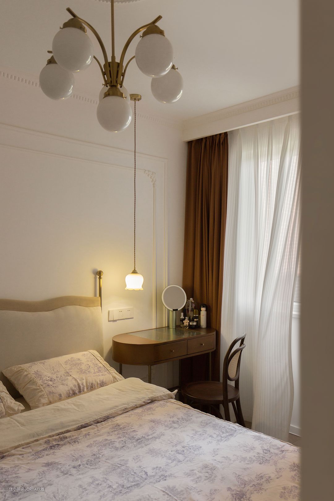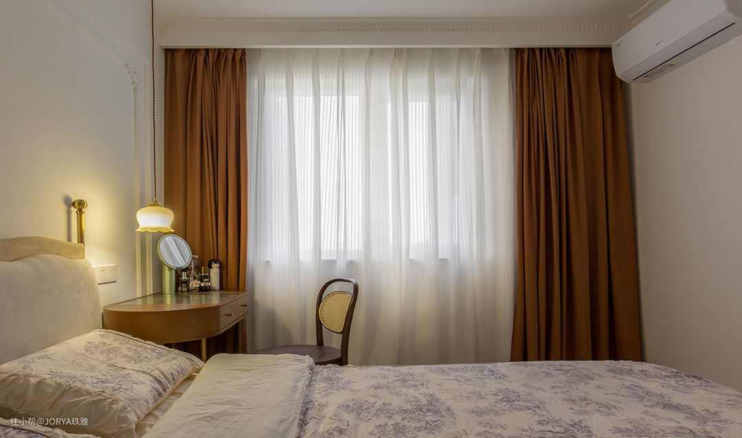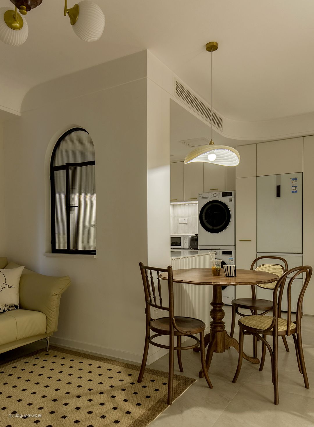 法式元素:厨房和次卧开窗,都用了半圆造型;中岛台上方的壁灯,餐厅和客厅吊灯;石膏灯盘,这些都是法式元素的点缀。