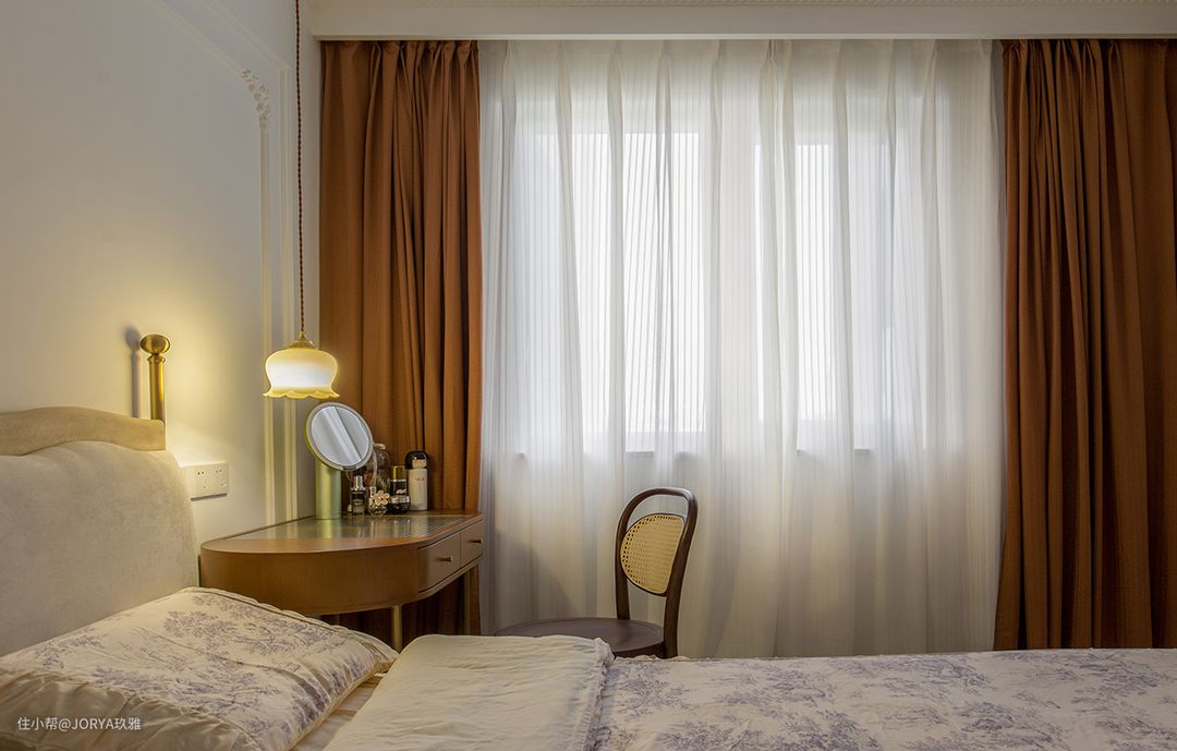 次卧为多功能,平时做书房,父母来了变卧室,所以配了推拉床。 次卧的隔窗,是不能打开的,只能透光,配了实木百叶帘,有人临时居住时,放下来增加私密性。