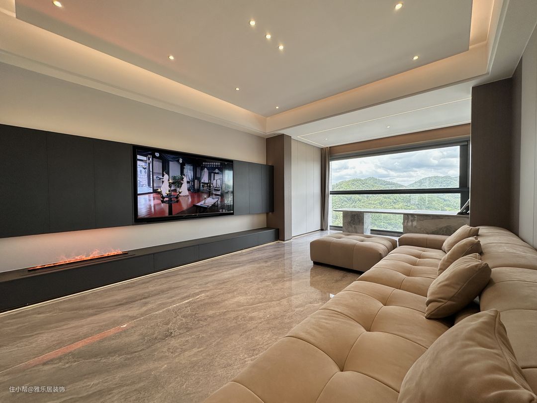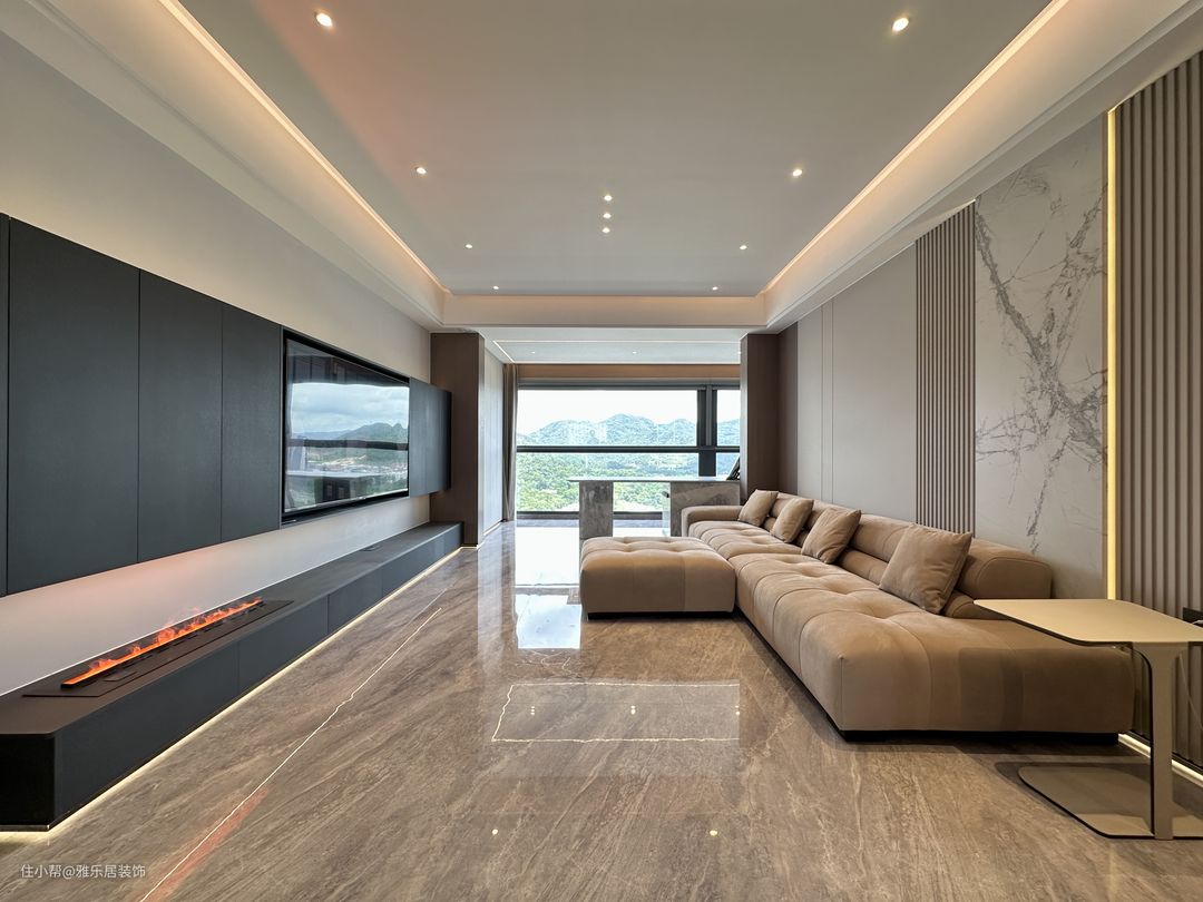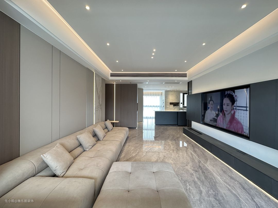客厅空间的选材上使用了木饰面、造型护墙板搭配灯带,整体以米白和暖棕色调为主,与岩板肌理产生对比,利用材质上的反差加强空间的质感感受。 精致整洁的线条、无主灯设计,在视觉上扩大空间效果,在低饱和度色调下,木饰面、皮革、布艺、金属等不同材质在空间中碰撞出别样的氛围。秉承低调奢华的同时,让整个空间流露出雅致的质感和摩登现代的审美体验。