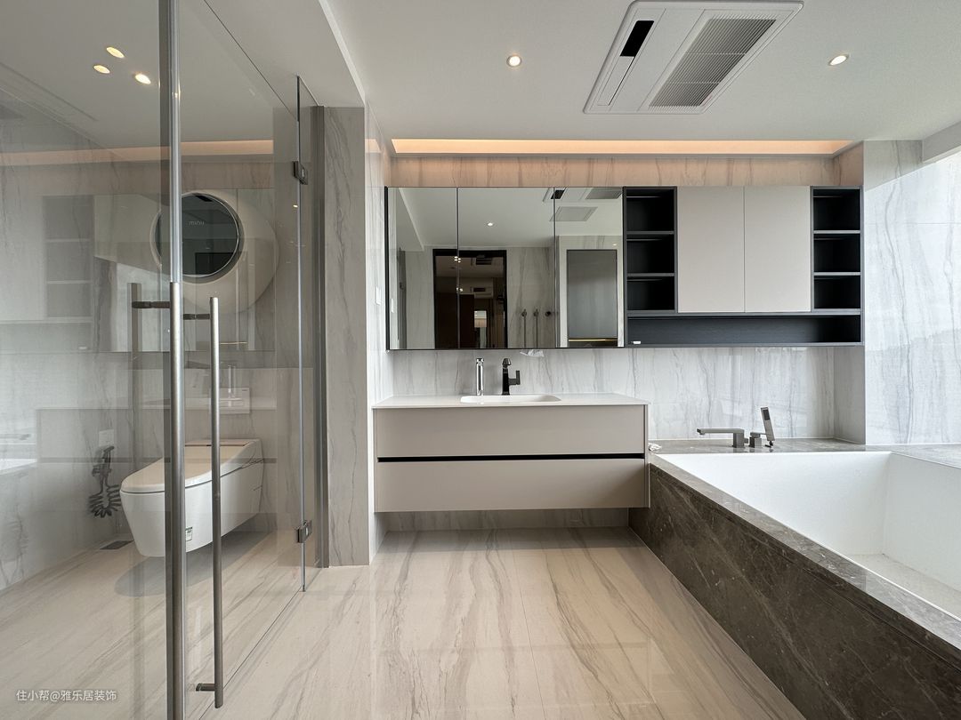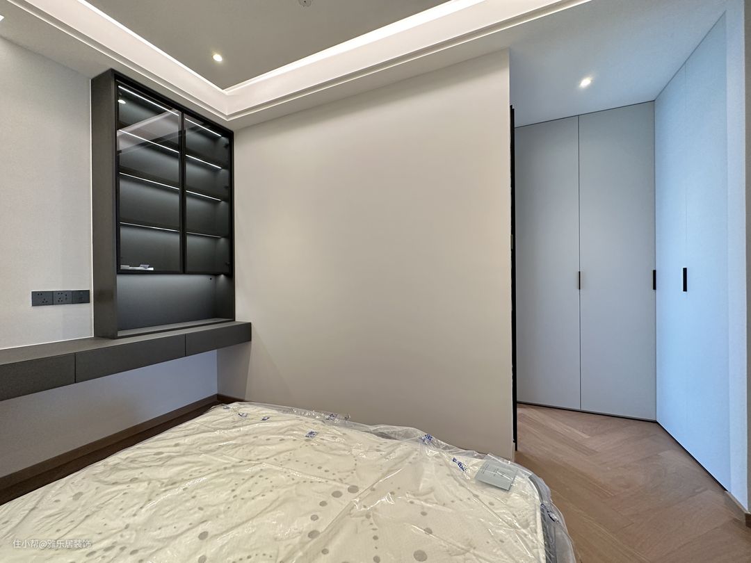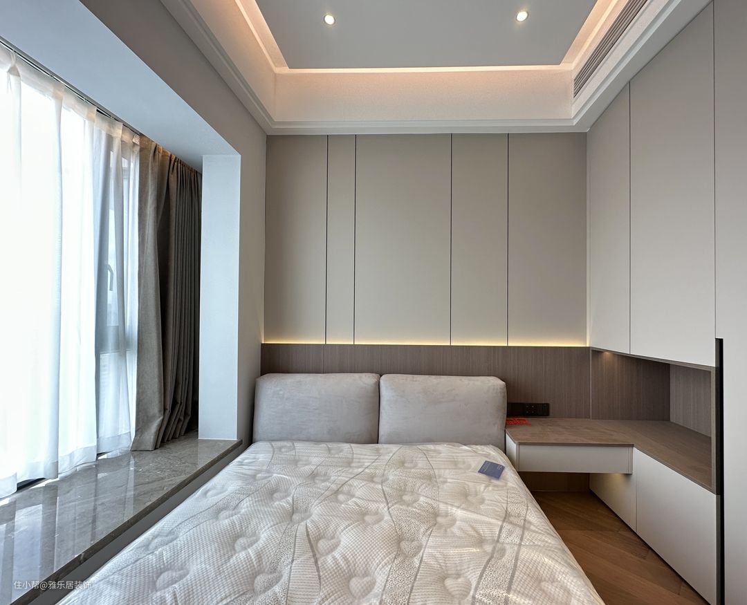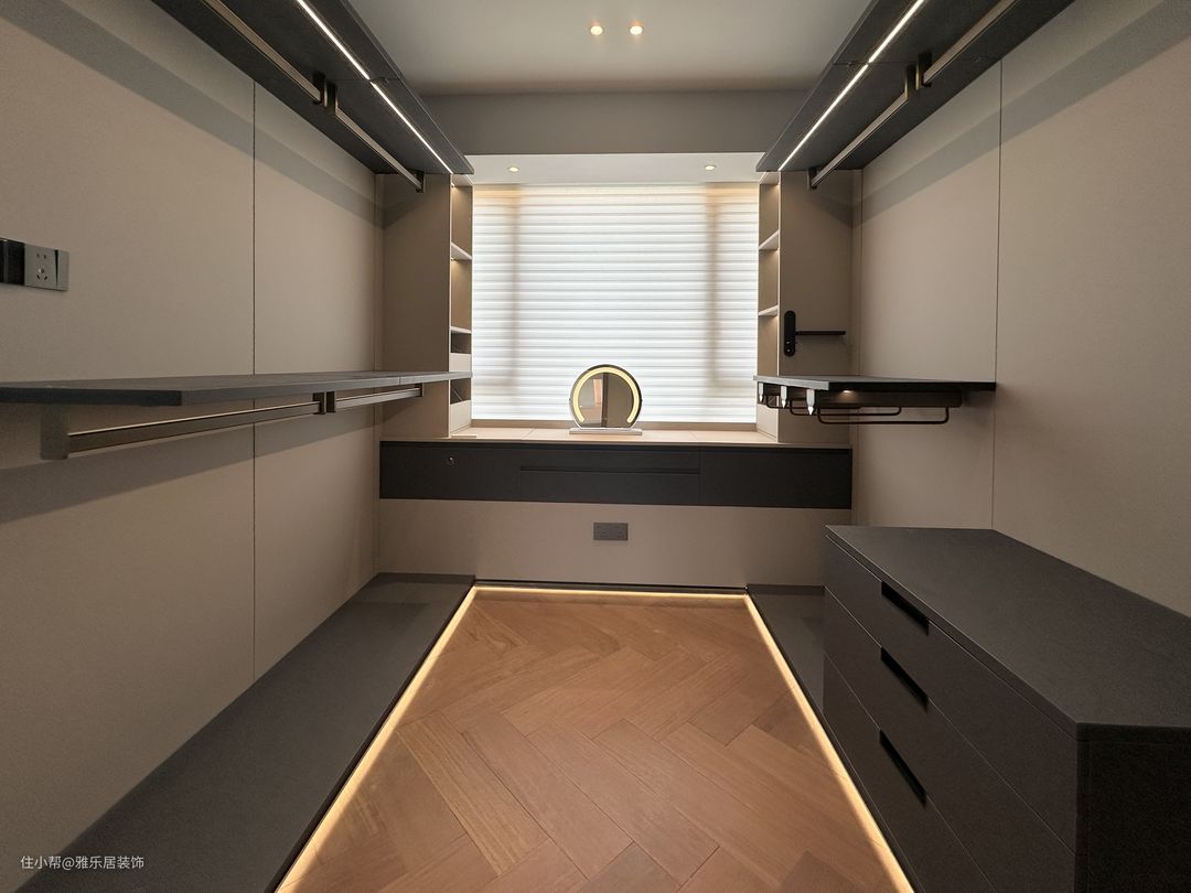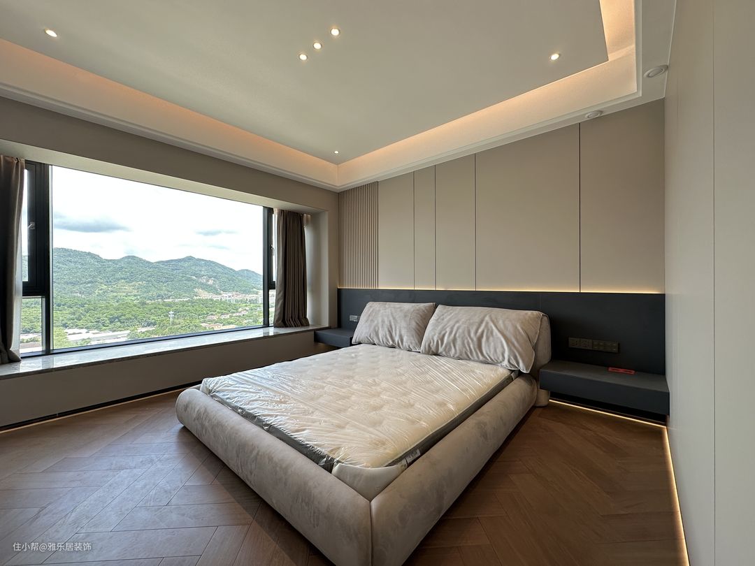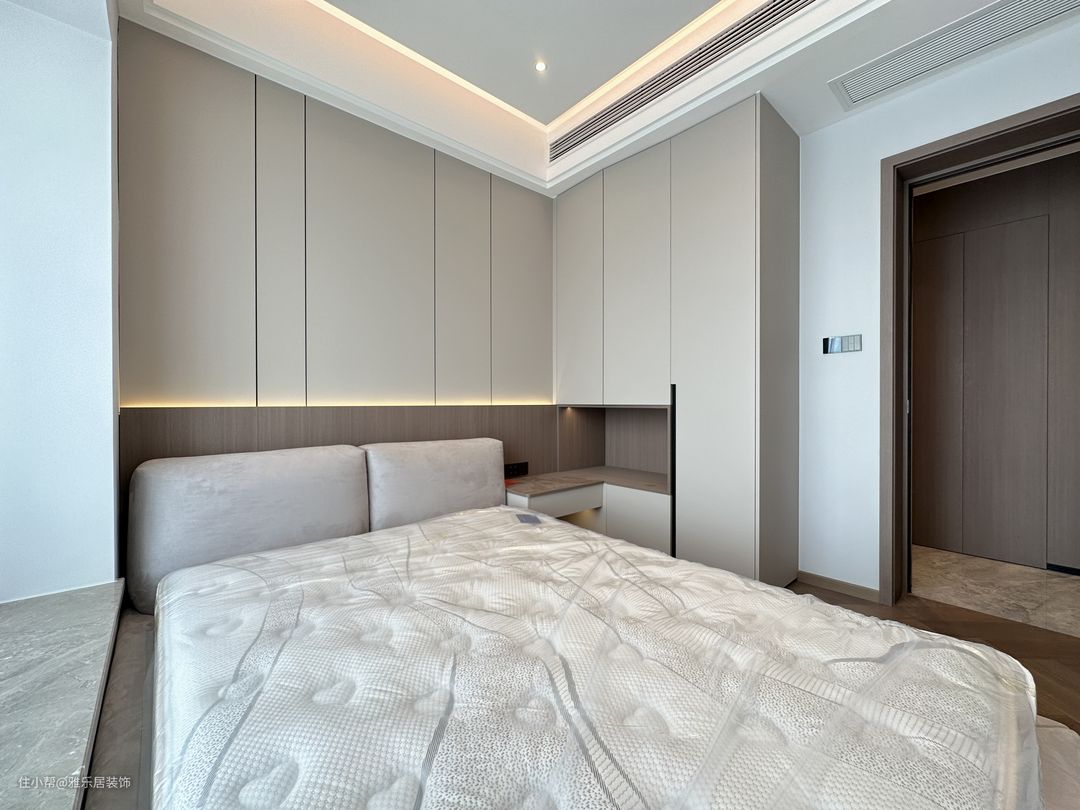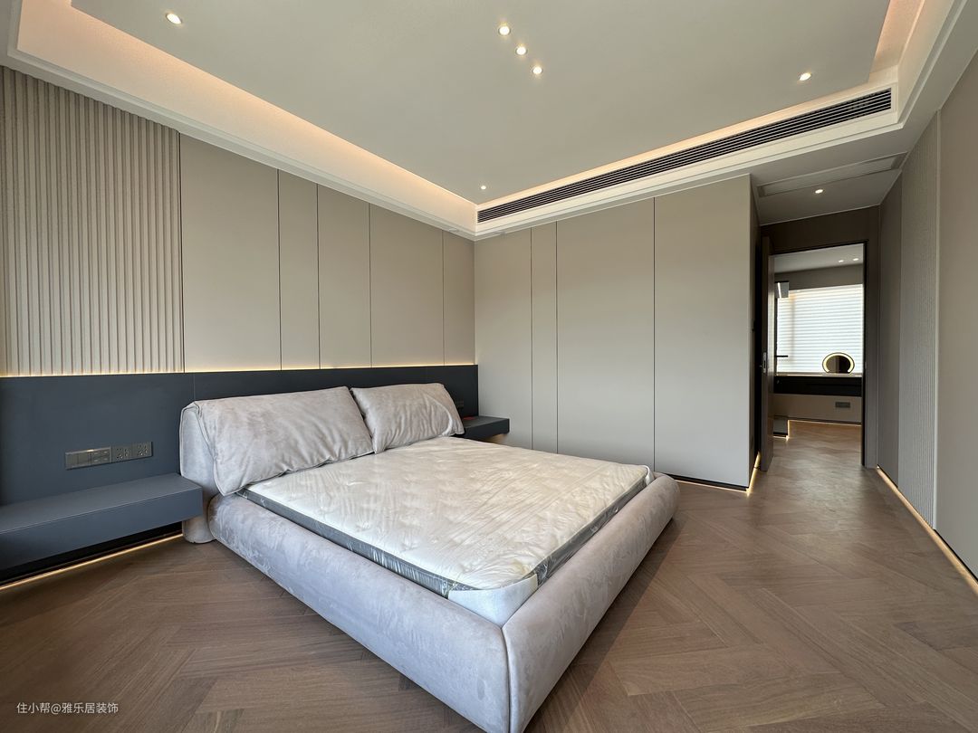 主卧套房延续整屋的设计风格和色调搭配,做了开放形式的衣帽间,能舍弃的绝不保留,整屋甚至看不到任何一个拉手。 卧室区落地窗引入开阔的视野,悬浮吊顶在灯带的渲染下,空间层次丰富有趣,于高级观感中延伸出品质家居,方寸间纵享诗意轻奢。