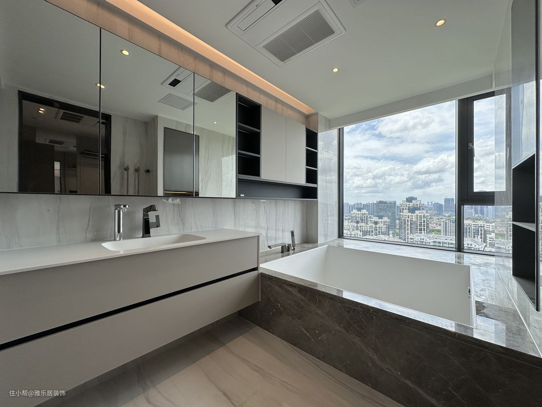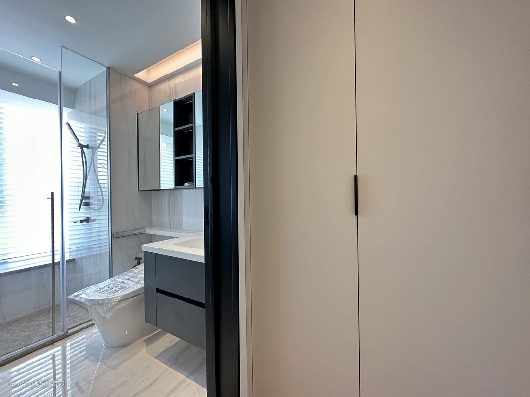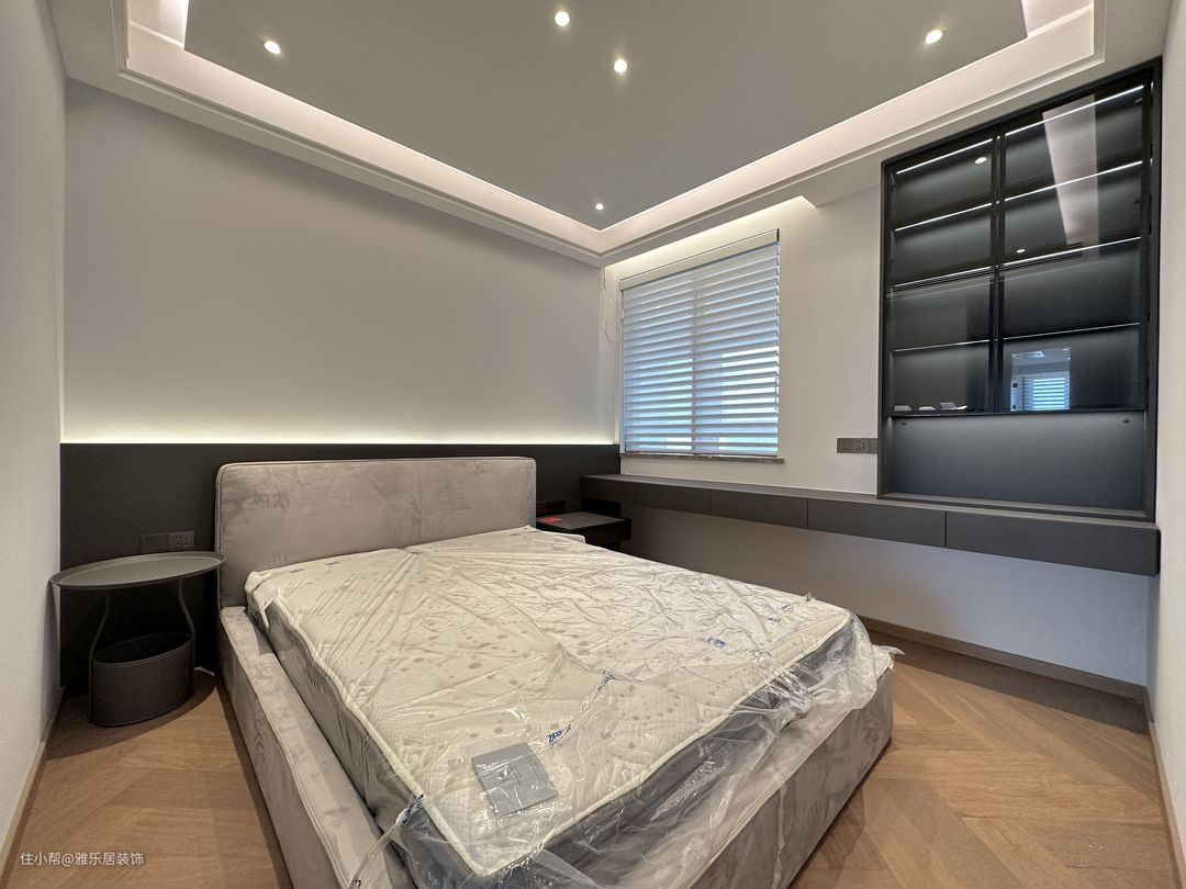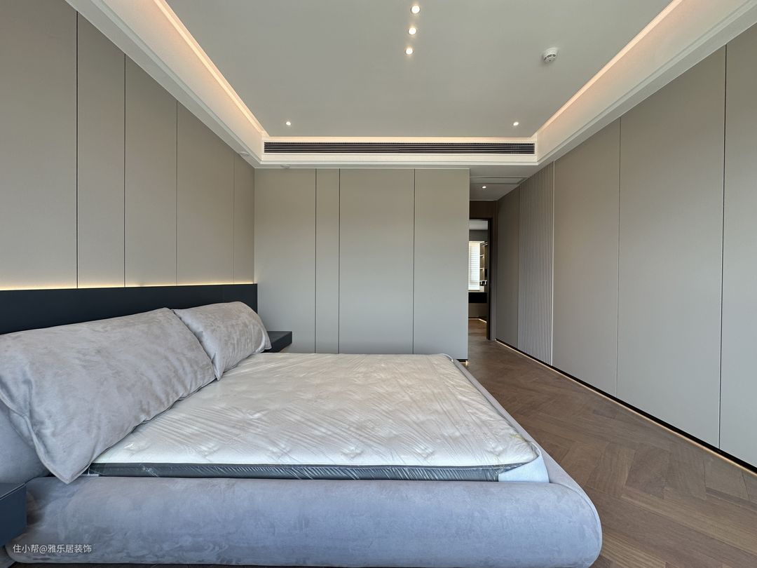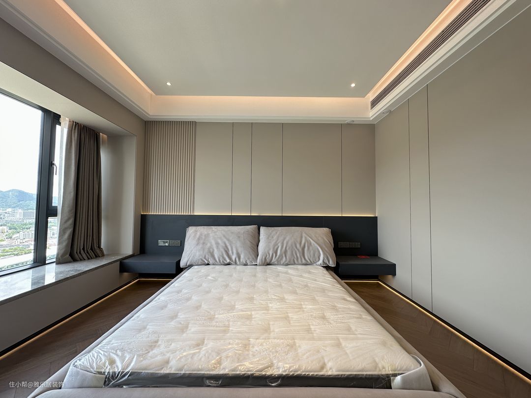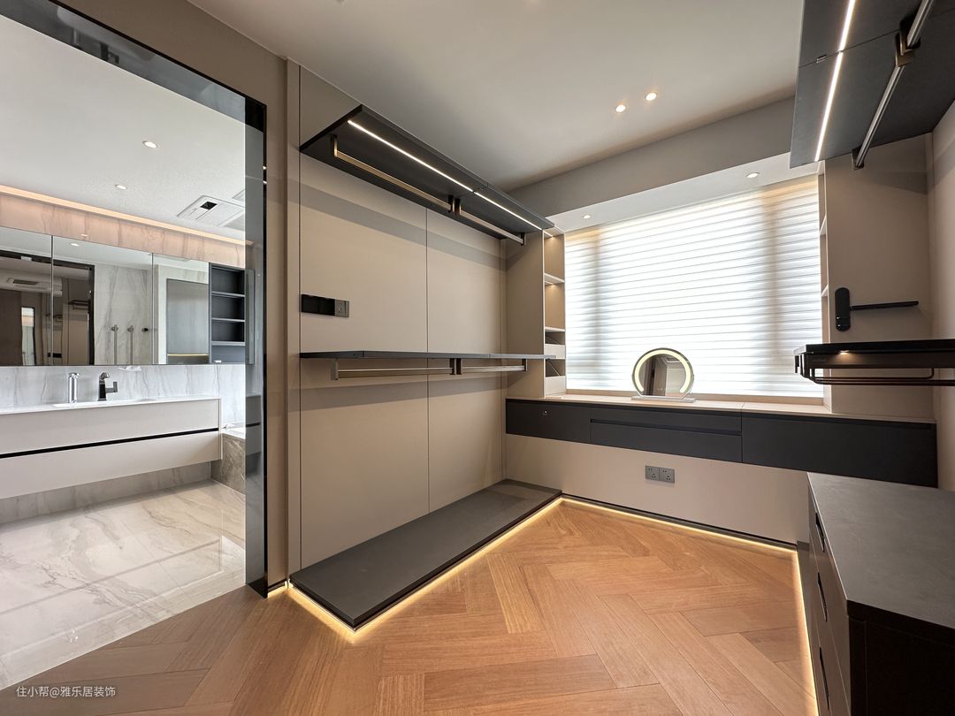 主卧套房延续整屋的设计风格和色调搭配,做了开放形式的衣帽间,能舍弃的绝不保留,整屋甚至看不到任何一个拉手。 卧室区落地窗引入开阔的视野,悬浮吊顶在灯带的渲染下,空间层次丰富有趣,于高级观感中延伸出品质家居,方寸间纵享诗意轻奢。