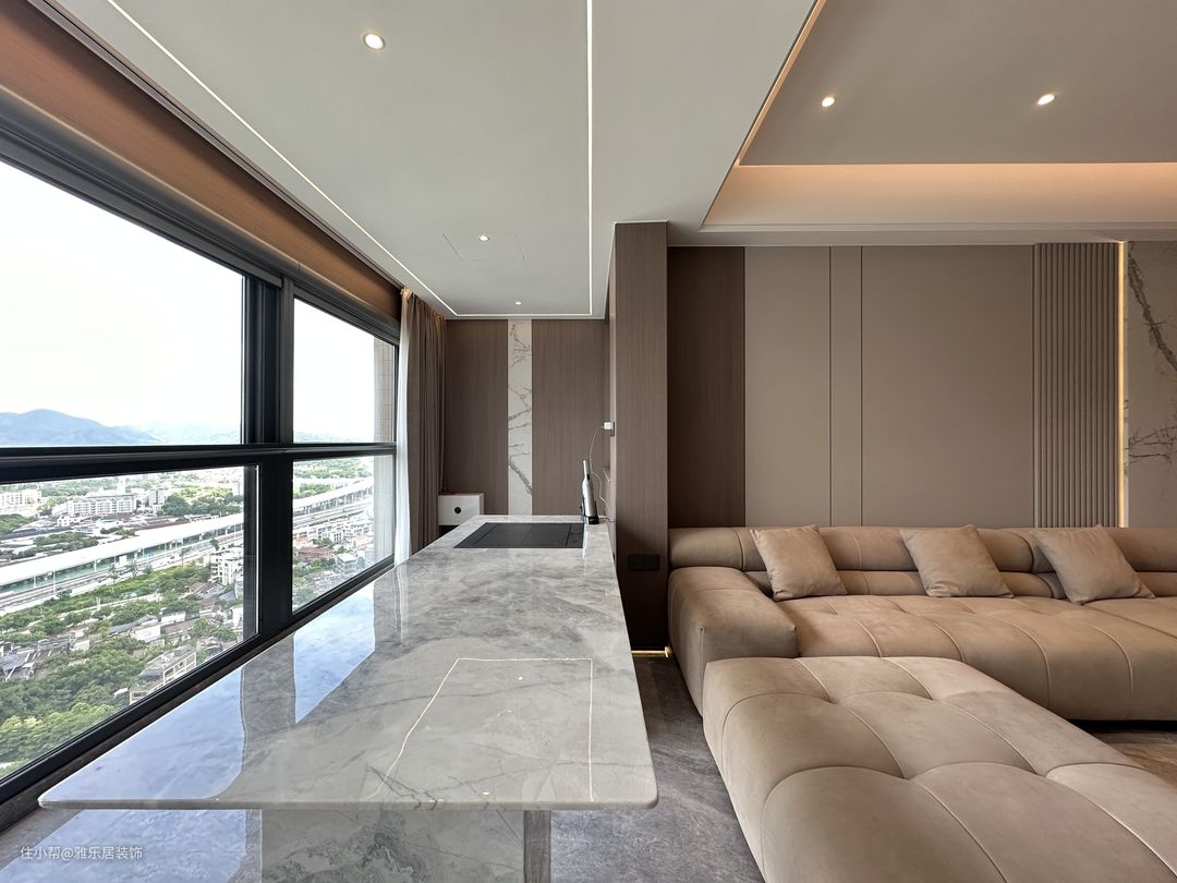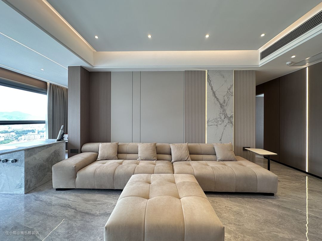 客厅空间的选材上使用了木饰面、造型护墙板搭配灯带,整体以米白和暖棕色调为主,与岩板肌理产生对比,利用材质上的反差加强空间的质感感受。 精致整洁的线条、无主灯设计,在视觉上扩大空间效果,在低饱和度色调下,木饰面、皮革、布艺、金属等不同材质在空间中碰撞出别样的氛围。秉承低调奢华的同时,让整个空间流露出雅致的质感和摩登现代的审美体验。
