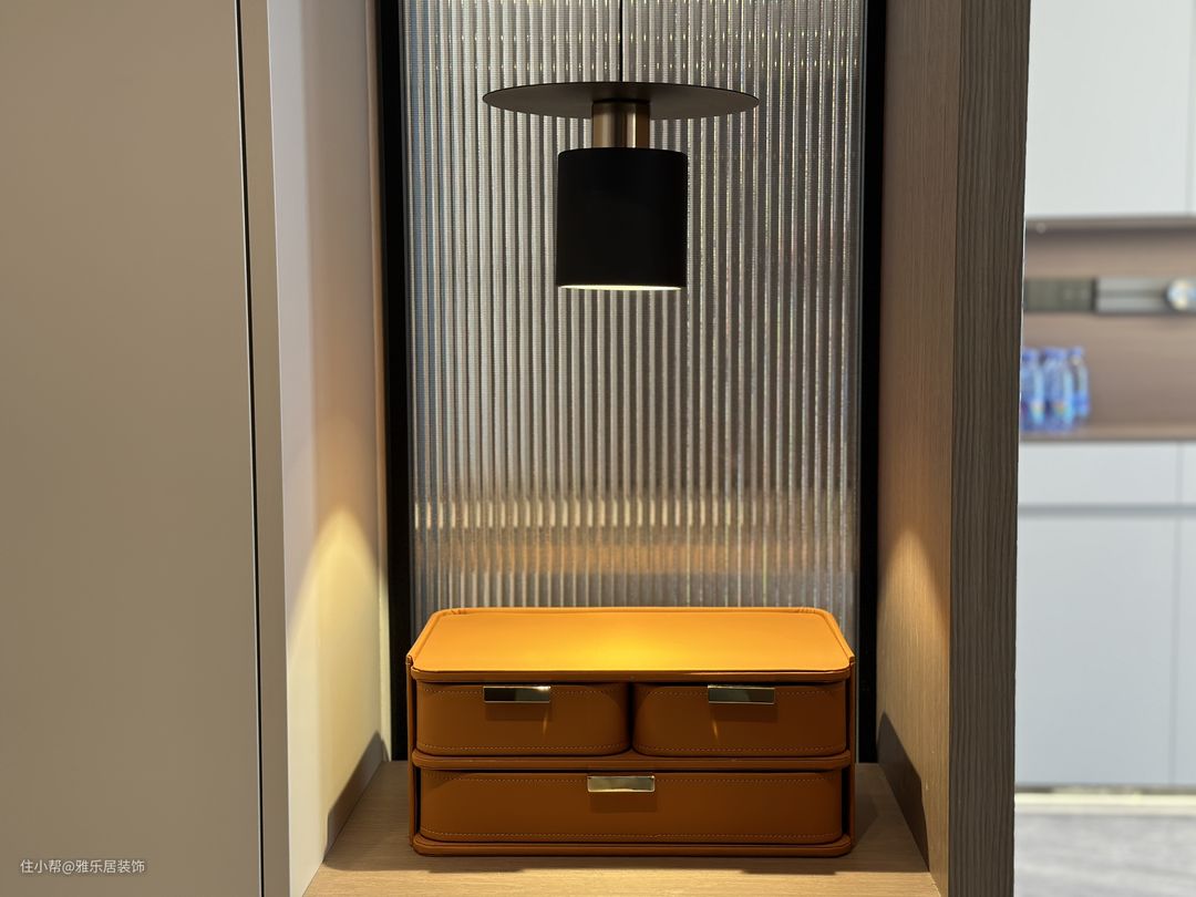 玄关作为入户的第一道风景,高级稳重的精灵灰通顶定制柜搭配长虹玻璃的跳跃,橙色收纳盒的点缀,丰富整个空间的同时不失格调。