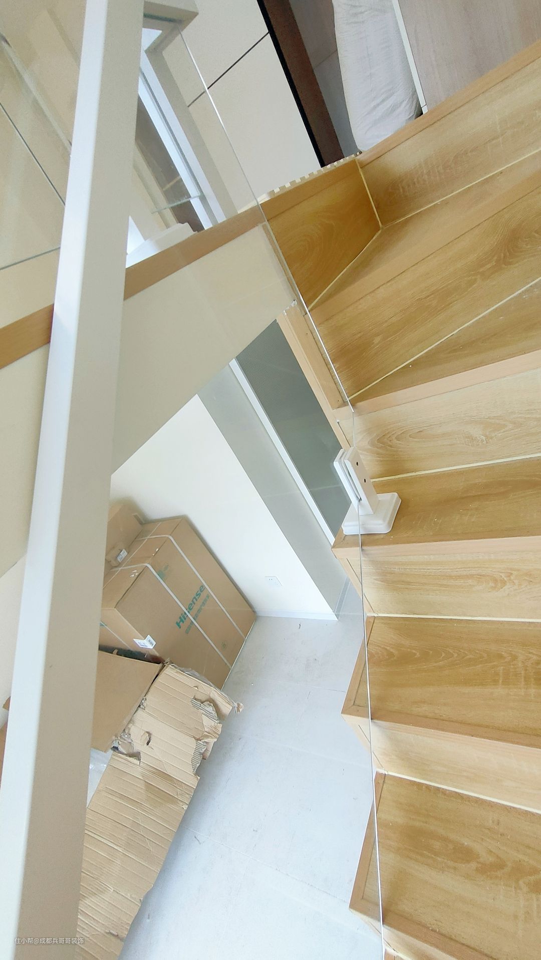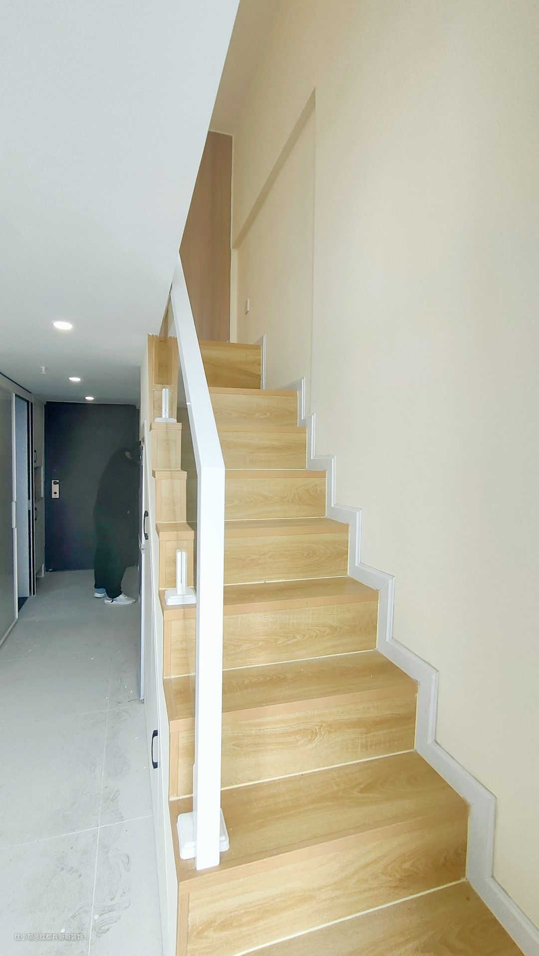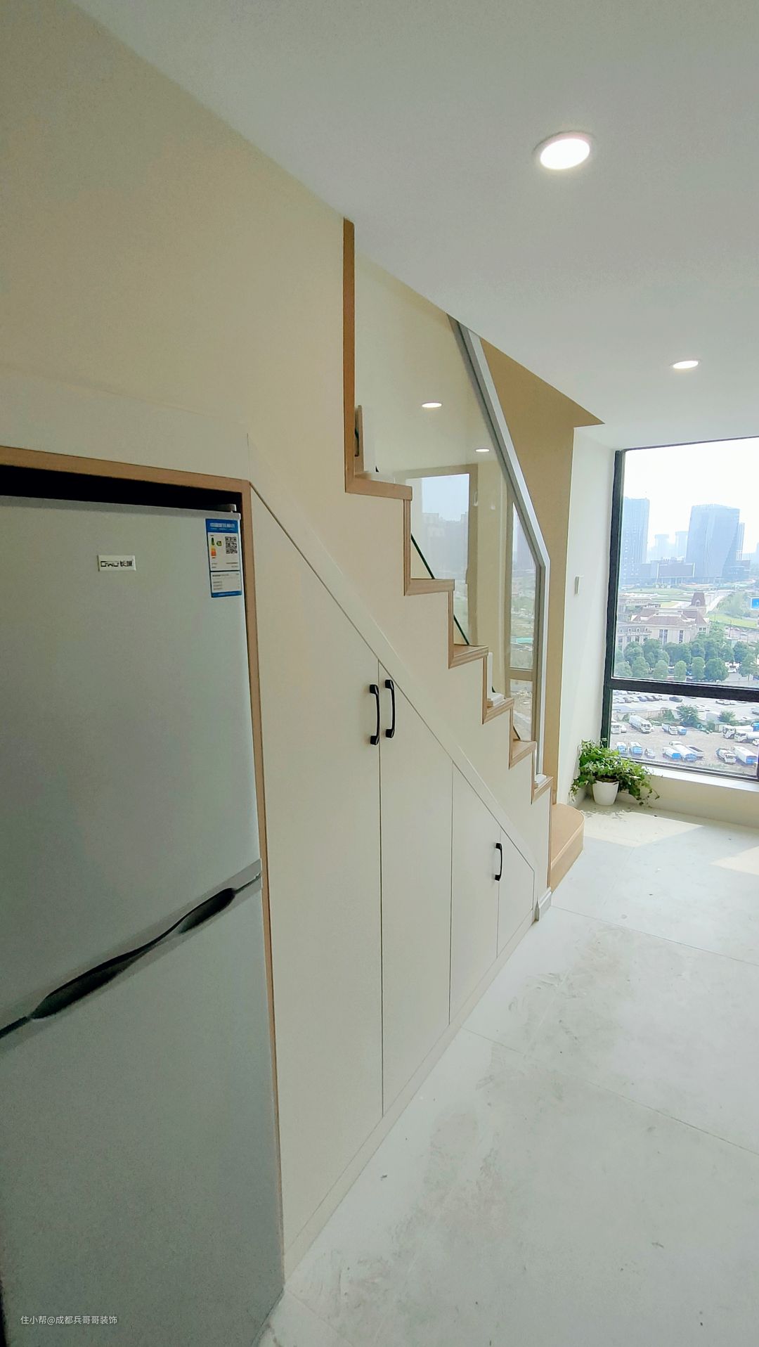 这套公寓选择的是一字形楼梯,楼梯下方做了一整排储物柜,抽屉式、多格式等,还设计了嵌入式冰箱,完美利用当下空间,让家更加整洁、干净,不杂乱~ 楼梯,选用的是木地板踏步+实木玻璃扶手+卡座连接,玻璃是3C认证的钢化玻璃,厚度12mm,安全性保障的。整体空间感简约、大气~ 公寓楼梯这样设计,实用性很强👍