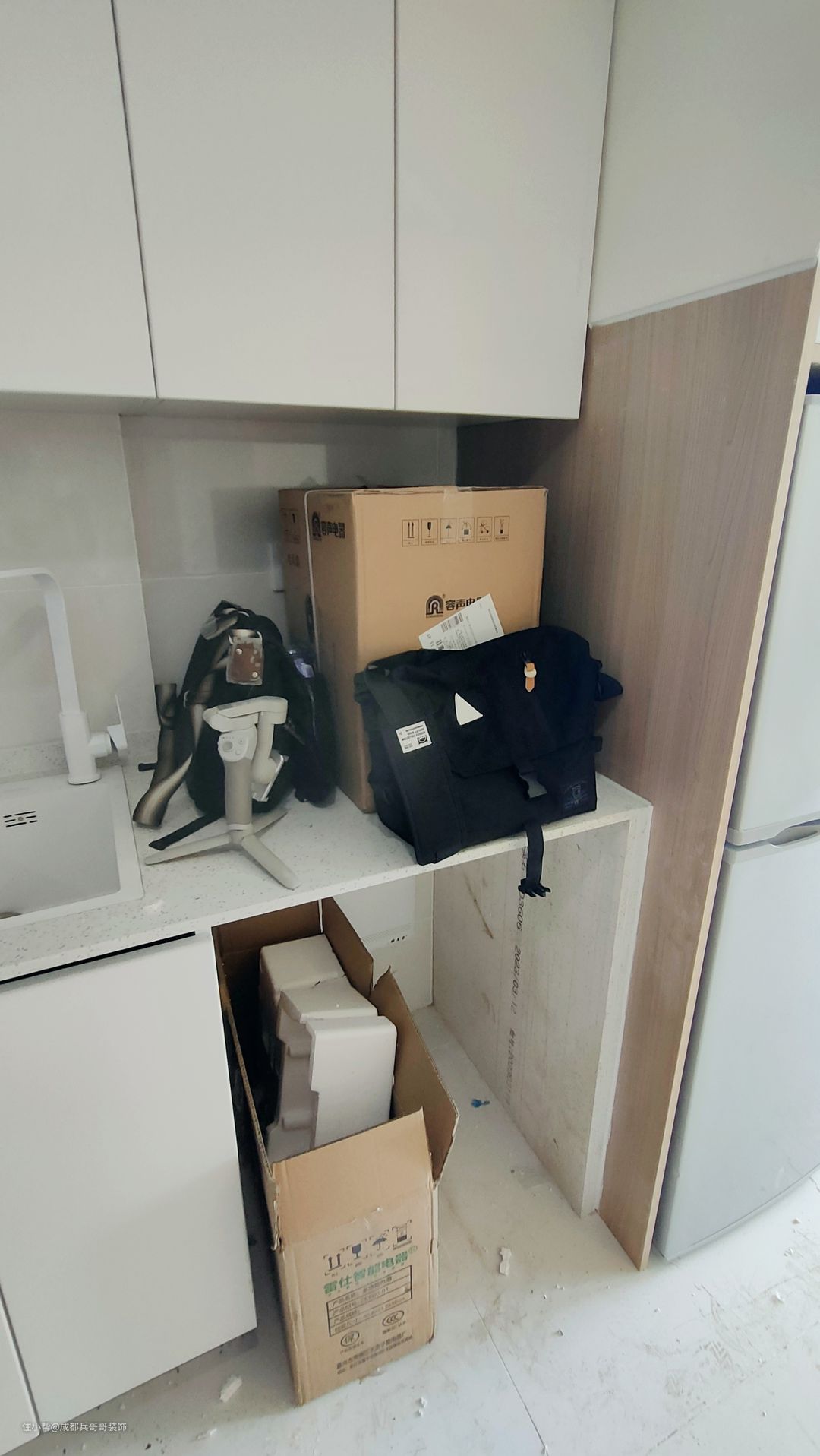 玄关的柜体选择,无论是颜色还是材质上,都是和厨房吊柜、地柜保持一致,这样风格统一,不会有违和感~