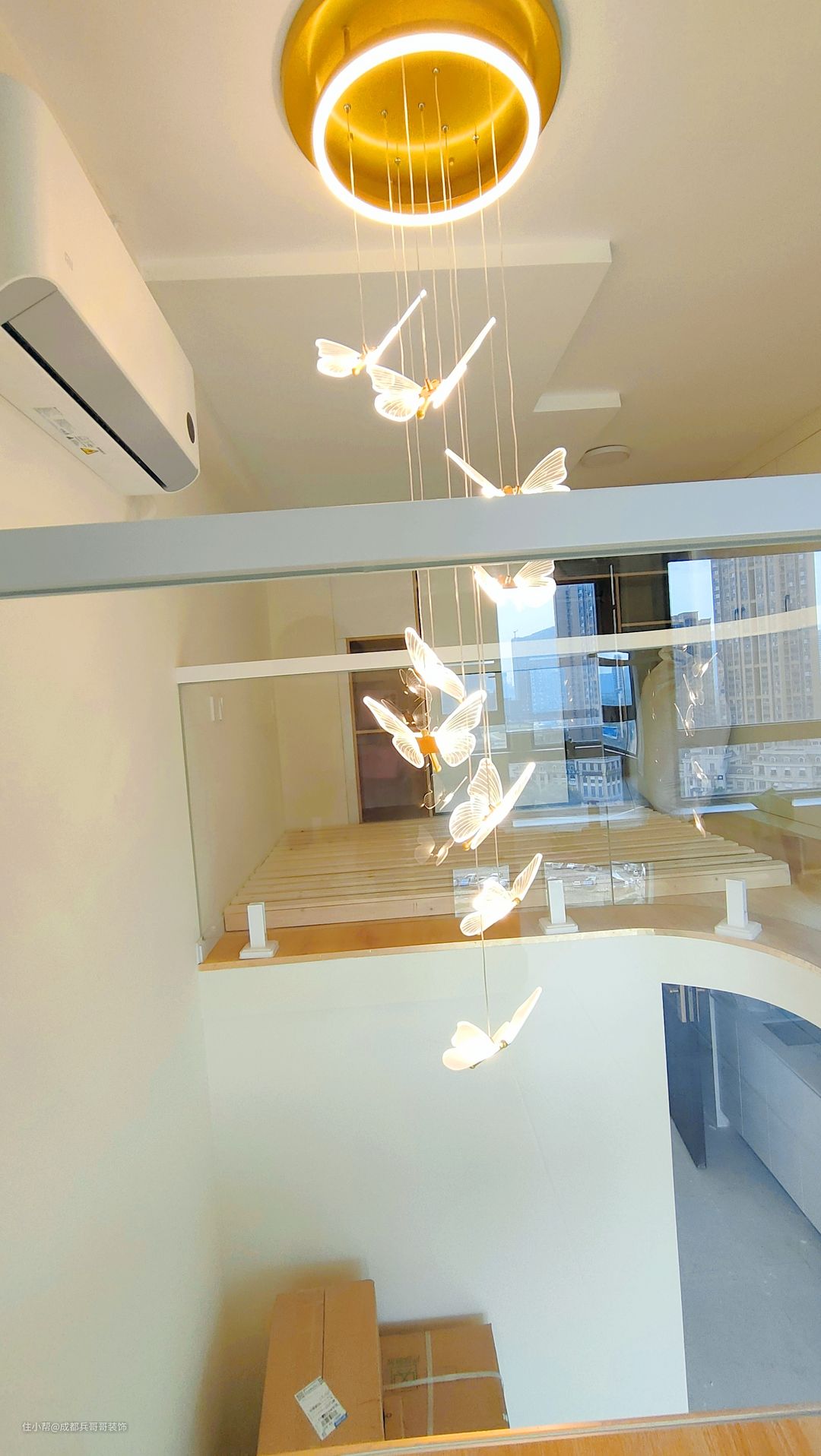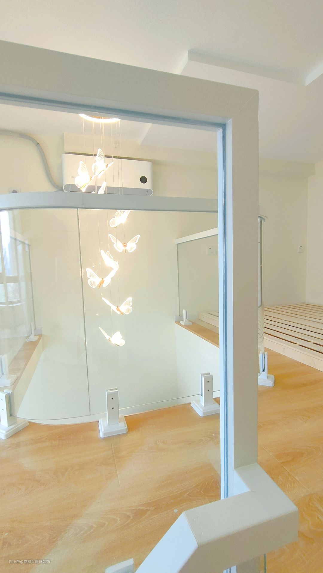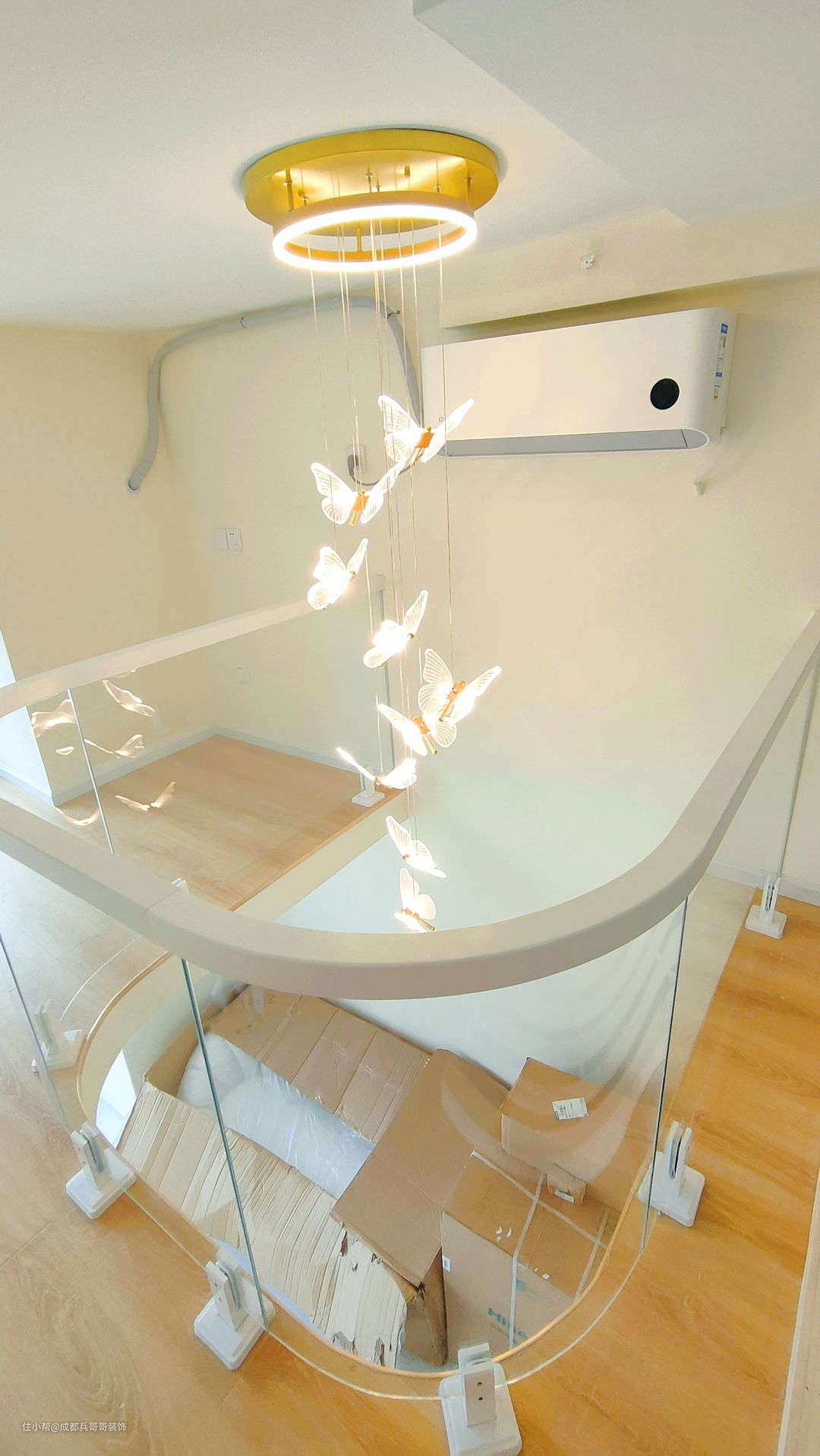 loft公寓,中间部分镂空设计,可以很好地增加室内采光、通风效果,空间感看上去也会不显压抑,很舒适。 这里的挑空有4米多,采用卡座连接实木玻璃扶手,再搭配蝴蝶氛围灯,为整个空间营造出浪漫温馨之感~