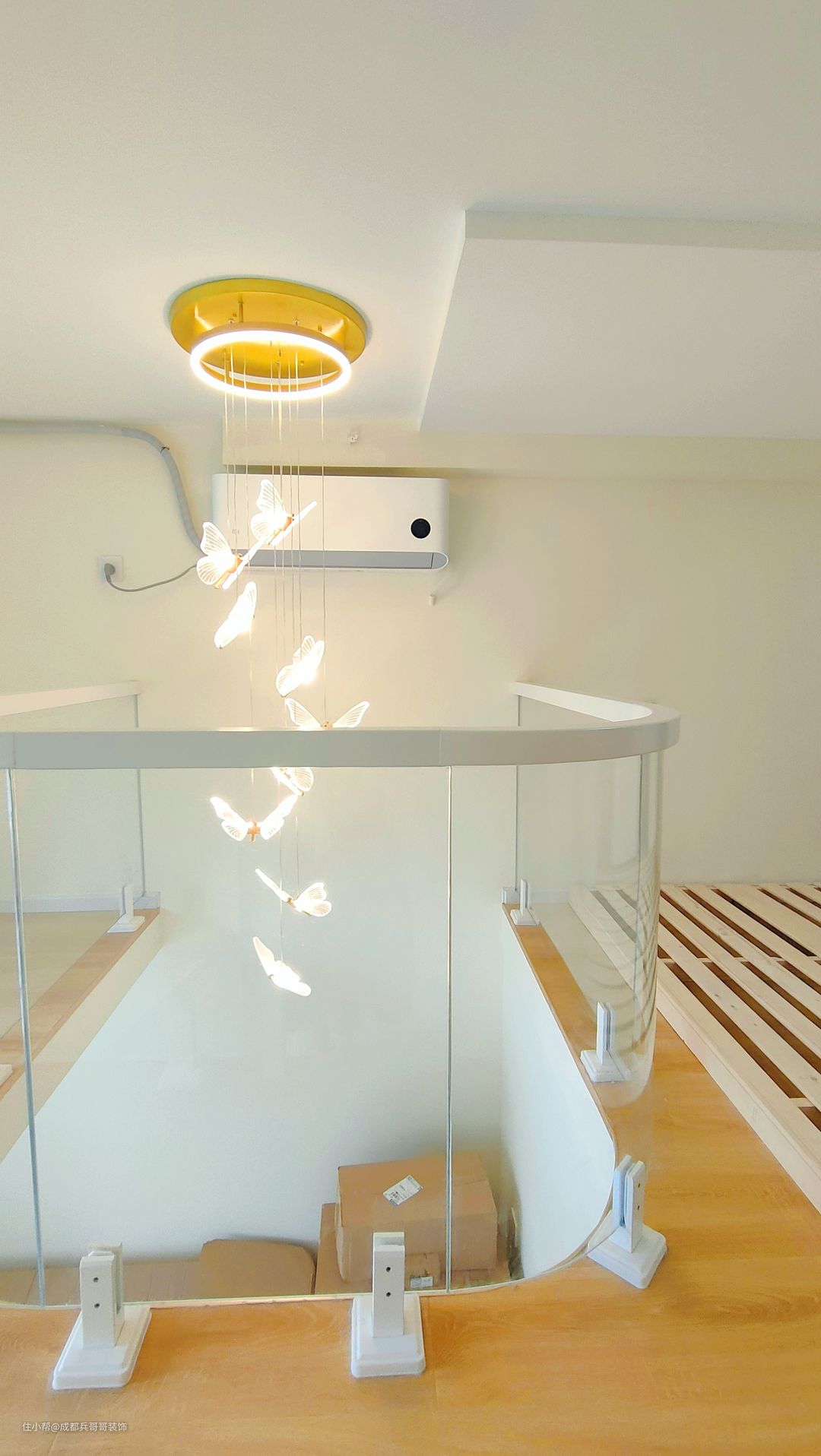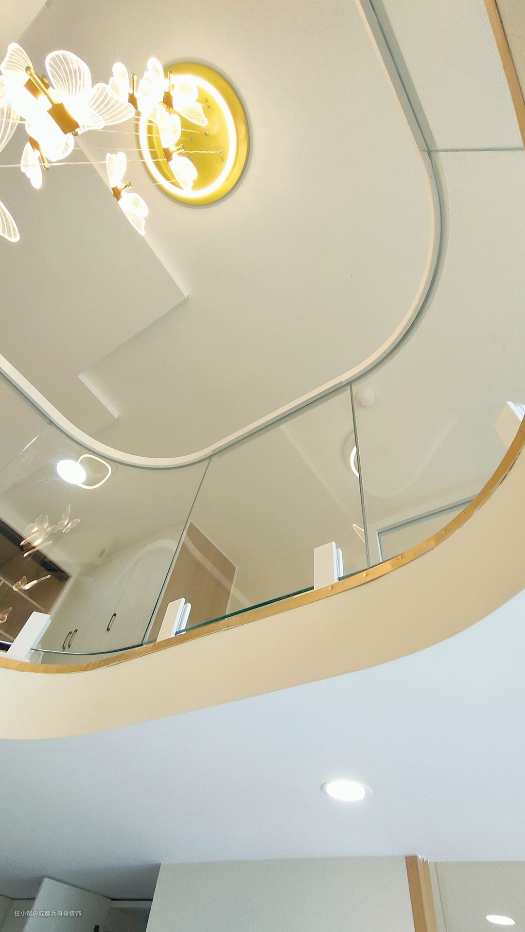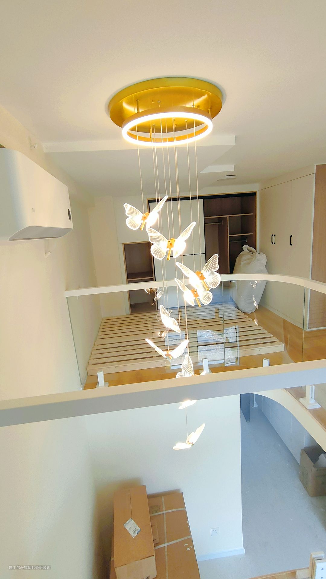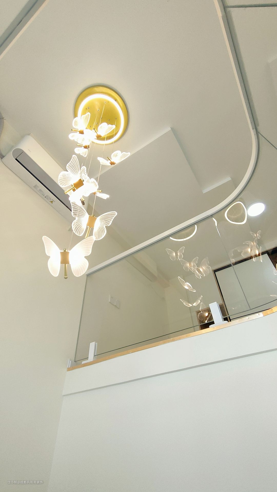 作为空间装饰的一部分,灯具与整体风格不可分割。灯具无论是造型还是材质、颜色等,最好与空间风格相协调,现代家居空间中,灯具的造型设计应以简洁为主,同时兼顾着时尚气息~ 这套灯饰不多,中间挑空部分是主灯,搭配的是蝴蝶灯,氛围感温馨浪漫,一眼便喜欢了~~