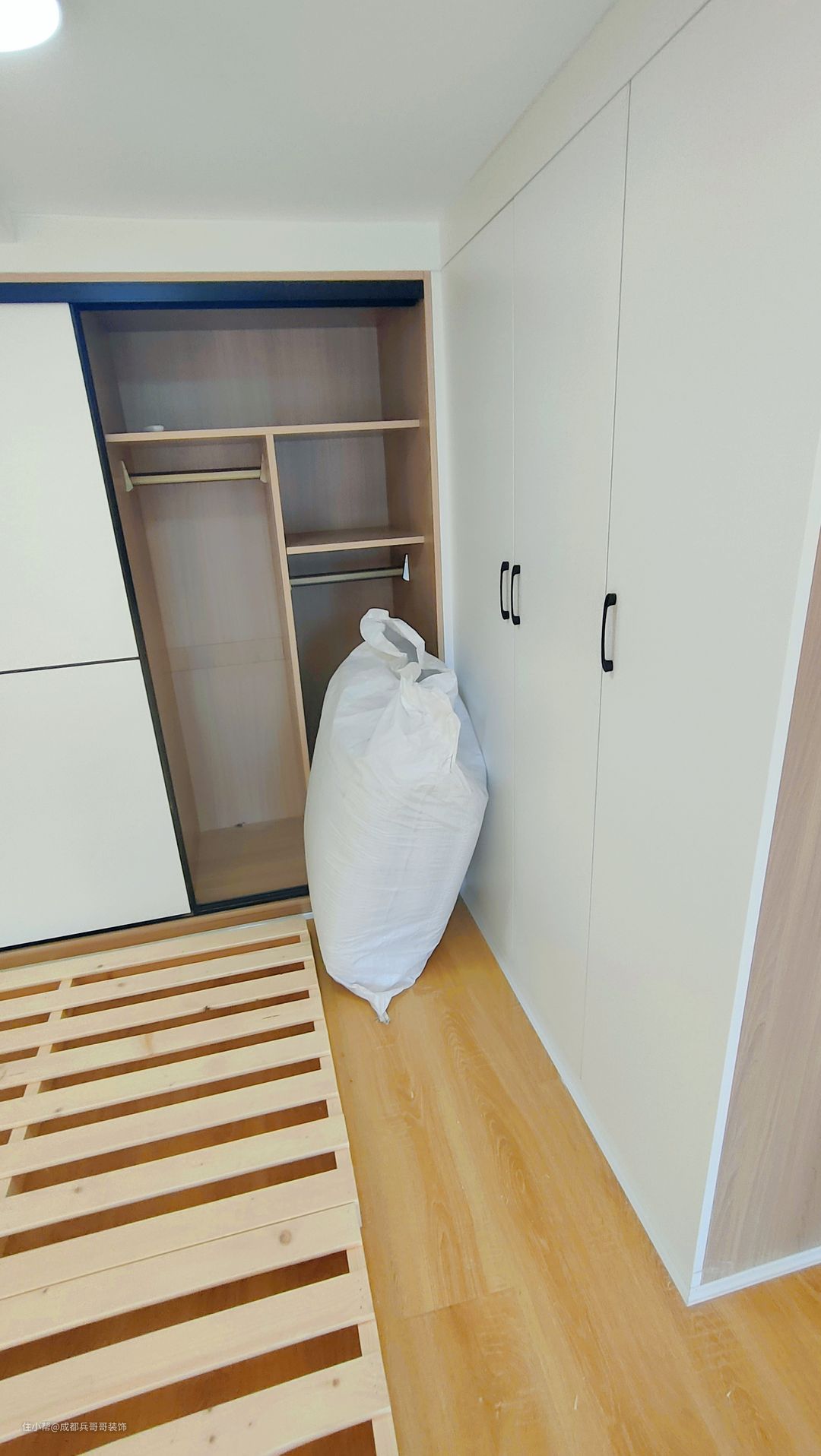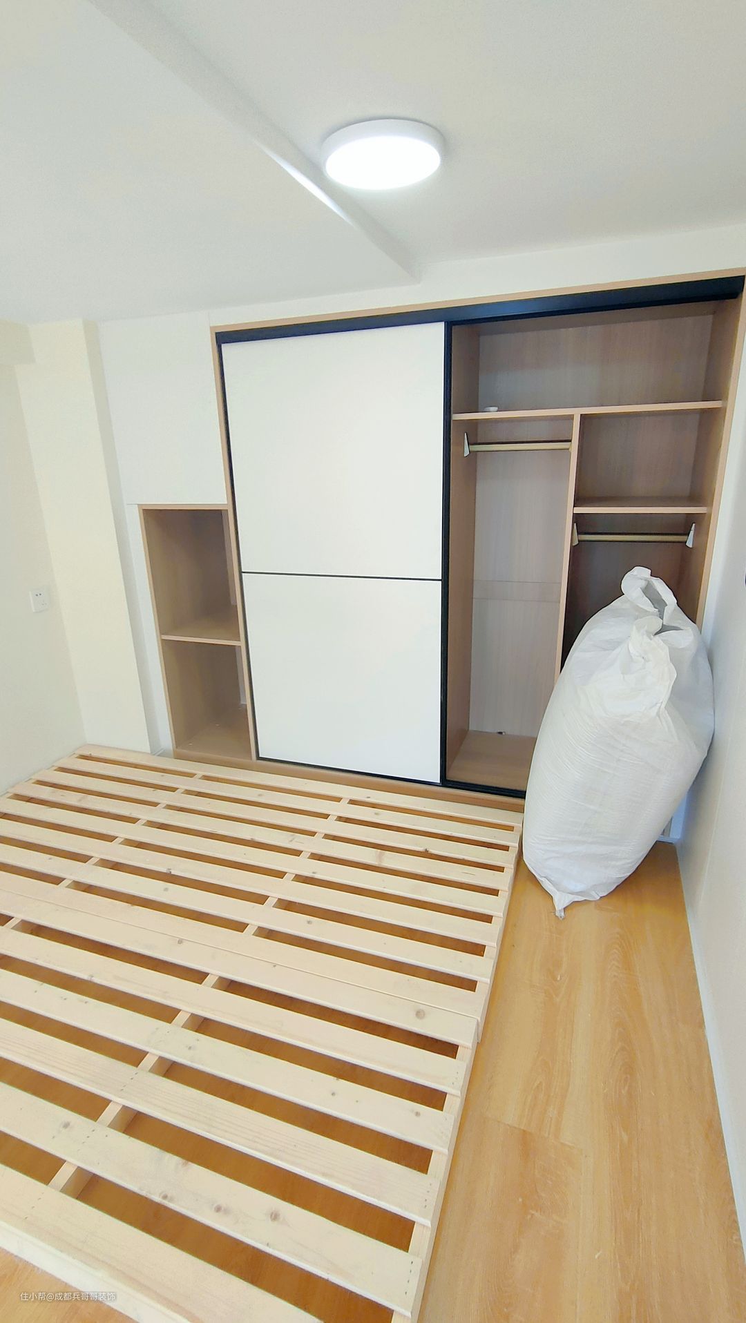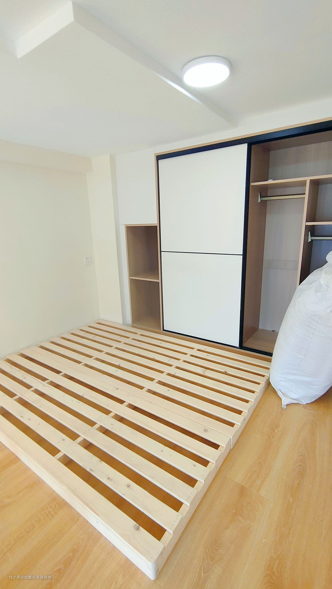 主卧,设计在二楼最里面,拥有一米五的床架和L形的嵌入式衣柜,功能基本满足。阁楼搭建后,二楼估计有1.8m,业主身高较高,所以设计了床架,可以有效节省层高,生活起来也更舒适🌿🌿
