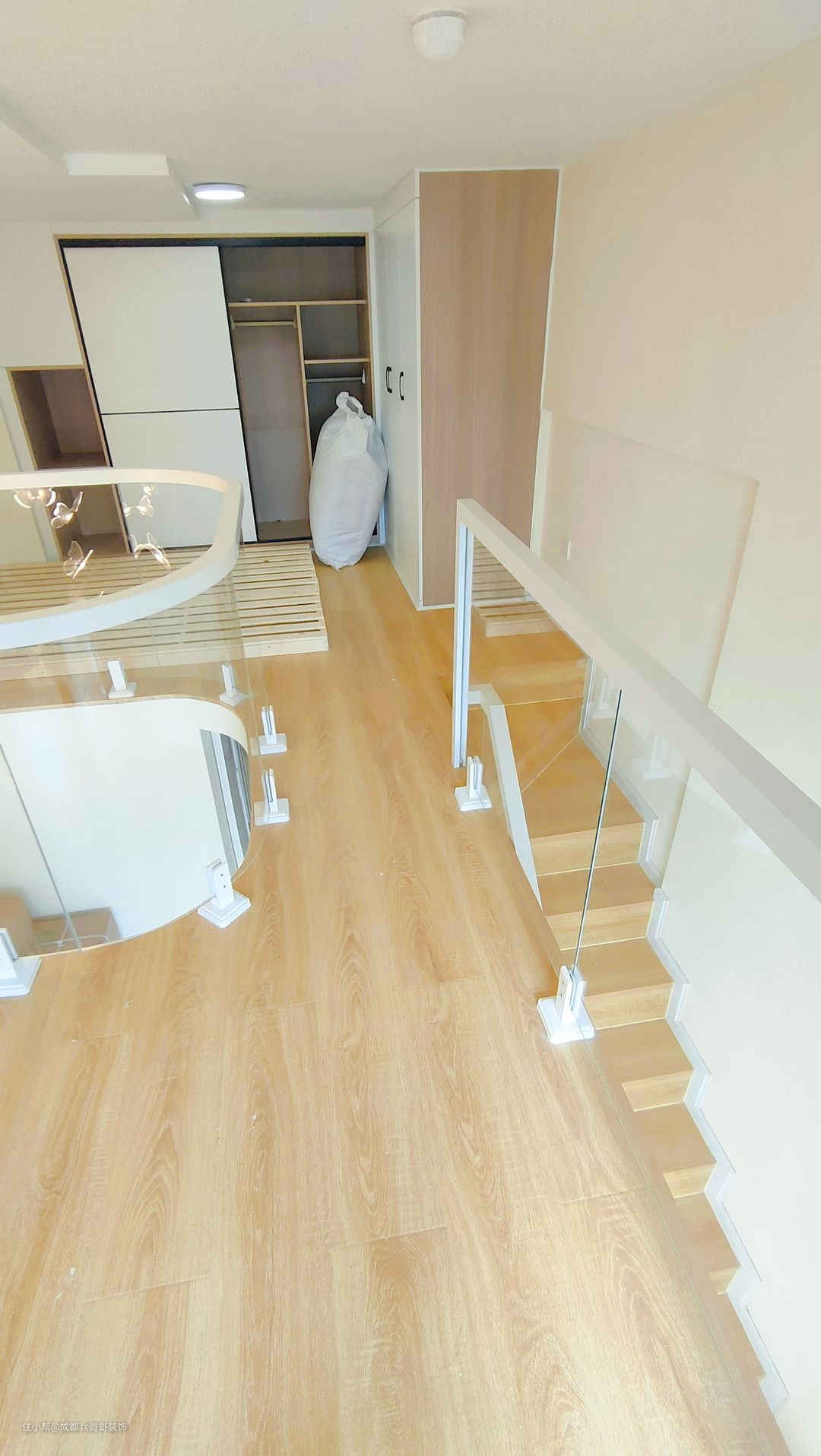 LOF套公寓大多数是一个长方体,没有任何砌墙,长宽多变,这一套呢建筑面积28平,套内面积只有18平不到。业主是位旅拍摄影师,要求保留两个卧室,中间要保留挑空设计,并且要用弧形半高玻璃扶手,楼梯转角也需要弧形,避免一切尖锐形状对视觉造成的冲击感。这也是装修设计时的难点。 其实对于10多平loft来说,最好的方式是半搭一房设计,但也可以两个卧室,那就要接受二楼卧室的面积不会很大。再者,这套层高4.2米,实际净空只有4米0几,如果又要保留两个房间,又不选择中间挑空的话,在里面居住起来会十分压抑~
