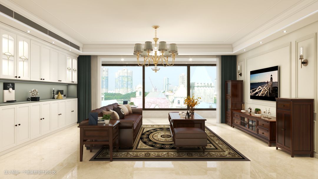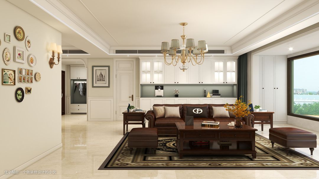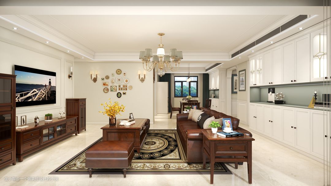 中央空调和客厅边柜位于一处,弱化客厅开间的同时减少吊顶的过渡运用