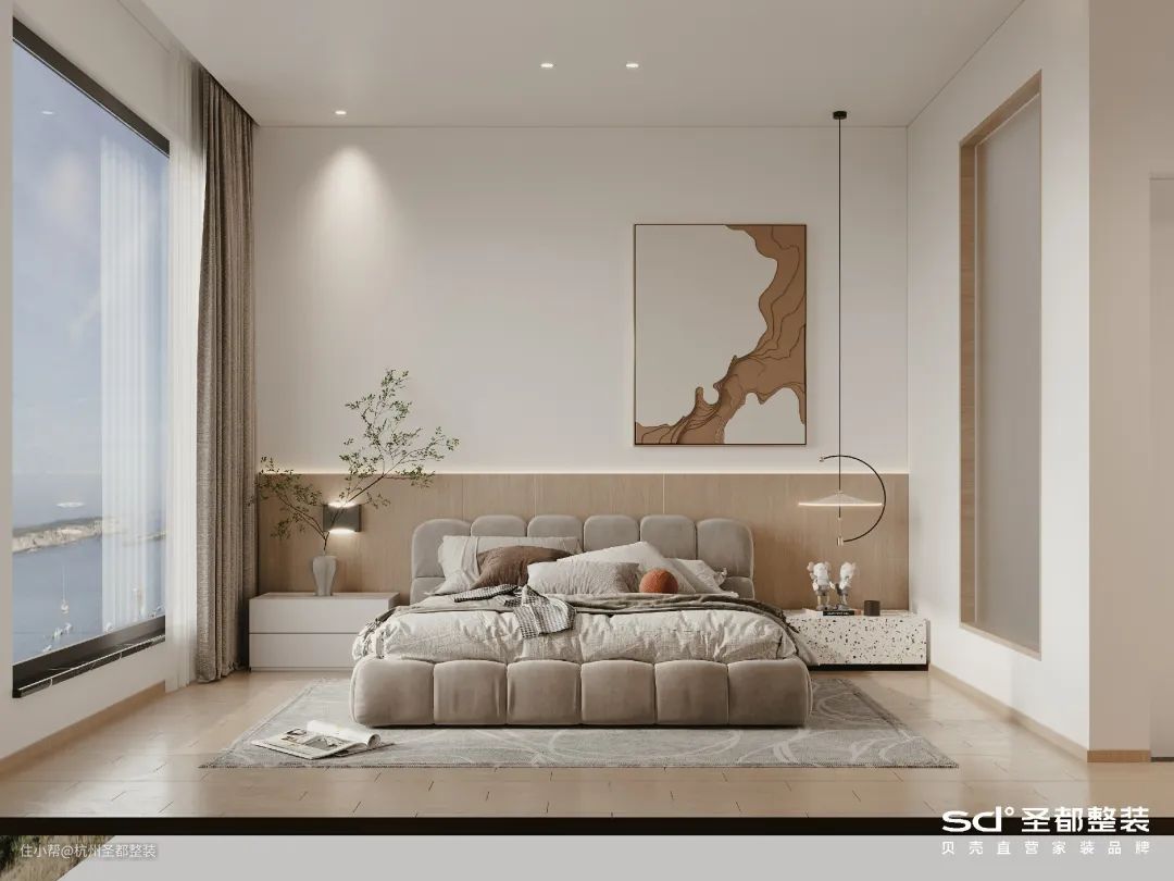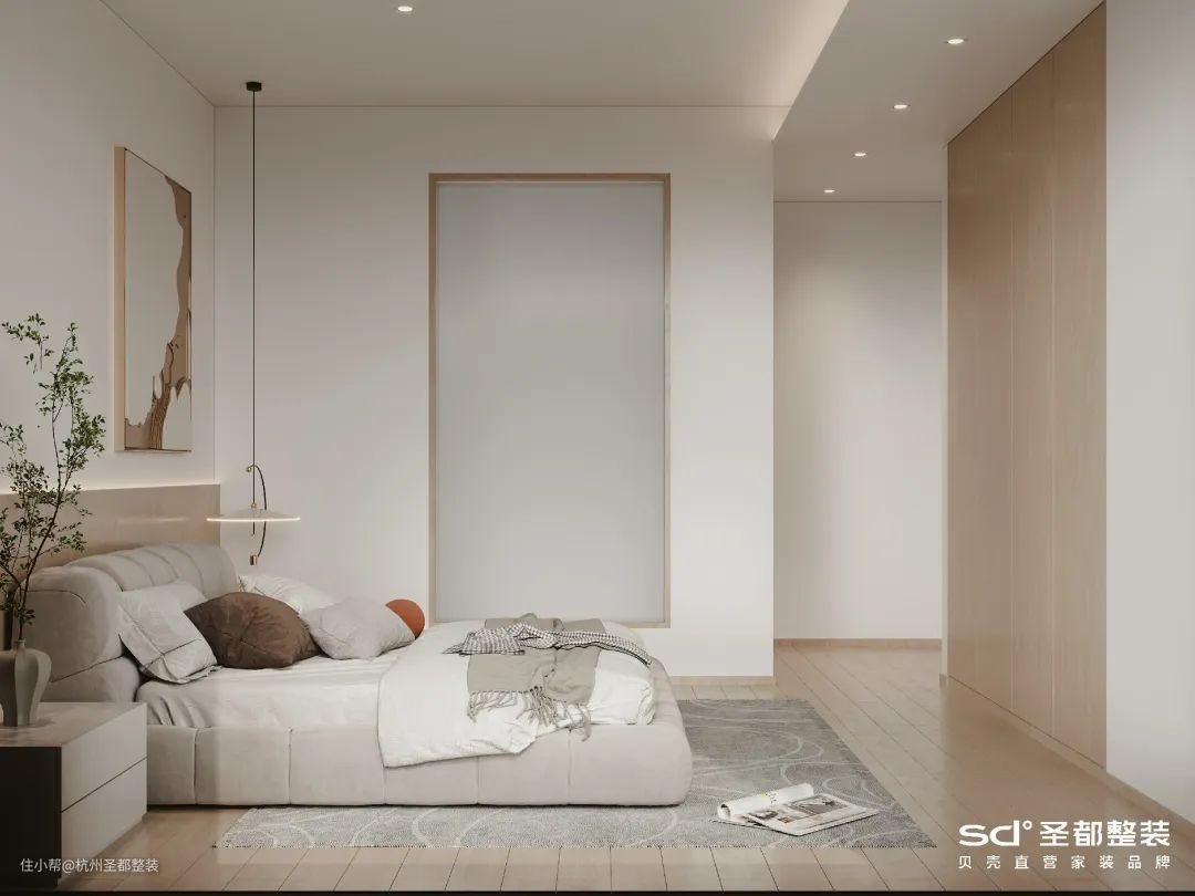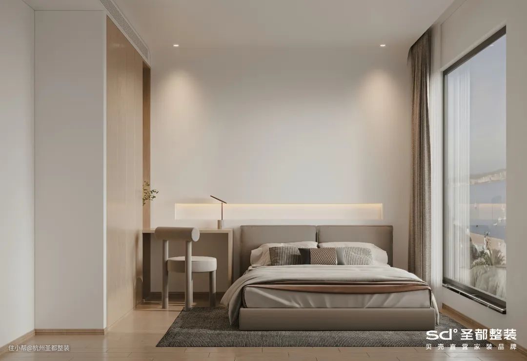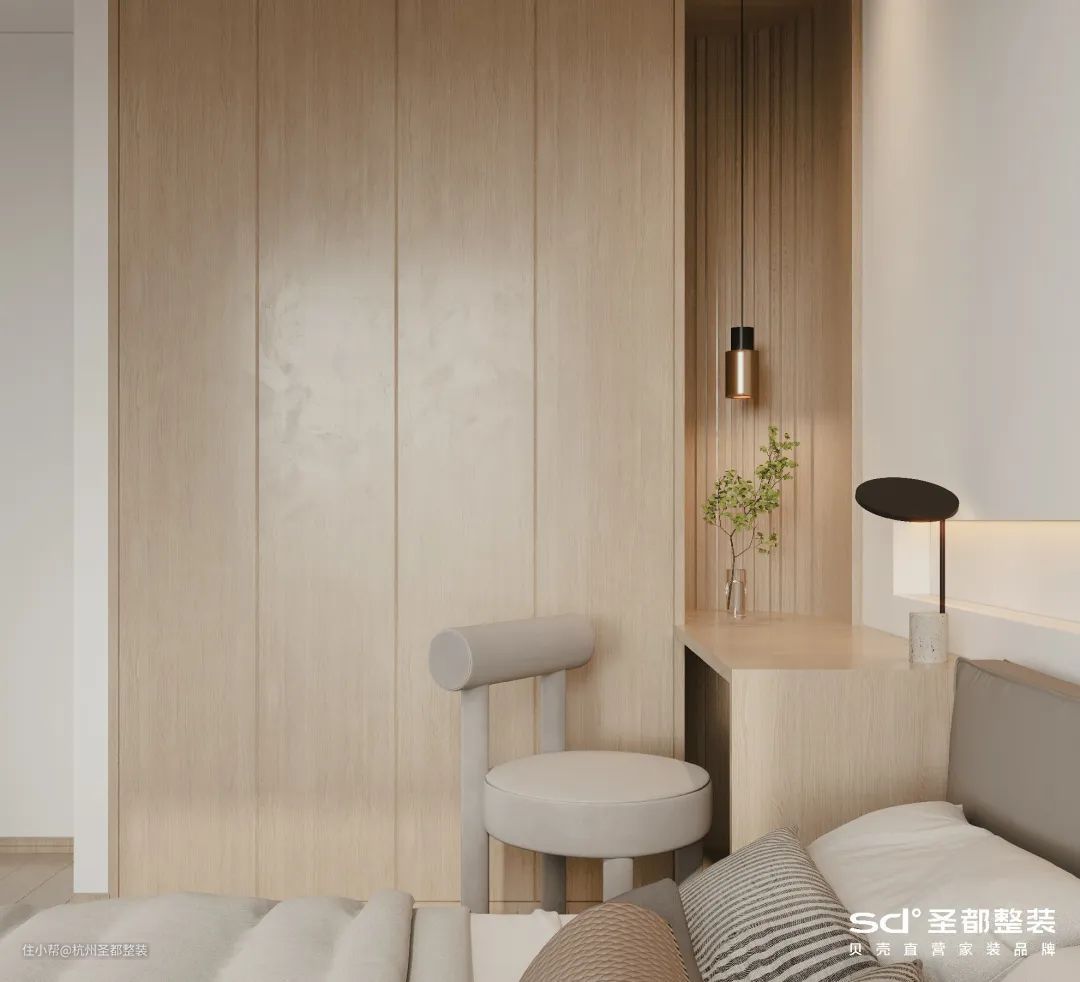 温润的木地板,与柔软的床品形成视觉的统一,空间质感瞬间提升;整墙衣柜衍生出一方书桌,兼顾空间功能与收纳美学。