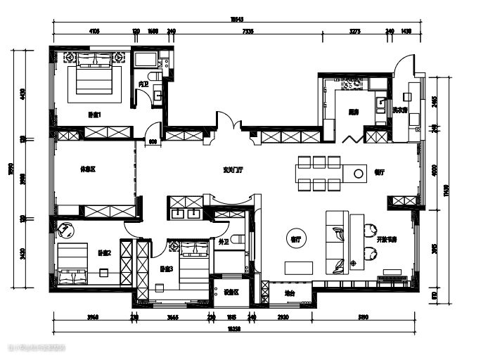 本案的居者是幸福的一家四口。他们来自东北朝鲜族,喜欢原木的质朴与清新,执着于“东北大炕”的实现。 ①整体动线按照“南动北静”来规划,衍生出一套优秀的生活动线。 ②客厅、餐厅、书房全打通,呈现出7米宽的大横厅。 ③规划了休闲地台,满足业主对“炕”的追求。