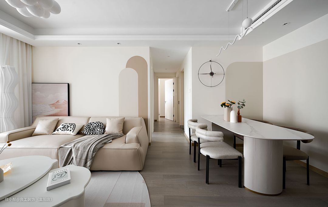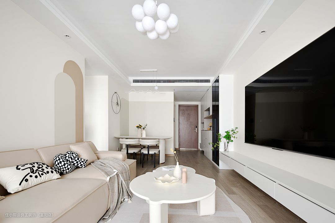 全屋摈弃精装房原本的大白墙,采用奶油色为基底,柔和的配色和细腻的质感散发出温馨的气息,令人仿佛置身于奶油芝士蛋糕的派对中,慵懒地享受于这份生活的美好。在空间形体的设计上,设计师非常巧妙地加入了曲线元素,让空间保持温馨宁静的同时,更有一丝高级曲线美学融入空间之中。所以我们会发现,圆润的弧形元素贯穿全屋,拱门隔断、墙面造境、圆形茶几、椭圆地毯等等,赋予空间别样温柔韵味。在空间结构的处理上,我们将原本封闭的阳台打通,让整体空间的视野与通风达到最优的效果。当阳台与客厅融为一体,空间的深度与采光的广度都得以提升,在自由流转的光影里,客厅的休闲气氛与会客功能也得以自由转换。仅以艺术涂料为漆面的电视背景墙简净雅致,一旁的餐边柜以米白木柜与黑玻打造而成,配色上与电视墙形成呼应,形成了连贯视觉,巧妙延展了空间感。