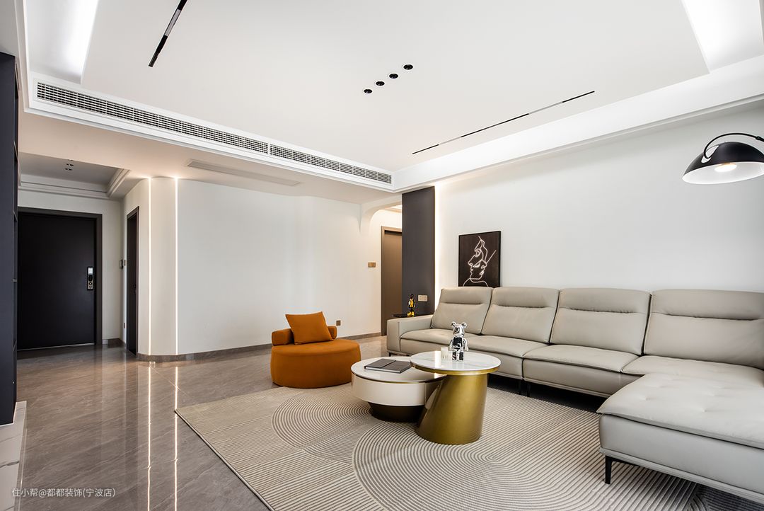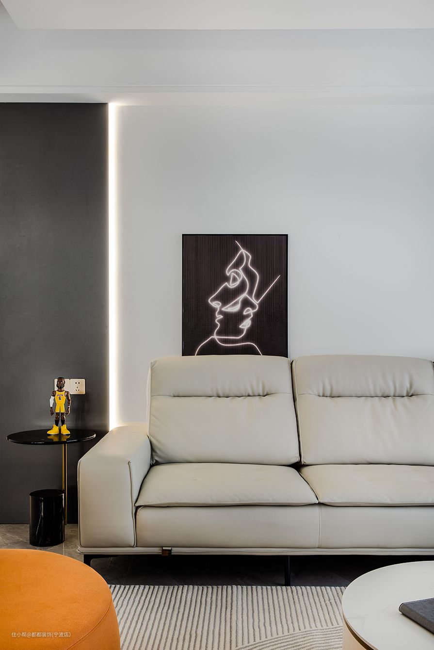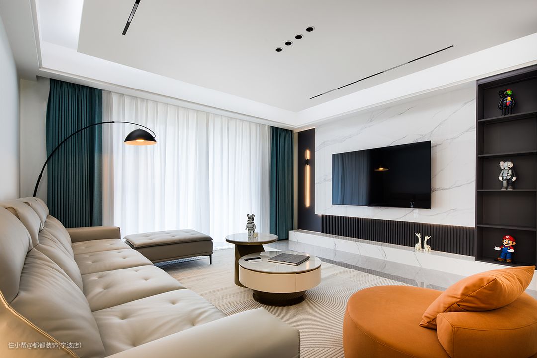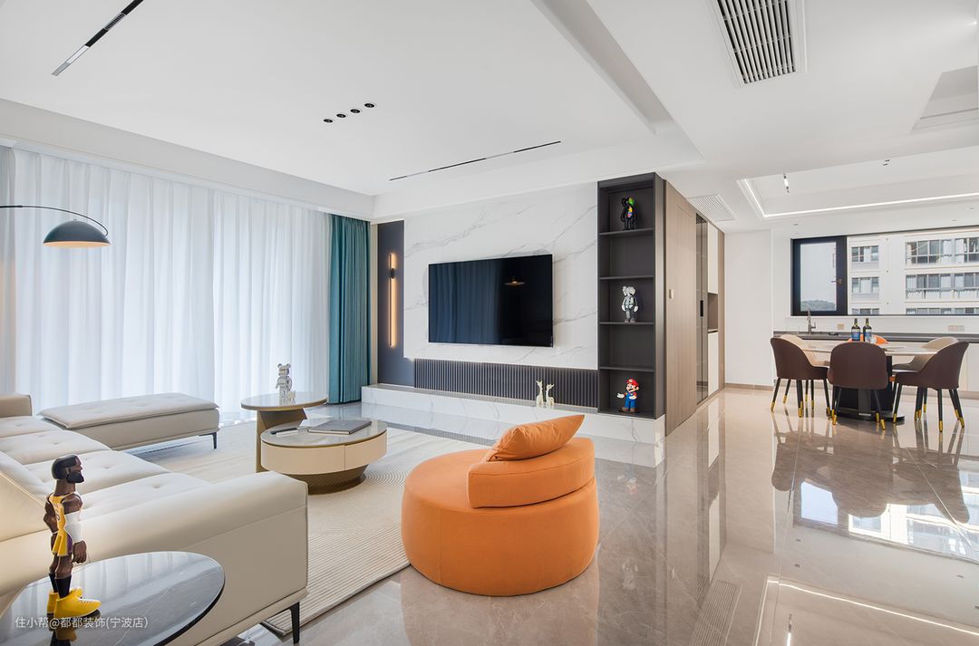 一来到业主家就能看到线条流畅的隔墙,相比于尖锐的转角细节带来更多的美观度和安全性,线条舒展中也印刻出设计师对细节的极致追求,玄关柜中空部位是浅灰色的木调,优雅大方,且易于日常打理,小象托盘摆件给空间增添艺术美感。 客厅有优质的采光,光线加上各种细致的大理石肌理和木饰面纹路,给人优雅舒适的韵味,大胆的使用鲜亮的橙色点缀,让这个空间活力满满,纯白色加上木饰面有强烈的反差,各种颜色张弛有度,简单而又纯粹。 由于客厅布局是T字型并且面积空间较大,设计师将其划分成几个功能区:玄关区、休闲区、餐厅区,线性灯中穿插着射灯,夜晚时,整个家的光影效果更加丰富。 设计师在电视墙中设计了开放书柜,满足了卡通摆件的收纳和展示需求,同时摆件本身也成为客厅最具特色的装饰,左侧黑色背景下的暖黄色线性灯奠定了整个空间现代的潮流气质。 会客区以浅色为基调,游走在米白色之间的真皮沙发为业主带来舒适放松的坐感,茶几台面更是创造性地加入了瓷砖和高低台的设计,浑然一体的设计更加突出开放式布局的敞亮大气。 光源是一个家的灵魂,忙了一天回到家,洗完澡窝在沙发,打开氛围灯只享受属于自己的这一刻,整个休息空间则做了减法,在转角处饰以暖光钓鱼灯,配合着人物轮廓的装饰画,温馨、神秘的气息悄无声息地沁入空气中。
