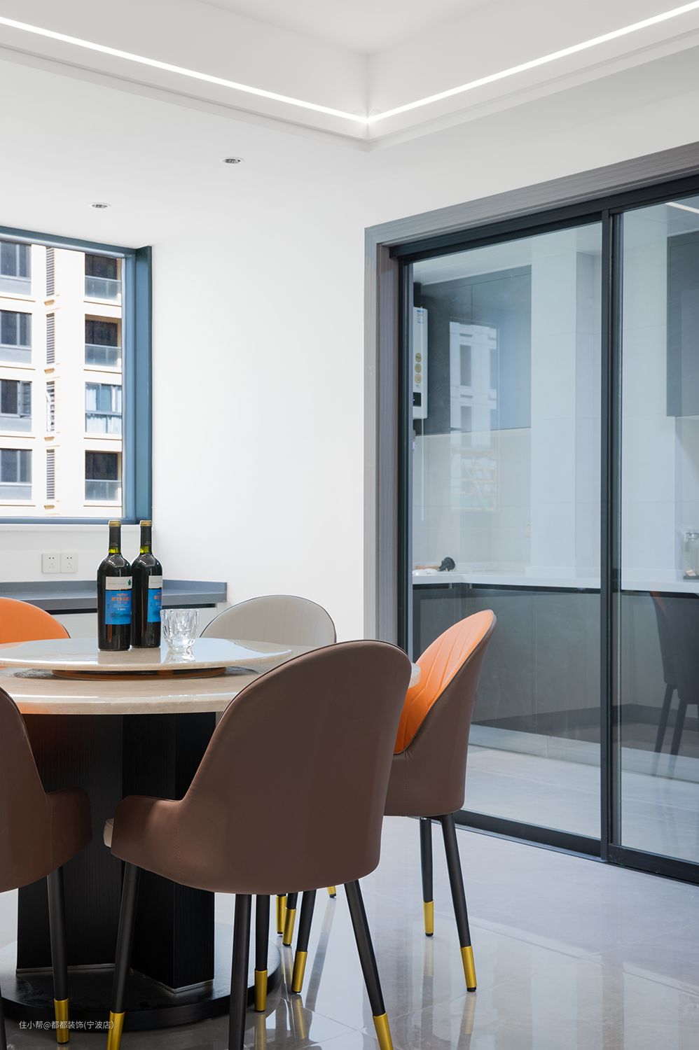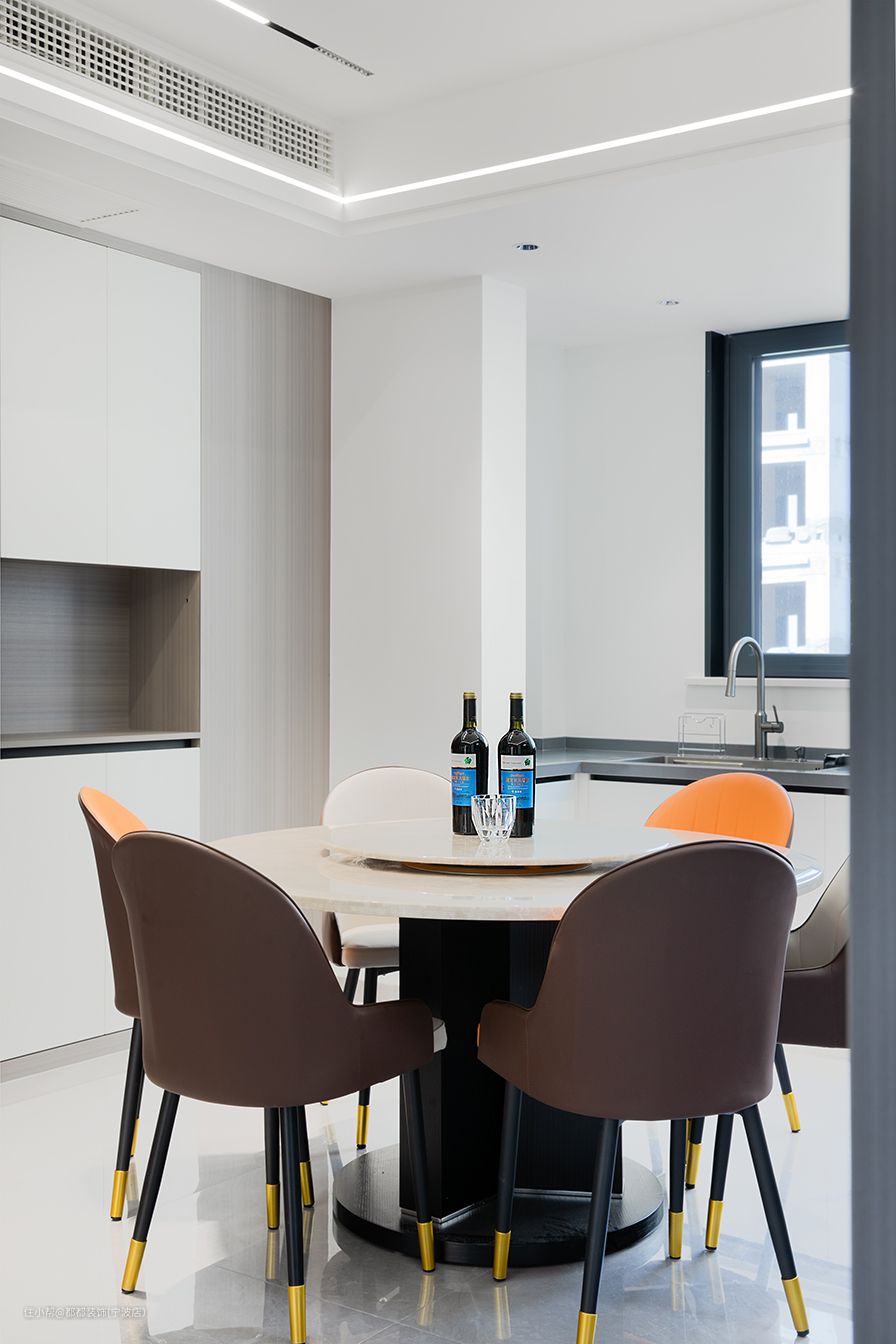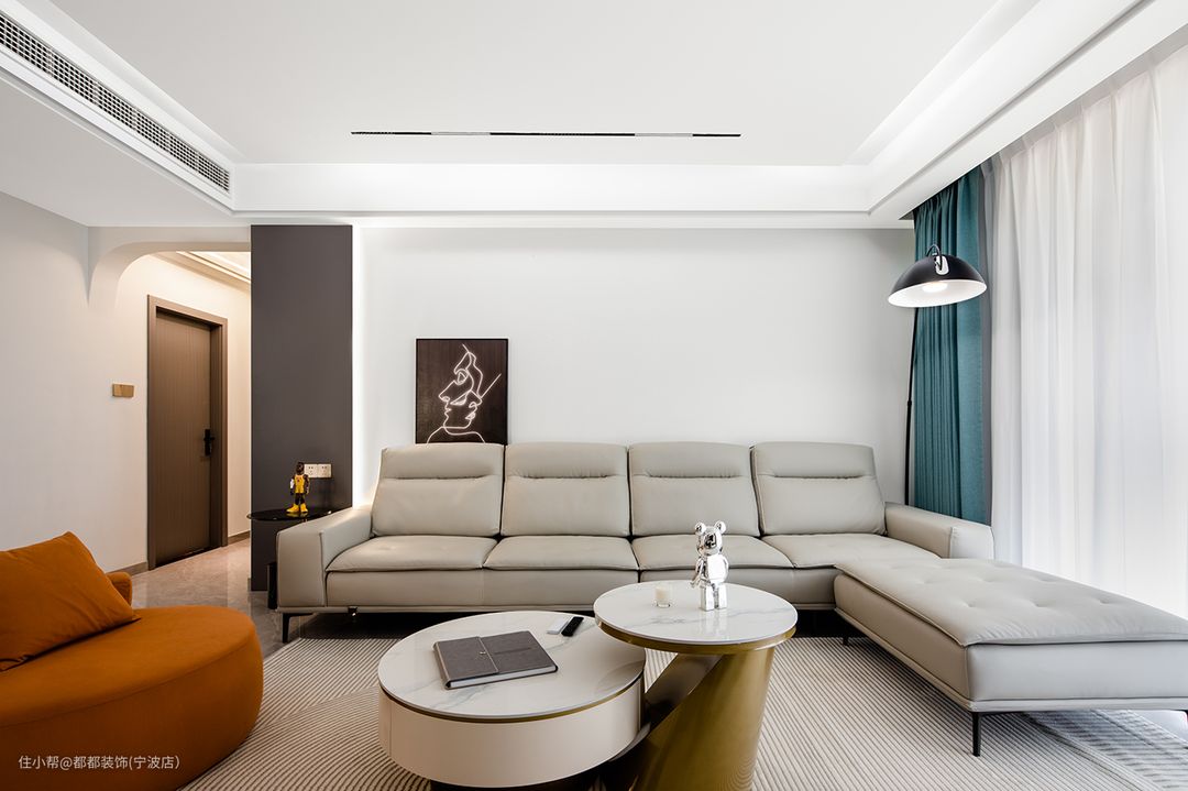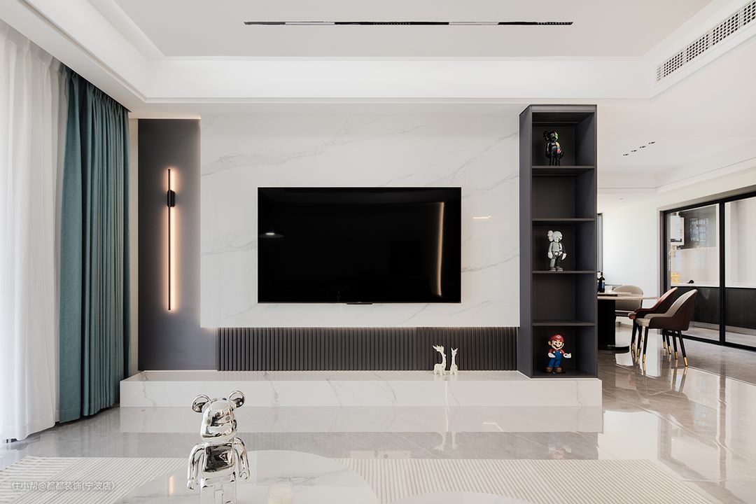 一来到业主家就能看到线条流畅的隔墙,相比于尖锐的转角细节带来更多的美观度和安全性,线条舒展中也印刻出设计师对细节的极致追求,玄关柜中空部位是浅灰色的木调,优雅大方,且易于日常打理,小象托盘摆件给空间增添艺术美感。 客厅有优质的采光,光线加上各种细致的大理石肌理和木饰面纹路,给人优雅舒适的韵味,大胆的使用鲜亮的橙色点缀,让这个空间活力满满,纯白色加上木饰面有强烈的反差,各种颜色张弛有度,简单而又纯粹。 由于客厅布局是T字型并且面积空间较大,设计师将其划分成几个功能区:玄关区、休闲区、餐厅区,线性灯中穿插着射灯,夜晚时,整个家的光影效果更加丰富。 设计师在电视墙中设计了开放书柜,满足了卡通摆件的收纳和展示需求,同时摆件本身也成为客厅最具特色的装饰,左侧黑色背景下的暖黄色线性灯奠定了整个空间现代的潮流气质。 会客区以浅色为基调,游走在米白色之间的真皮沙发为业主带来舒适放松的坐感,茶几台面更是创造性地加入了瓷砖和高低台的设计,浑然一体的设计更加突出开放式布局的敞亮大气。 光源是一个家的灵魂,忙了一天回到家,洗完澡窝在沙发,打开氛围灯只享受属于自己的这一刻,整个休息空间则做了减法,在转角处饰以暖光钓鱼灯,配合着人物轮廓的装饰画,温馨、神秘的气息悄无声息地沁入空气中。