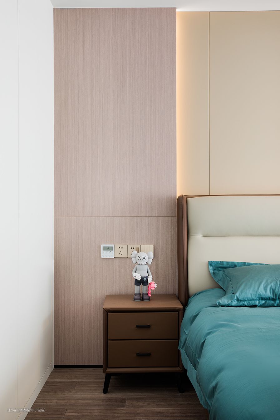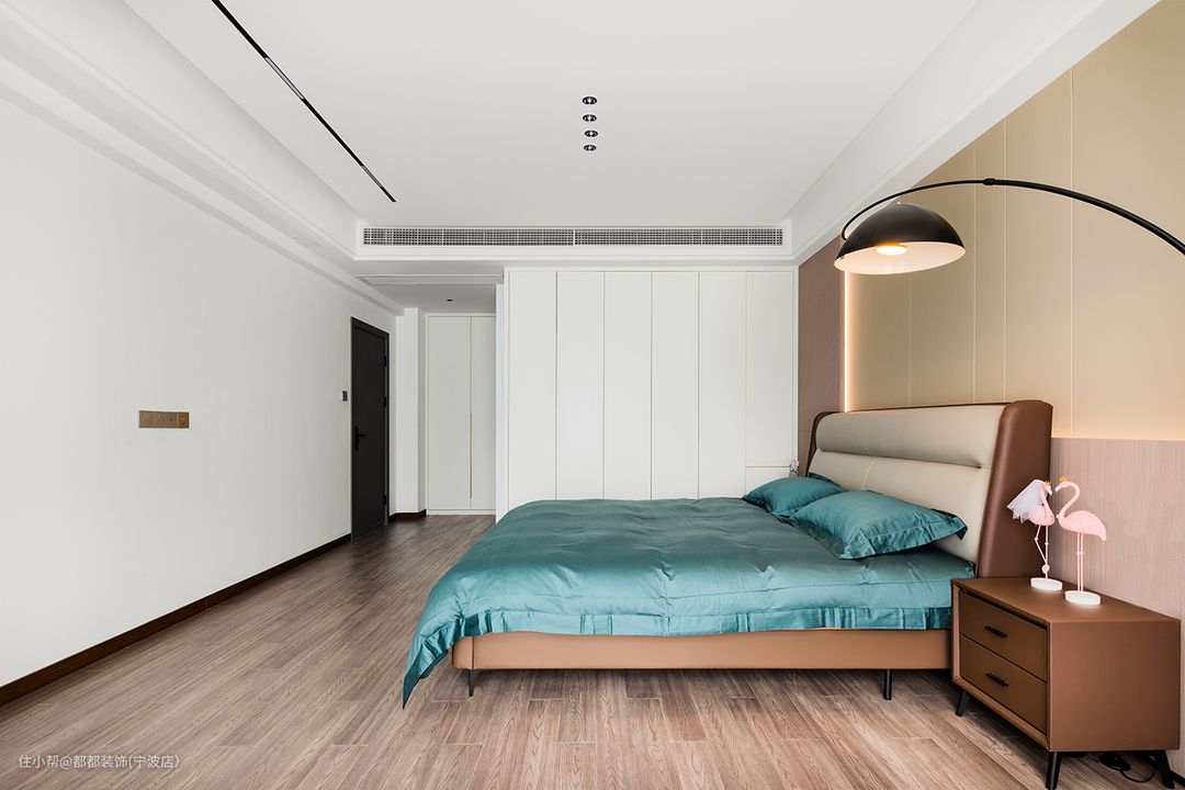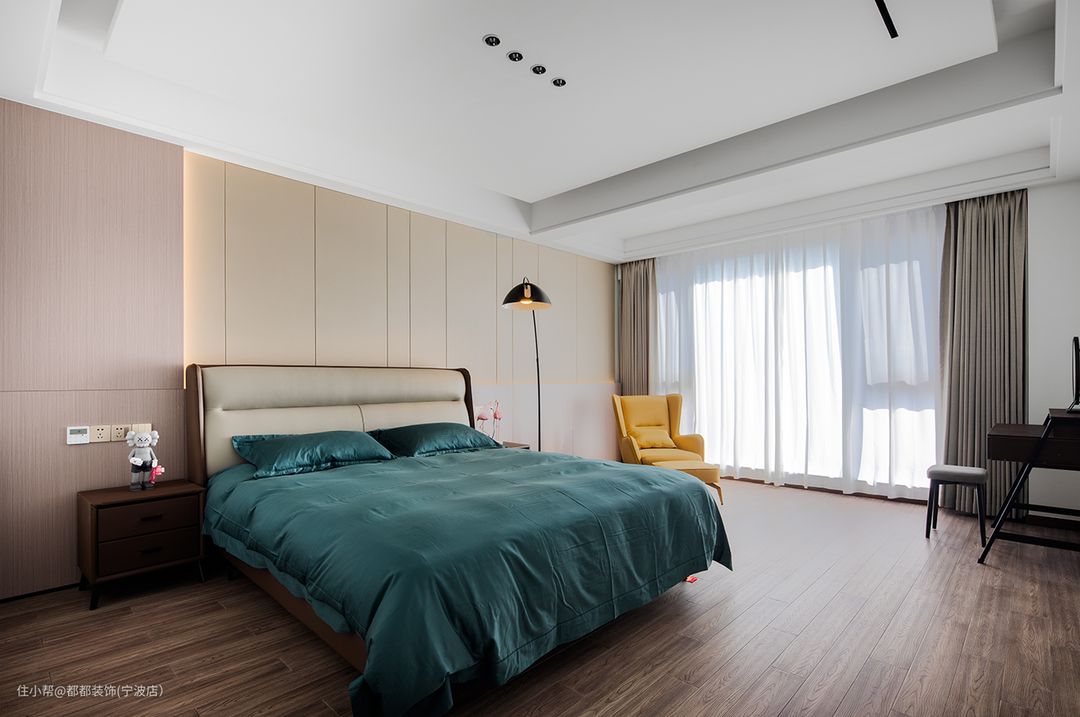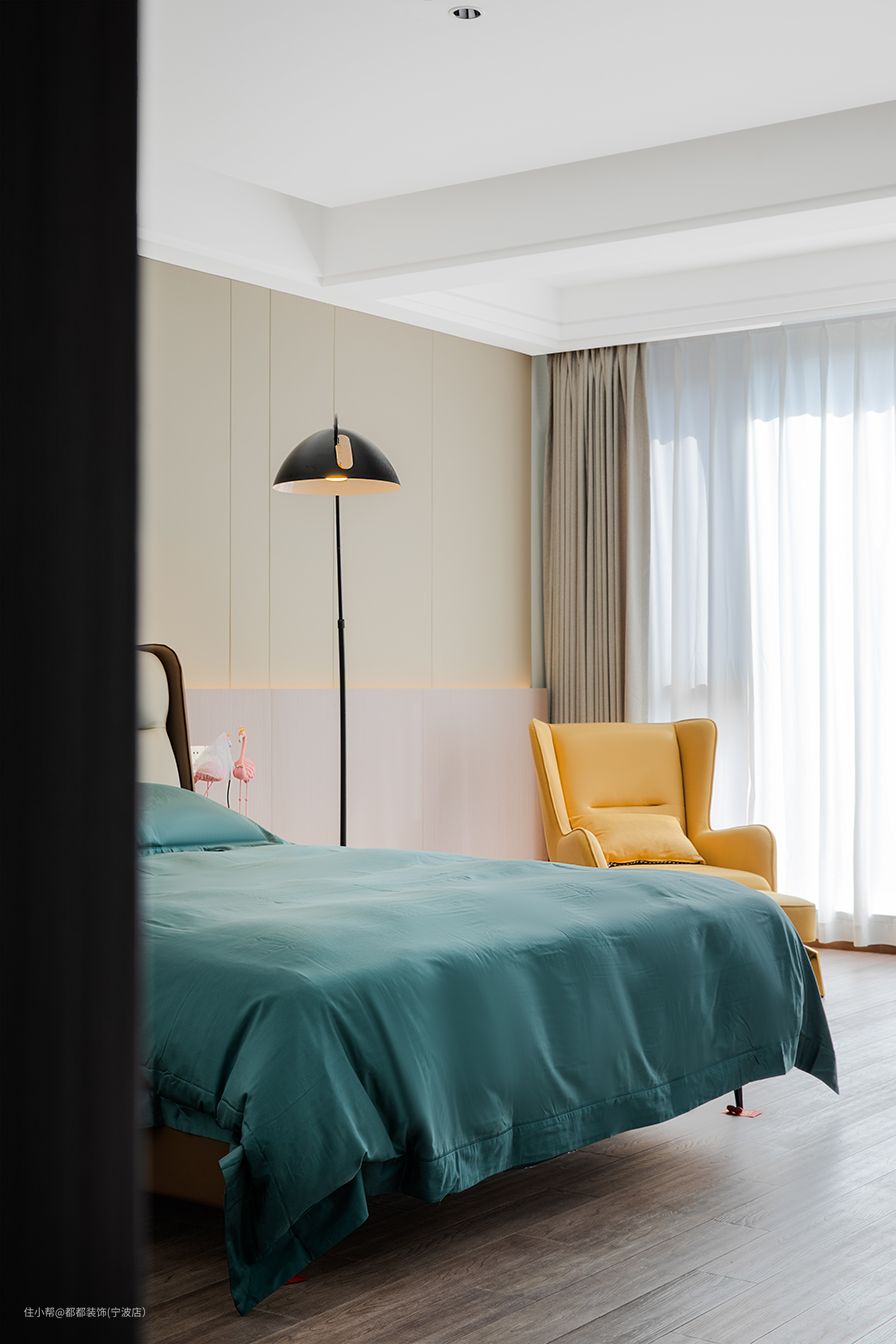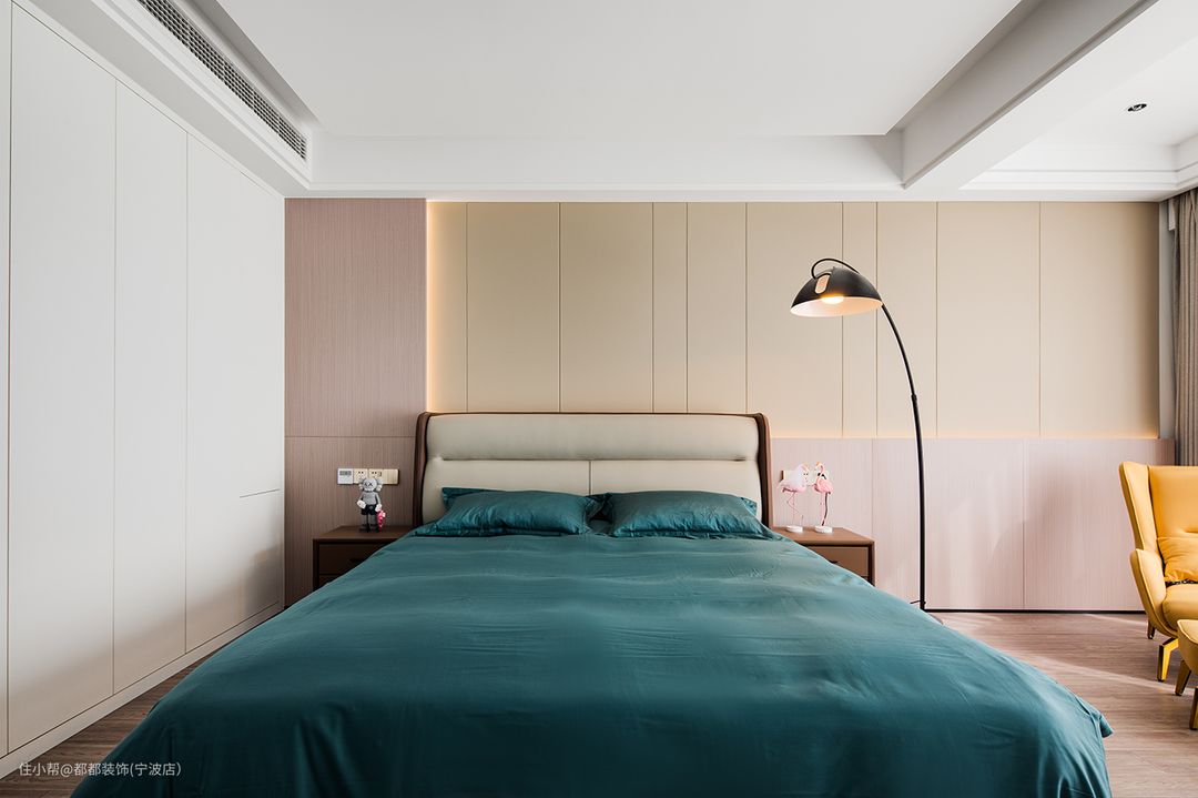 设计师将柠檬黄+复古绿的撞色理念融入主卧套房的设计中,颜色之间碰撞出的魅力会让人觉得很奇妙,还有一种油画般的质感,黄色、绿色是夏日最常见的原野配色,田园气息超浓,随时都能体会到夏日时刻的一抹闲暇与随性。 床头采用木饰面作为背景和软包床头板设计,为业主带来满满的安全感和舒适感,钓鱼灯映射出的一道微光,在清爽的卧室内氤氲成一束柔光,开启一室的浪漫。
