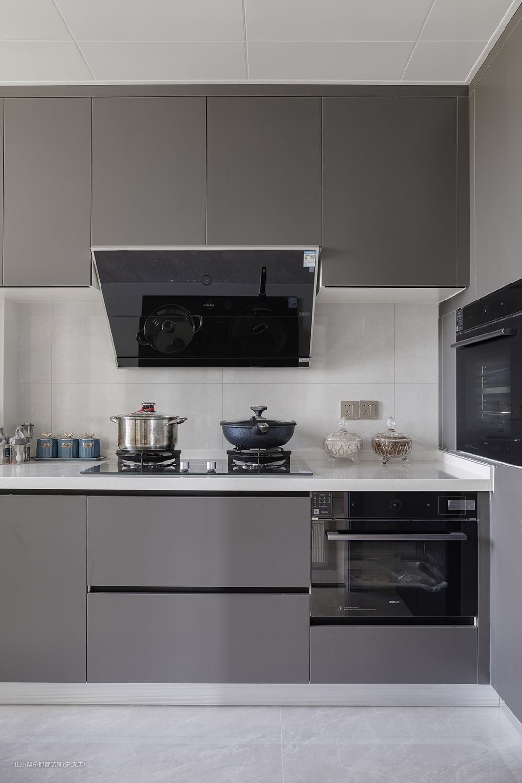 现代感十足的厨房配色选择了干净百搭的白、灰色,与地面瓷砖随性的纹理放在一起丝毫不显违和,厨房面积虽然不大,各种电器有序的布局却显得画面干净利落,L型宽大的操作台面让洗、切、炒的一连串动作一气呵成,让下厨变得更加有仪式感和幸福感。