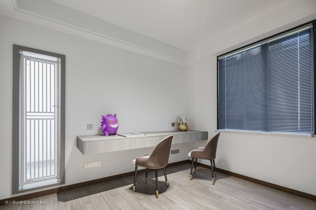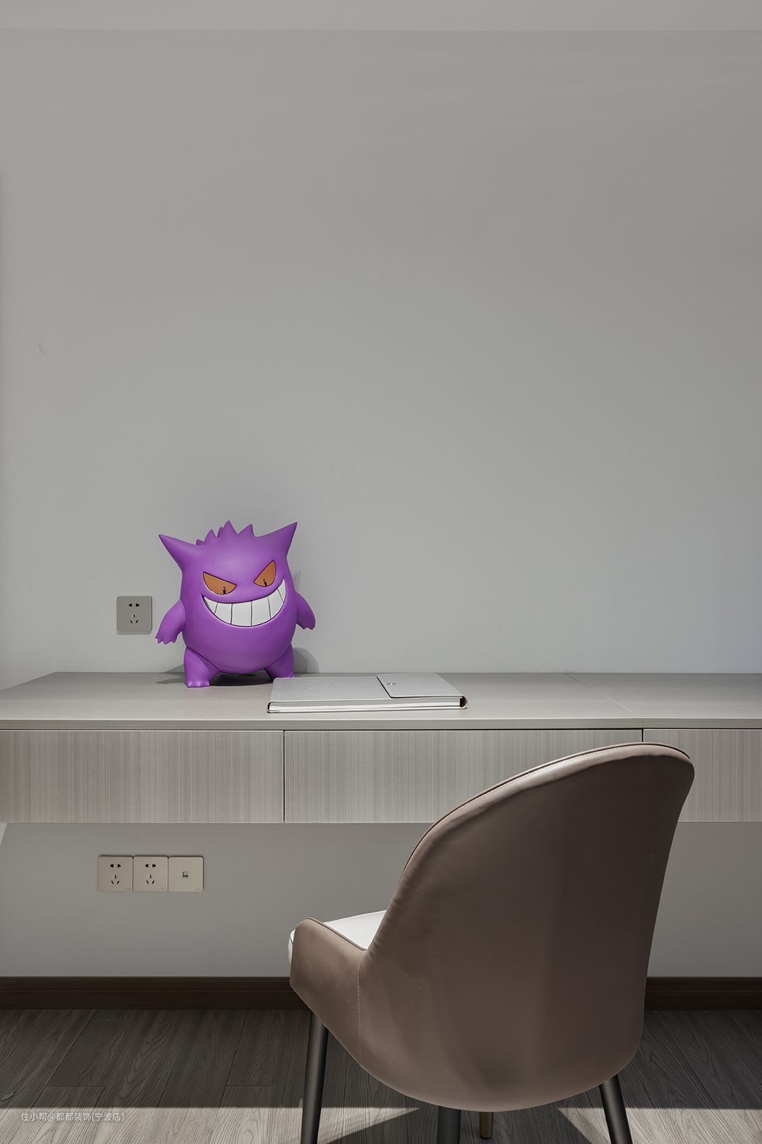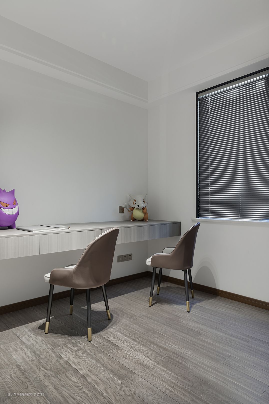 同主卧一样,书房地面依然是工字拼木纹砖,天然的原木纹理和质感激发出书房的自然生命力,浅咖色诠释着书房应有的文化气质,悬浮书桌简约大方,删繁就简,营造了安静的办公学习环境。 茶色玻璃门+嵌入式灯带,不管是作为书柜还是展示柜都高级又实用,柔和光源不刺眼,浅色调的空间带来了更多的舒适性,褪去都市的浮华,感受心灵的栖居。