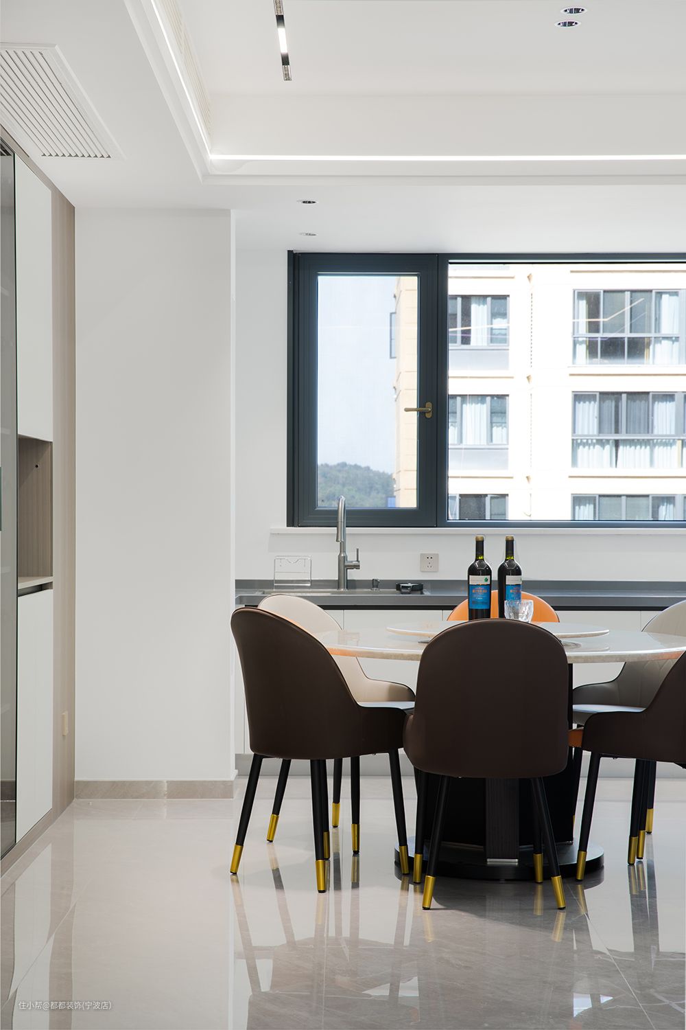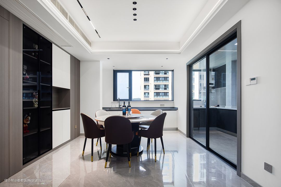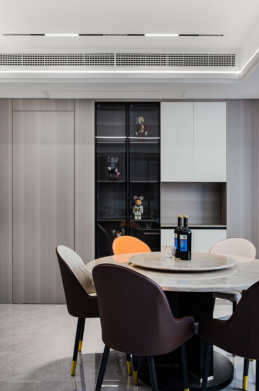 餐厅整体用米棕色桌椅来围合,塑造出了一个享用美食的温馨场景,觥筹交错透露着品质和追求,在这里,抬眼即可看到厨房里忙碌的家人身影,幸福触手可及。 餐厅左侧浅咖色背景墙搭配黑色玻璃展示柜,极简的线条勾勒出满满的生活品质感,各种样式的新潮摆件在灯光的映衬下,更显优雅和个性。