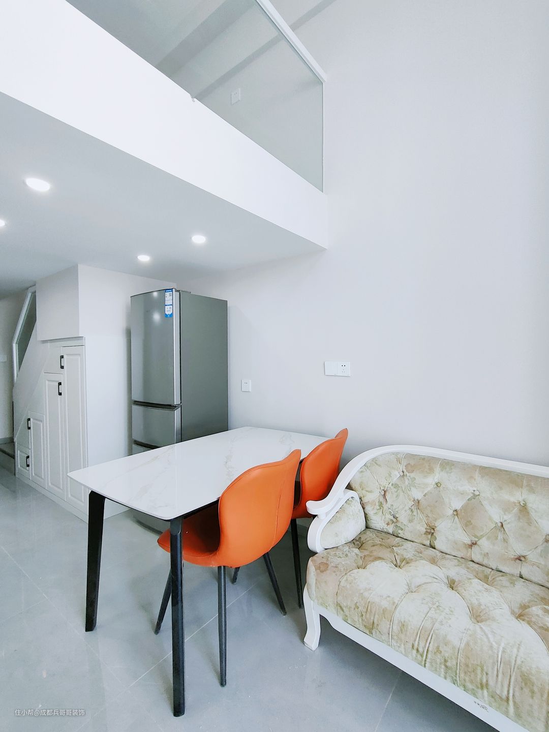 餐厅,是一个开放式的格局,旁边还放置了单开门的冰箱,家居设计简单明了。整体以简约白作为主色调,活力橙点缀空间,增加了一抹靓丽的色彩~