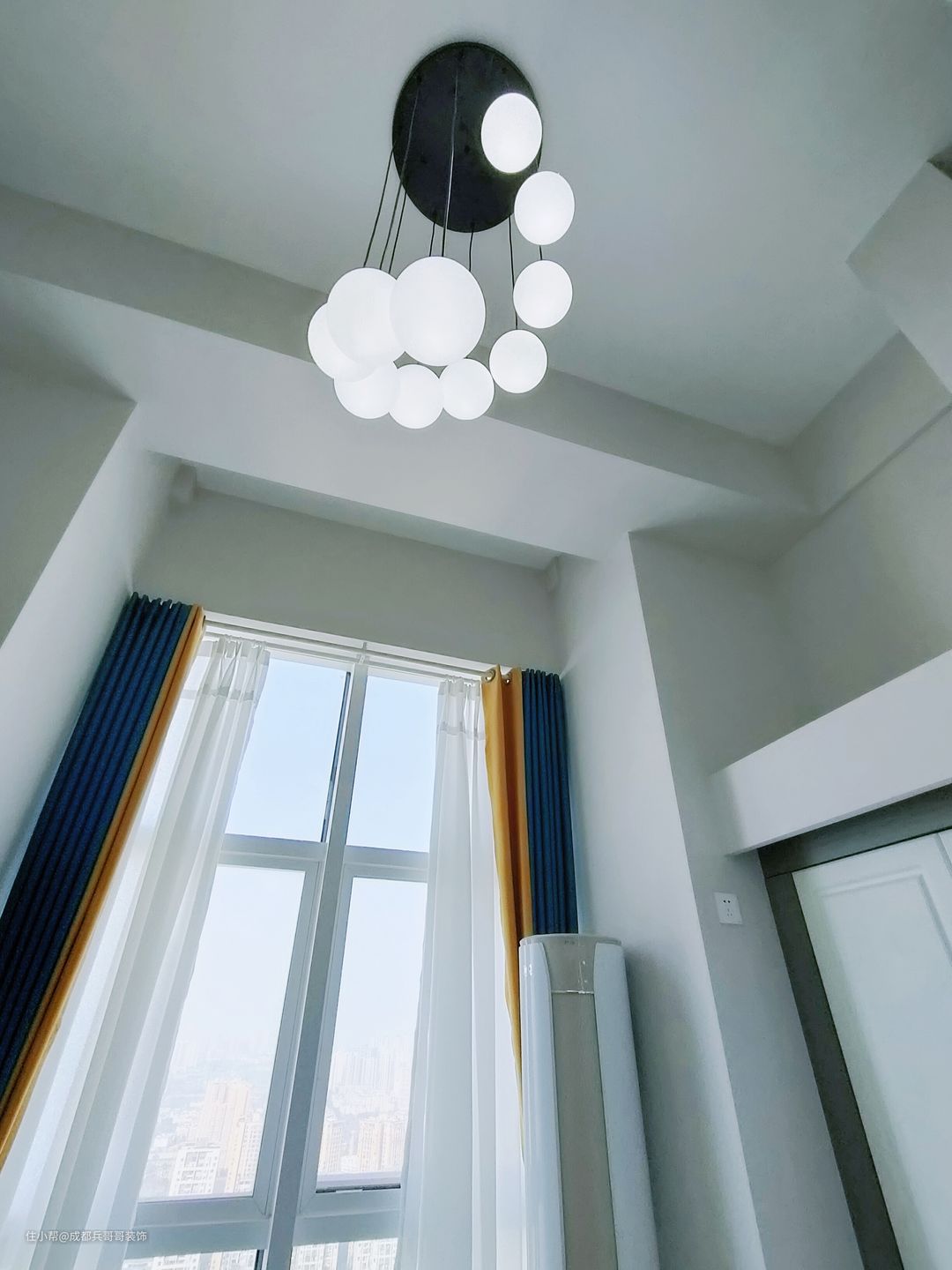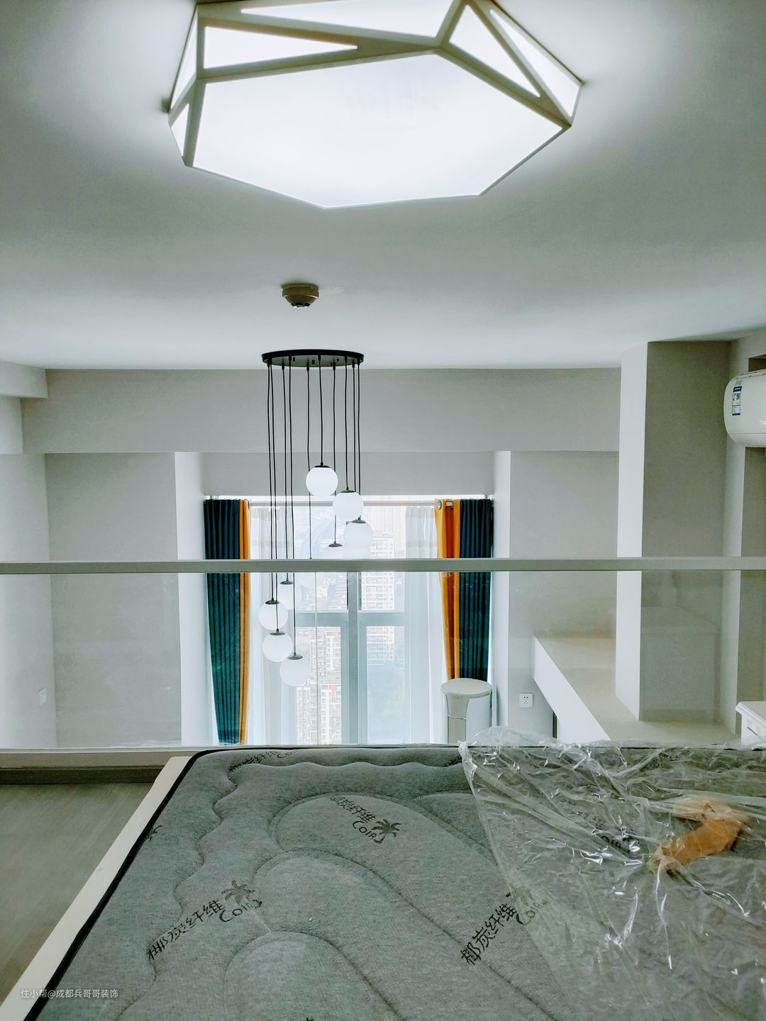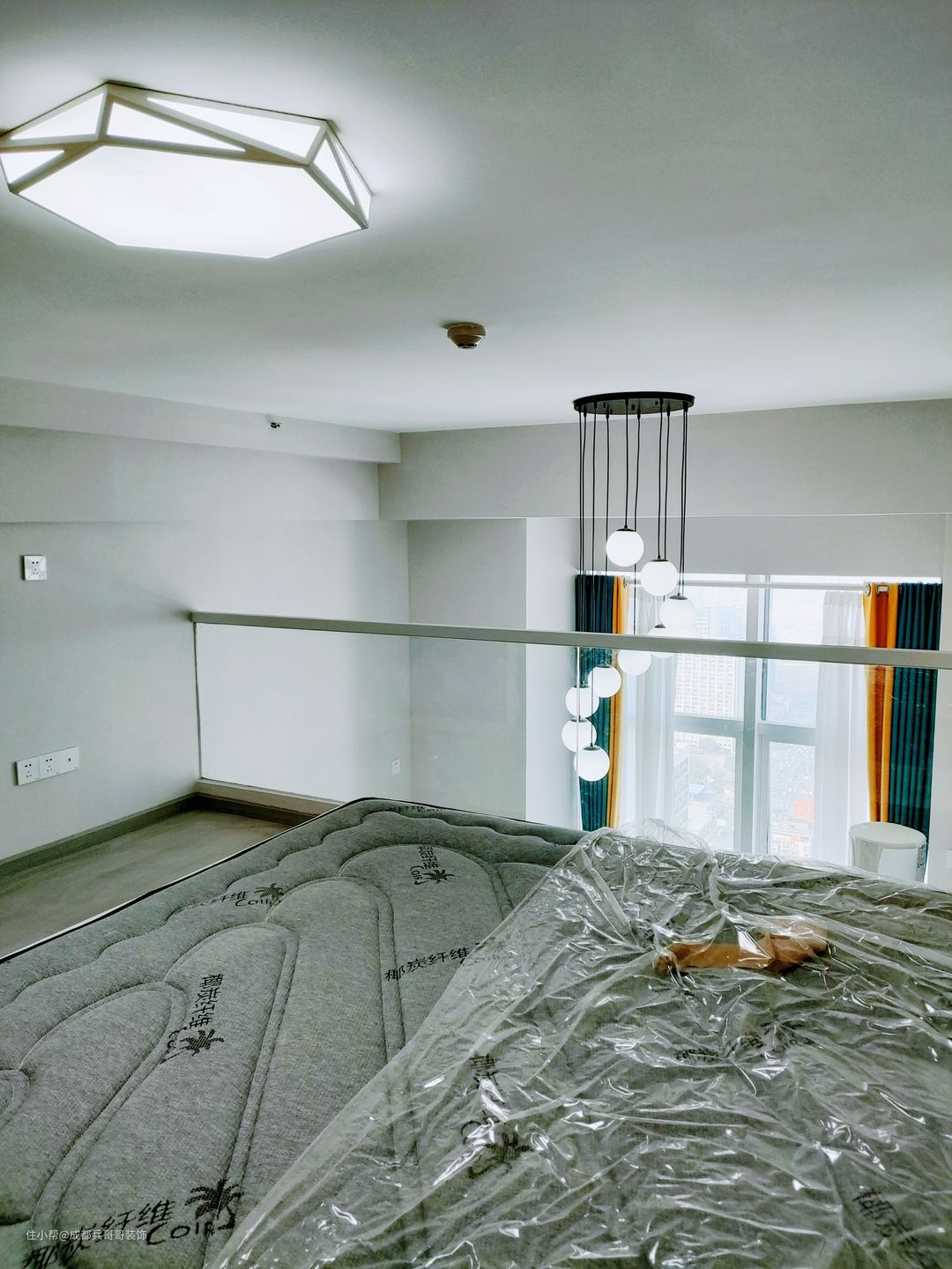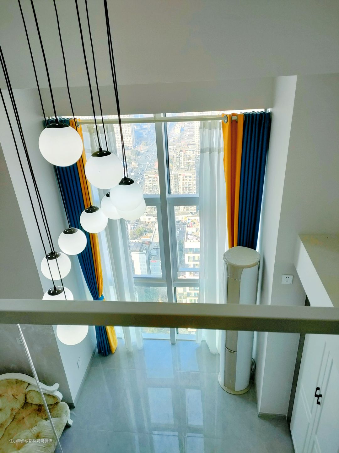 整个房间设计了4米多的挑空区,搭配创意灯饰,能很好地衬托室内的空间感。全景窗户做保留,再安装上窗帘,屋内的采光随时可以自由切换,生活舒适性又提高了不少~ 另外,从这里的镂空设计可以看到,4米2的房间层高隔出两层难免会有些压抑,这样的话可以有效降低底层高给视觉带来的压迫感,同时人在室内居住起来更顺心~