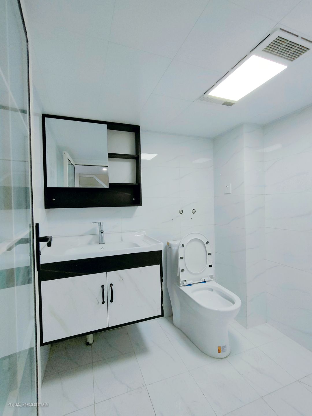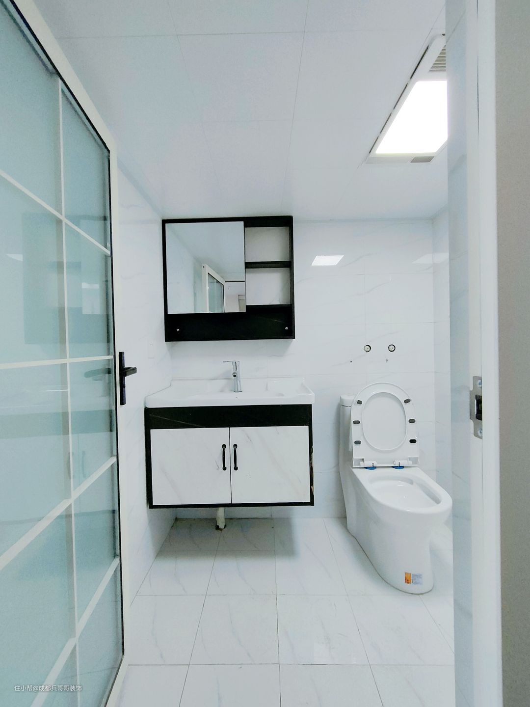 卫生间,独立空间设计,盥洗台、马桶区、淋浴区安排在一个空间,因为面积有限,但功能上是全部满足了,有效利用有效空间,超赞👍👍 地砖、墙砖通铺,铝扣板吊顶,防水是刷了两遍的,整体的防水防潮效果良好,这样生活起来也更舒适~
