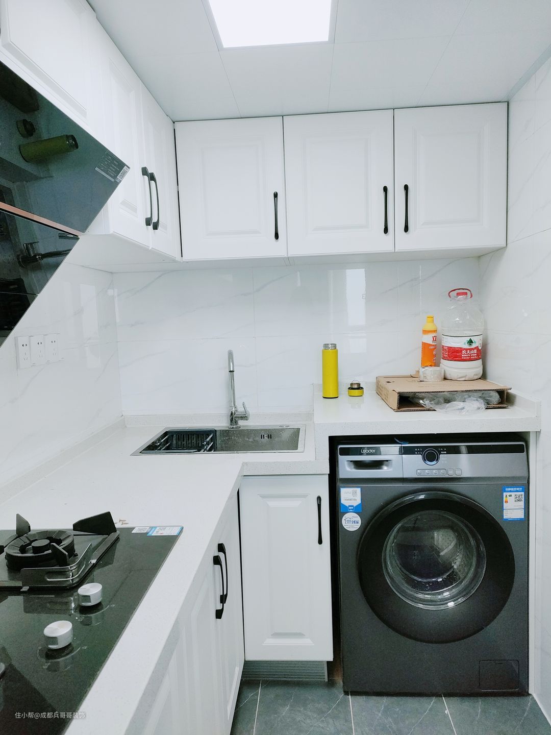 厨房,L形封闭式设计,有效避免油烟味,一整排的吊柜和地柜,储物空间足够。里面还嵌入了洗衣机,功能全面。选用侧吸式抽油烟机(油烟分离板,彻底解决了顶式烹调猛火炒菜油烟难清除的难题,采用油烟分离器使油烟机有效分离,增加的风机的使用寿命,并更有效的达到油烟抽净效果。) 另外,厨房地面用的是300*300的地砖,浅灰色格调,再搭配橱柜经典黑白色,简约干净。