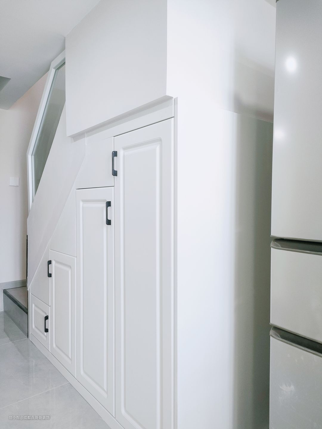 入户玄关,由于公寓面积有限,鞋柜设计在楼梯下方,满足日常收纳的同时,还能有效利用室内空间,一举两得~