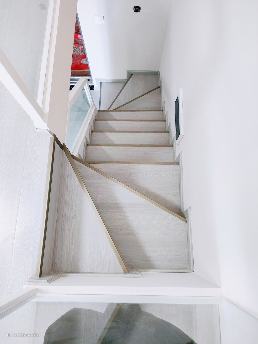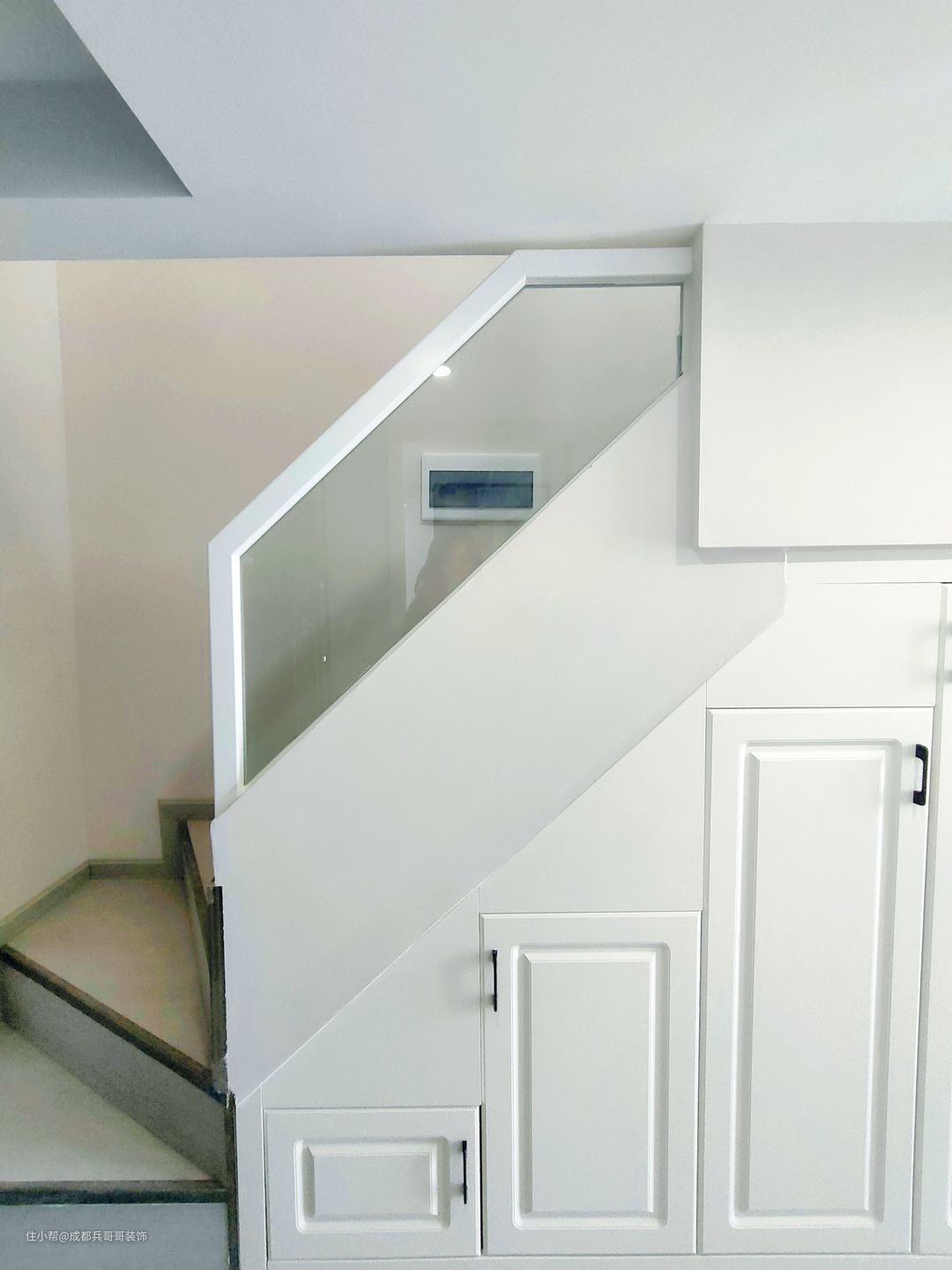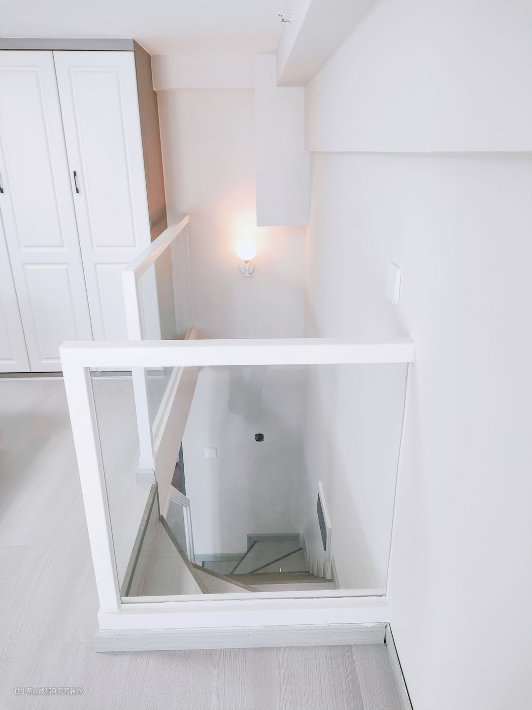 楼梯,设计在进门左侧,一字形楼梯连接一二楼,楼梯下方做了一整排储物柜,木地板踏步+实木玻璃扶手,简约大气又实用。 楼梯空间,还安装了壁灯,氛围感满分~~