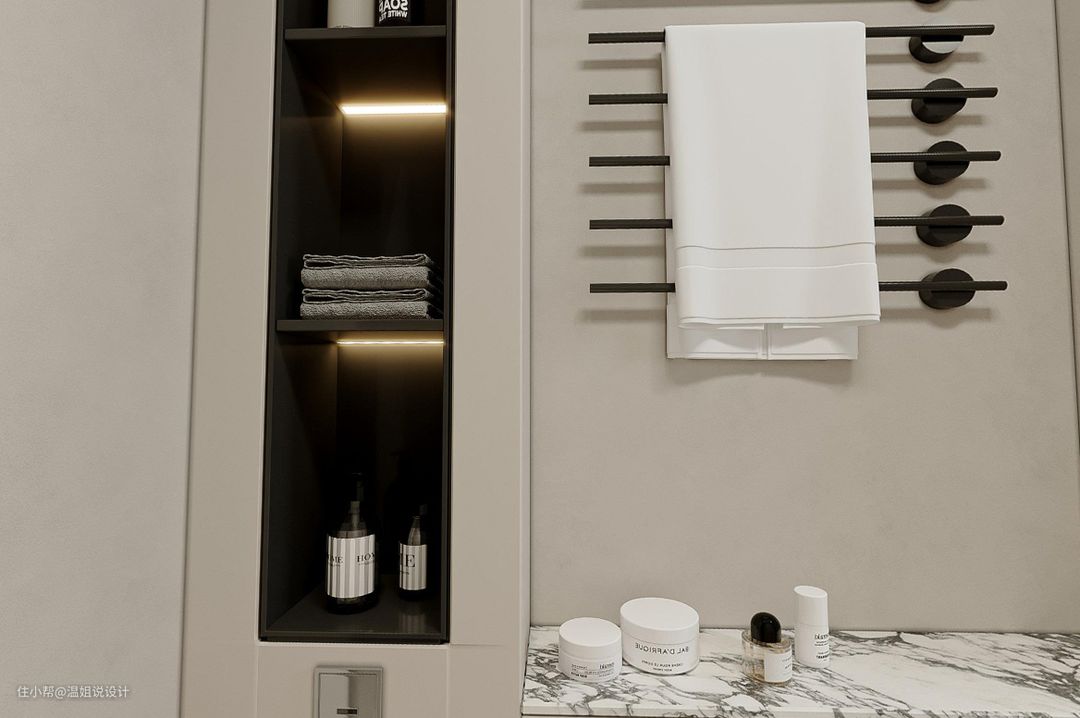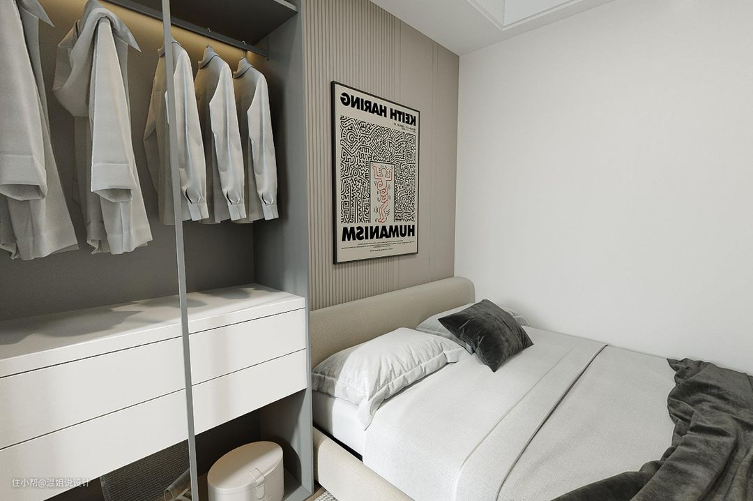 主卧是标准的卧室布局,在床头用简单的咖色乳胶漆配搭装饰挂画,侧边为卧室卫生间,在卫生间和卧室主体墙面上,根据墙面的尺寸,做了一面柜子,既起到起夜隔音的作用,又有装饰床边的作用,全屋都以黄色为主,氛围感在晚上关灯的时候就能体现出来,整体素雅又高级。