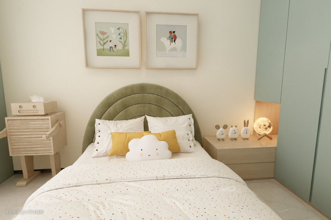 设计亮点: ☘️儿童房用蓝绿色的柜子,作为空间的主题色,展现儿童富有童真、有趣的一面 ☘️预留更多的活动空间给到儿童房,棒棒糖床增加空间的童趣