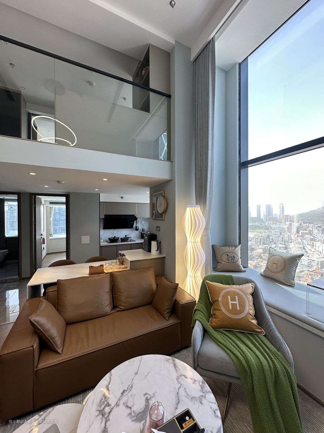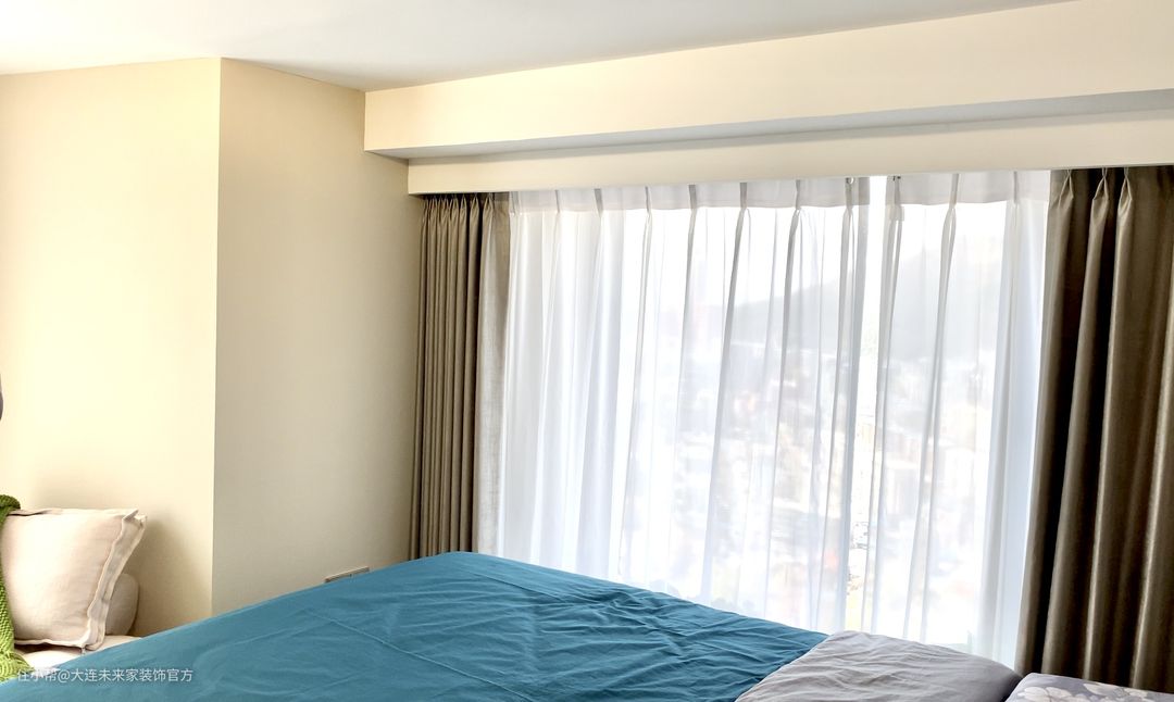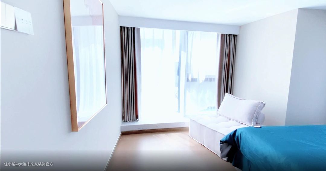 二楼主卧是两面环窗的设计,整个空间阳光充足且通透,采光非常好。小纱帘的设计,风吹过时更让空间有梦幻般的氛围感。窗边放置懒人沙发,作为业主的小小休闲之地的设计,拉开窗帘便是海景,使生活的幸福感大大提升。