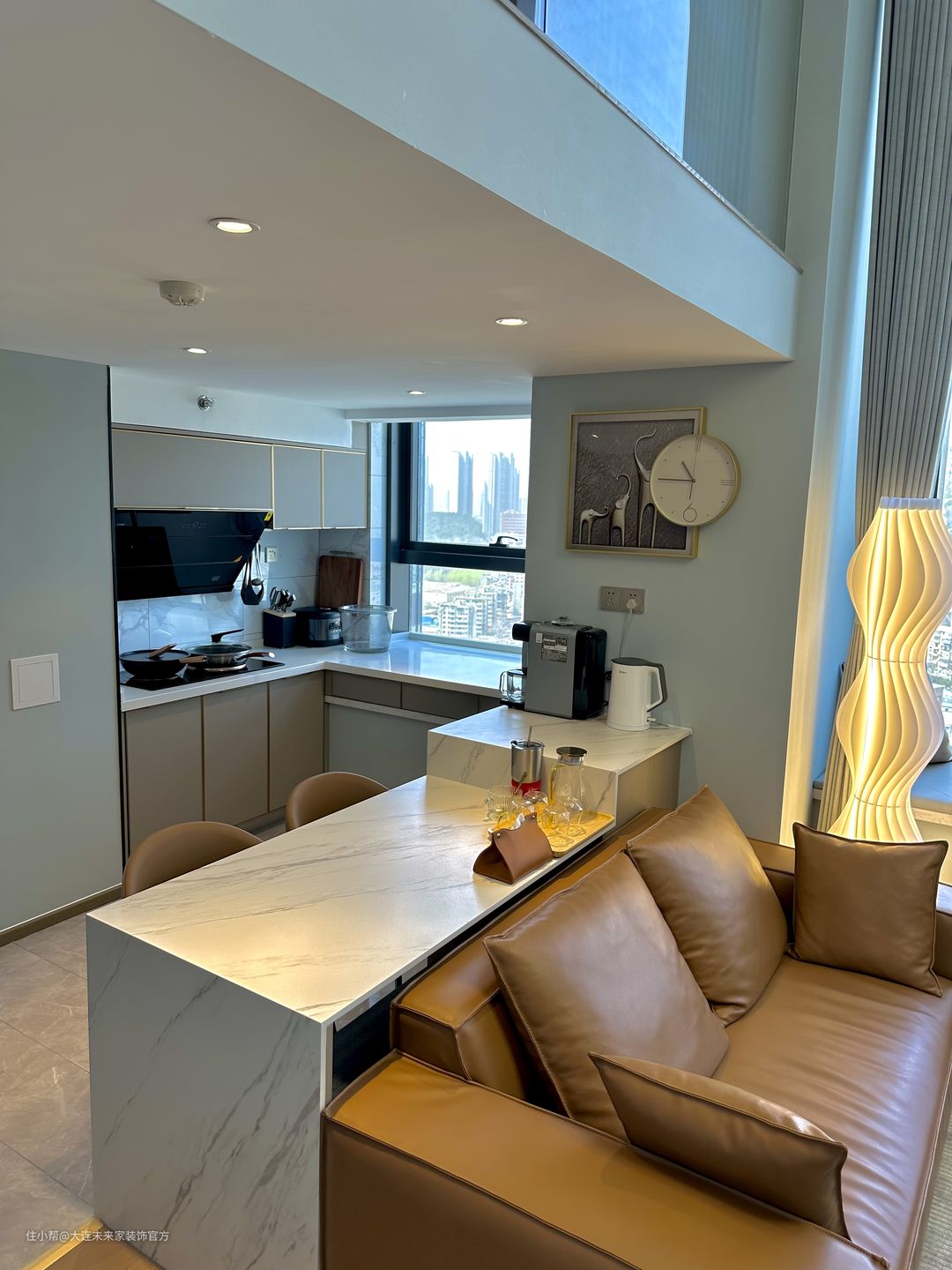餐桌的岛台设计,很好的衔接客厅和厨房,形成完美的交互空间。户型较小的房子做家电内嵌是节省空间的好办法,实用性与美观程度满分。