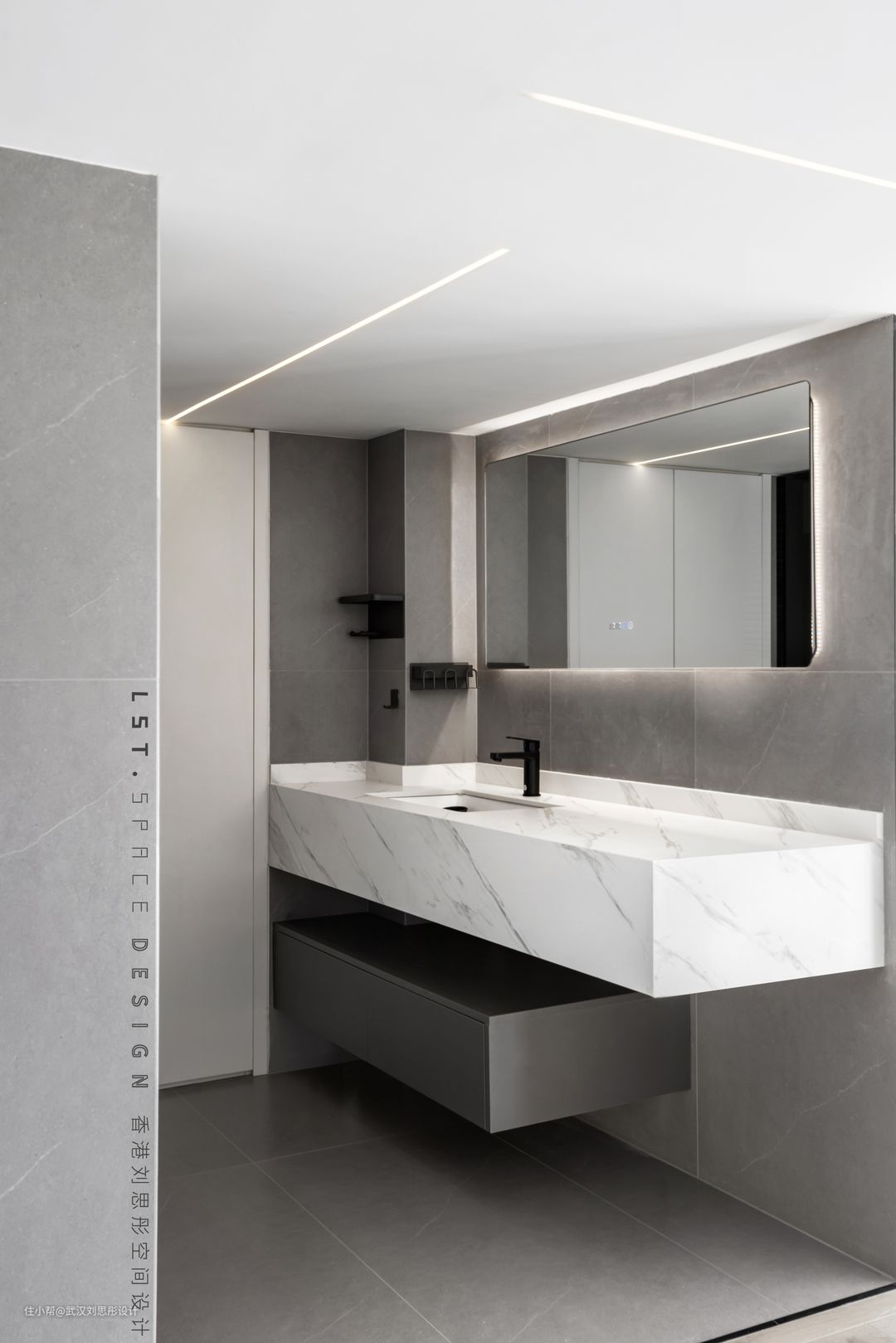 ✨浴缸区和干区都采用灰色瓷砖,墙地一体的整体感,搭配白色的浴缸和悬空浴室柜,呈现出静谧洁净的沐浴氛围。